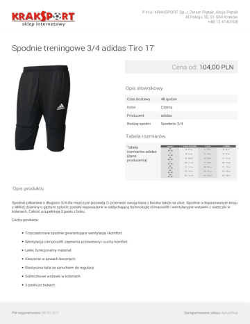 P.H.U. KRAKSPORT Sp.J. Zenon Piętak, Alicja Piętak Al.Pokoju 32, 31-564 Kraków +48 12 4140108 Spodnie treningowe 3/4 adidas Tiro 17 Cena od: 104,00 PLN Opis słownikowy Czas dostawy 48 godzin Kolor Czarny Producent adidas Rodzaj spodni Spodenki 3/4 Tabela rozmiarów Tabela rozmiarów adidas (dane producenta) Opis produktu Spodnie piłkarskie o długości 3/4 dla mężczyzn pozwolą Ci przenieść swoją klasę z boiska także na ulice. Spodnie o dopasowanym kroju z lekkiej dzianiny o gęstym splocie zostały wyposażone w oddychającą technologię climacool® i wentylacyjne wstawki z siateczki w kolanach. Całość uzupełniają 3 paski z boku. Cechy produktu: Trzyczęściowe spodnie gwarantujące wentylację i komfort. Wentylacja climacool® zapewnia przewiewny i suchy komfort. Lekki, funkcjonalny materiał. Kieszenie w szwach bocznych. Elastyczna talia ze sznurkiem do regulacji. Siateczkowe wstawki w kolanach. 3 paski po bokach. Plik wygenerowano: 08-03-2017 Oprogramowanie sklepu: AptusShop P.H.U. KRAKSPORT Sp.J. Zenon Piętak, Alicja Piętak Al.Pokoju 32, 31-564 Kraków +48 12 4140108 Materiał: 100% poliester. Warianty produktu Plik wygenerowano: 08-03-2017 XS 104,00 PLN S 104,00 PLN M 104,00 PLN L 104,00 PLN XL 104,00 PLN XXL 104,00 PLN Oprogramowanie sklepu: AptusShop P.H.U. KRAKSPORT Sp.J. Zenon Piętak, Alicja Piętak Al.Pokoju 32, 31-564 Kraków +48 12 4140108 Galeria Plik wygenerowano: 08-03-2017 Powered by TCPDF (www.tcpdf.org) Oprogramowanie sklepu: AptusShop