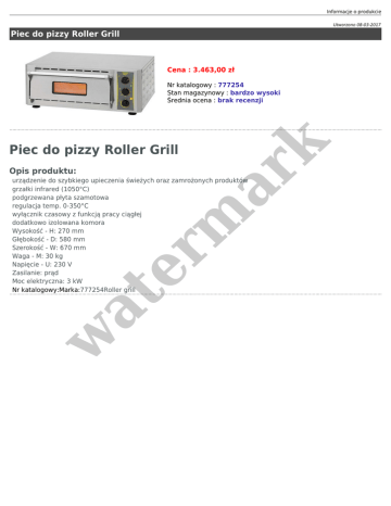 Informacje o produkcie Utworzono 08-03-2017 Piec do pizzy Roller Grill Cena : 3.463,00 zł er m ar k Nr katalogowy : 777254 Stan magazynowy : bardzo wysoki Średnia ocena : brak recenzji Piec do pizzy Roller Grill Opis produktu: w at urządzenie do szybkiego upieczenia świeżych oraz zamrożonych produktów grzałki infrared (1050°C) podgrzewana płyta szamotowa regulacja temp. 0-350°C wyłącznik czasowy z funkcją pracy ciągłej dodatkowo izolowana komora Wysokość - H: 270 mm Głębokość - D: 580 mm Szerokość - W: 670 mm Waga - M: 30 kg Napięcie - U: 230 V Zasilanie: prąd Moc elektryczna: 3 kW Nr katalogowy:Marka:777254Roller grill