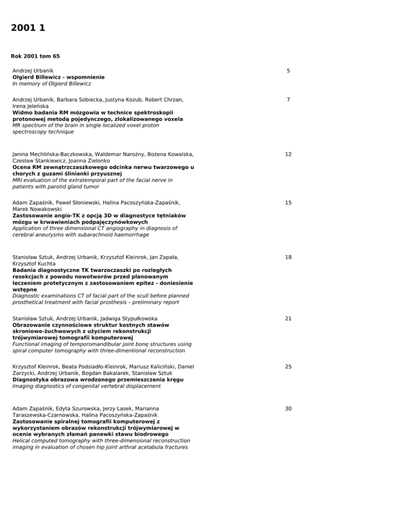 2001 1 Rok 2001 tom 65 Andrzej Urbanik Olgierd Billewicz - wspomnienie In memory of Olgierd Billewicz 5 Andrzej Urbanik, Barbara Sobiecka, Justyna Kozub, Robert Chrzan, Irena Jeleńska Widmo badania RM mózgowia w technice spektroskopii protonowej metodą pojedynczego, zlokalizowanego voxela MR spectrum of the brain in single localized voxel proton spectroscopy technique 7 Janina Mechlińska-Baczkowska, Waldemar Narożny, Bożena Kowalska, Czesław Stankiewicz, Joanna Zielonko Ocena RM zewnątrzczaszkowego odcinka nerwu twarzowego u chorych z guzami ślinianki przyusznej MRI evaluation of the extratemporal part of the facial nerve in patients with parotid gland tumor 12 Adam Zapaśnik, Paweł Słoniewski, Halina Pacoszyńska-Zapaśnik, Marek Nowakowski Zastosowanie angio-TK z opcją 3D w diagnostyce tętniaków mózgu w krwawieniach podpajęczynówkowych Application of three dimensional CT angiography in diagnosis of cerebral aneurysms with subarachnoid haemorrhage 15 Stanisław Sztuk, Andrzej Urbanik, Krzysztof Kleinrok, Jan Zapała, Krzysztof Kuchta Badania diagnostyczne TK twarzoczaszki po rozległych resekcjach z powodu nowotworów przed planowanym leczeniem protetycznym z zastosowaniem epitez - doniesienie wstępne Diagnostic examinations CT of facial part of the scull before planned prosthetical treatment with facial prosthesis – preliminary report 18 Stanisław Sztuk, Andrzej Urbanik, Jadwiga Stypułkowska Obrazowanie czynnościowe struktur kostnych stawów skroniowo-żuchwowych z użyciem rekonstrukcji trójwymiarowej tomografii komputerowej Functional imaging of temporomandibular joint bonę structures using spiral computer tomography with three-dimentional reconstruction 21 Krzysztof Kleinrok, Beata Podsiadło-Kleinrok, Mariusz Kaliciński, Daniel Zarzycki, Andrzej Urbanik, Bogdan Bakalarek, Stanisław Sztuk Diagnostyka obrazowa wrodzonego przemieszczenia kręgu Imaging diagnostics of congenital vertebral displacement 25 Adam Zapaśnik, Edyta Szurowska, Jerzy Lasek, Marianna Taraszewska-Czarnowska, Halina Pacoszyńska-Zapaśnik Zastosowanie spiralnej tomografii komputerowej z wykorzystaniem obrazów rekonstrukcji trójwymiarowej w ocenie wybranych złamań panewki stawu biodrowego Helical computed tomography with three-dimensional reconstruction imaging in evaluation of chosen hip joint arthral acetabula fractures 30 Michał Studniarek, Marianna Taraszewska-Czarnowska, Tomasz Bara, Marek Synder, Janina Mechlińska-Baczkowska Analiza zmian obrazu rentgenowskiego stawów rzekomych po leczeniu zewnątrzustrojową falą wstrząsową X-ray evaluation of non-unions treated by extracorporeal shock wave 33 Andrzej Urbanik, Małgorzata Grotyńska, Paweł Stręk, Robert Chrzan Obiektywna, radiologiczna metoda oceny zaburzeń fazy gardłowej aktu połykowego u pacjentów po przebytych zabiegach częściowego usunięcia krtani Objective, radiological method of evaluation of pharyngeal phase of swallow disordes among patients who had undergone partial laryngectomy 37 Izabela Herman-Sucharska, Andrzej Urbanik, Danuta Karcz, Jolanta Krzeszowiak, Barbara Sobiecka Nowotwory układu żółciowego w obrazach cholangiografii rezonansu magnetycznego Magnetic resonance cholangiography findings in biliary system malignances 42 Joanna Zielonko, Michał Studniarek, Marcin Markuszewski Urografia RM w porównaniu z urografią konwencjonalną MR urography in comparison with conventional urography 47 Joanna Zielonko, Michał Studniarek, Marek Nowakowski, Janina Mechlińska-Baczkowska Spiralna tomografia komputerowa w diagnostyce uropatii zaporowej Helical computed tomography in diagnosis of obstructiye uropathy 52 Andrzej Urbanik, Zygmunt Dobrowolski, Małgorzata Grotyńska, Robert Chrzan, Beata Podsiadło-Kleinrok, Tadeusz J. Popielą, Leszek Woliński Wirtualna cystoskopia TK Virtual cystoscopy CT 56 Marek Nowakowski, Maria Ignacy Pirski, Michał Studniarek, Adam Zapaśnik Przezpowłokowa ultrasonografia w ocenie rozległości raka trzustki ze szczególnym uwzględnieniem naciekania struktur naczyniowych Transabdominal ultrasonography in the evaluation of the extent of pancreatic cancer with special focus on vessel involvement 60 Agnieszka Bianek-Bodzak, Michał Studniarek, Grażyna Luszczyńska-Nitka, Jarosław Skokowski Zastosowanie ultrasonografu dopplerowskiej w ocenie guzków sutka Doppler sonography procedures in the evaluation of breast nodules 64 Dariusz Wójcik, Roman Kunicki, Odon Pętlak, Jerzy Mielnik, Dariusz Czekała, Maria Adamcio-Deptulska, Rafał Gniadek Wrodzone anomalie naczyniowe jako przyczyna nawracających krwawień z macicy – doświadczenia własne Congenital vascular malformation as a cause of recurrent metrorrhagia - own experience 68 Edyta Szurowska, Ewa Mierzejewska, Robert Rzepko, Adam Sternau, Beata Tokarska Rakowiak oskrzela typowy i atypowy - wybrane aspekty 71 obrazu radiologicznego i klinicznego Typical and atypical bronchial carcinoid - selected clinical and radiological aspects Anna Muraszko-Klaudel, Marianna Taraszewska-Czarnowska, Wojciech Czarnowski, Beata Urbańska Wpływ fluoru na gęstość mineralną kości Fluoride influence on bonę density 76 Andrzej Urbanik, Robert Chrzan, Wadim Wojciechowski, Hanna Szymańska, Krzysztof Babraj Badanie radiologiczne mumii egipskich – doświadczenia własne Radiological examination of Egyptian mummies – own experience 79 Beata Podsiadło-Kleinrok, Agnieszka Pociecha, Krzysztof Kleinrok, Andrzej Urbanik Ocena zmian patologicznych szkieletów z nowożytnego cmentarzyska w Maniowych Evaluation of the pathologic lesions of skeletons from 16-18 century cemetery in Maniowy 84 Małgorzata Szafirska, Liliana Podsiadło, Andrzej Urbanik, Izabela Herman-Sucharska, Krzysztof Kleinrok, Bogdan Józefowicz Przydatność badania RM w chorobie Halleryordena-Spatza opis trzech przypadków Usefulness of MRI in Hallervorden-Spatz disease – description of the three cases 88 Robert Sabiniewicz, Adam Zapaśnik, Maciej Chojnicki, Roland F