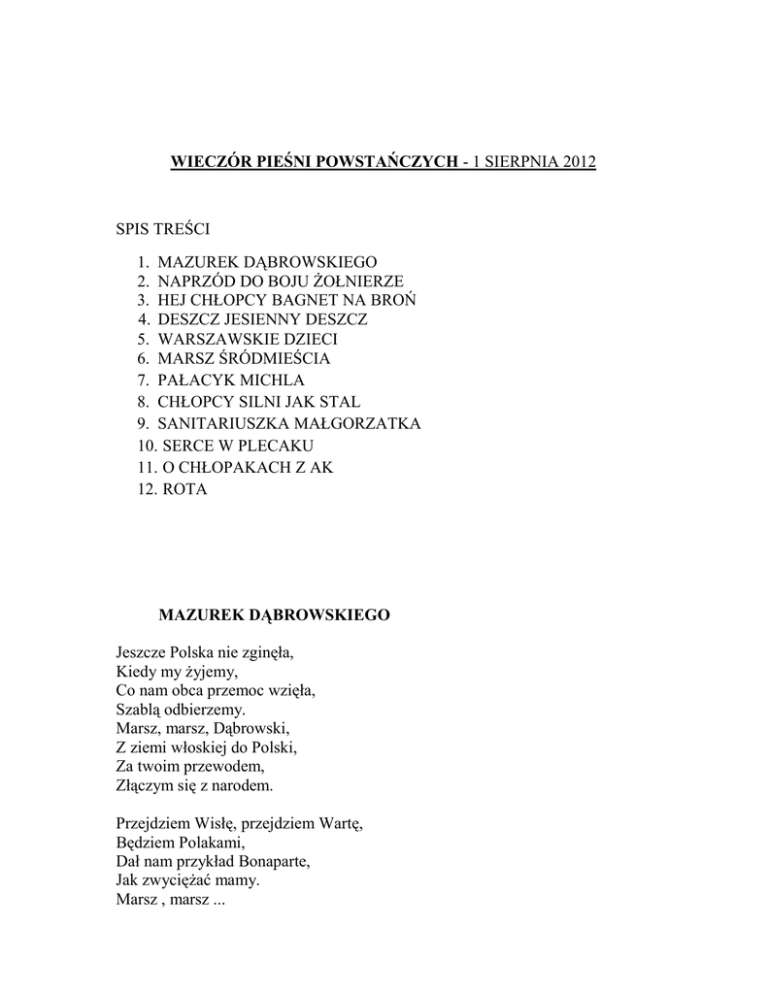 WIECZÓR PIEŚNI POWSTAŃCZYCH - 1 SIERPNIA 2012 SPIS TREŚCI 1. MAZUREK DĄBROWSKIEGO 2. NAPRZÓD DO BOJU śOŁNIERZE 3. HEJ CHŁOPCY BAGNET NA BROŃ 4. DESZCZ JESIENNY DESZCZ 5. WARSZAWSKIE DZIECI 6. MARSZ ŚRÓDMIEŚCIA 7. PAŁACYK MICHLA 8. CHŁOPCY SILNI JAK STAL 9. SANITARIUSZKA MAŁGORZATKA 10. SERCE W PLECAKU 11. O CHŁOPAKACH Z AK 12. ROTA MAZUREK DĄBROWSKIEGO Jeszcze Polska nie zginęła, Kiedy my Ŝyjemy, Co nam obca przemoc wzięła, Szablą odbierzemy. Marsz, marsz, Dąbrowski, Z ziemi włoskiej do Polski, Za twoim przewodem, Złączym się z narodem. Przejdziem Wisłę, przejdziem Wartę, Będziem Polakami, Dał nam przykład Bonaparte, Jak zwycięŜać mamy. Marsz , marsz ... Jak Czarnecki do Poznania Po szwedzkim zaborze, Dla ojczyzny ratowania Wrócim się przez morze. Marsz , marsz ... Mówił ojciec do swej Basi Cały zapłakany: "Słuchaj jeno , pono nasi Biją w tarabany" Marsz, marsz ... NAPRZÓD DO BOJU śOŁNIERZE Naprzód do boju, Ŝołnierze Polski Podziemnej! Za broń! Boska potęga nas strzeŜe, Woła do boju Was dzwon. Godzina pomsty wybija Za zbrodnie, mękę i krew. Do broni! Jezus Maryja! /x2 śołnierski woła nas zew. Zorza wolności się pali Nad Polską idących lat, Moc nasza przemoc powali, Nowy dziś rodzi się świat. Godzina pomsty wybija... Za naszą wolność i waszą, Bracia, chwytajmy za miecz, Śmierć ani trud nas nie straszą, Zwycięski Orle nasz, leć! Godzina pomsty wybija... HEJ CHŁOPCY BAGNET NA BROŃ Hej chłopcy, bagnet na broń! Długa droga, daleka przed nami, Mocne serca, a w ręku karabin, Granaty w dłoniach i bagnet na broń! Ciemna noc się nad nami Roziskrzyła gwiazdami Białe wstęgi dróg w pyle, długie noce i dni, Nowa Polska zwycięska jest w nas i przed nami W równym rytmie marsza - raz, dwa, trzy! Hej chłopcy, bagnet na broń! Długa droga daleka, przed nami trud i znój, Po zwycięstwo my młodzi idziemy na bój, Granaty w dłoniach i bagnet na broń! Jasny świt się roztoczy, Wiatr owieje nam oczy I odetchnąć da płucom i rozgorzeć da krwi. I piosenkę, jak tęczę, nad nami roztoczy W równym rytmie marsza - raz, dwa, trzy! Hej chłopcy, bagnet na broń! Bo kto wie, czy to jutro, pojutrze czy dziś, Przyjdzie rozkaz, Ŝe juŜ, Ŝe juŜ trzeba nam iść! Granaty w dłoniach i bagnet na broń! DESZCZ JESIENNY DESZCZ Deszcz, jesienny deszcz, Smutne pieśni gra, Mokną na nim karabiny, Hełmy kryje rdza. Nieś po błocie w dal, W zapłakany świat, Przemoczone pod plecakiem Osiemnaście lat. Gdzieś daleko stąd, Noc zapada znów, Ciemna główka twej dziewczyny Chyli się do snu. MoŜe właśnie dziś Patrzy w mroczną mgłę I modlitwą prosi Boga, By zachował cię. Deszcz, jesienny deszcz, Bębni w hełmu stal, Idziesz, młody Ŝołnierzyku Gdzieś w nieznaną dal. MoŜe dobry Bóg Da, Ŝe wrócisz znów, Będziesz tulił ciemną główkę! Miłej twej do snu. WARSZAWSKIE DZIECI Nie złamie wolnych Ŝadna klęska, Nie strwoŜy śmiałych Ŝaden trud, Pójdziemy razem do zwycięstwa, Gdy ramię w ramię stanie lud. Ref.: Warszawskie dzieci, pójdziemy w bój, Za kaŜdy kamień twój, stolico, damy krew. Warszawskie dzieci, pójdziemy w bój, Gdy padnie rozkaz twój, poniesiem wrogom gniew! Powiśle, Wola i Mokotów, Ulica kaŜda, kaŜdy dom, Gdy padnie pierwszy strzał, bądź gotów, Jak w ręku Boga złoty grom. Warszawskie dzieci, pójdziemy w bój... Od piły, dłuta, młota, kielni Stolico, synów swoich sław, śe stoją wraz przy tobie wierni Na straŜy twych Ŝelaznych praw. Ref.: Warszawskie dzieci, pójdziemy w bój... Piastunko naszych snów nad Wisłą Niejeden u twych stóp juŜ zgasł. I choćby wszystkim zginąć przyszło, Nie cofnie się juŜ Ŝaden z nas. Warszawskie dzieci, pójdziemy w bój... Poległym chwała, wolność Ŝywym, Niech płynie w niebo dumny śpiew, Wierzymy, Ŝe nam Sprawiedliwy Odpłaci za przelaną krew. Warszawskie dzieci, pójdziemy w bój... MARSZ ŚRÓDMIEŚCIA I znów walczy dzielna stolica, Znów spowiły ją łuny i dym – I na krwią zbroczonych ulicach Znów wolności rozlega się hymn! Choć mundury nie zdobią nam ramion, Choć nie kaŜdy z nas nawet ma broń , Cała ludność Warszawy jest z nami, KaŜdy Polak podaje nam dłoń! Bo my walcząca Warszawa Złączona ofiarą krwi... Nasz cel – to honor i sława, Potęga przyszłych dni! Nieznane nam jest słowo "trwoga", Nie zgnębi nas podstępny wróg! Kto Ŝyw, ten z nami, na wroga! Tak nam dopomóŜ Bóg! Dziś stajemy znów do raportu Oświadczamy: będziemy się bić, Za pięć lat terroru i tortur, Za miliony niewinnych Ŝyć... Za Palmiry, Wawer, Oświęcim. Niechaj dziś o tym wie cały świat, KaŜdy chętnie swe Ŝycie poświęci, Matka, siostra, czy ojciec, czy brat... Bo my walcząca Warszawa... PAŁACYK MICHLA Pałacyk Michla, śytnia, Wola, Bronią jej chłopcy od Parasola, Choć na tygrysy mają visy, To warszawiaki, same urwisy. hej ! Czuwaj wiara i wytęŜaj słuch, pręŜ swój młody duch, pracując za dwóch! Czuwaj wiara i wytęŜaj słuch, PręŜ swój młody duch , jak stal! KaŜdy chłopaczek chce być ranny Sanitariuszki - śliczne są panny i gdy Cie kulka trafi jaka, poprosisz pannę Da Ci buziaka – hej! Czuwaj wiara i wytęŜaj słuch... Z tyłu za linią dekowniki, Intendentura, róŜne umrzyki. Gotują zupę, czarną kawę I tym sposobem walczą za sprawę – hej! Czuwaj wiara i wytęŜaj słuch... Za to dowództwo jest morowe, Bo w pierwszej linii nadstawia głowę, A najmorowszy z przełoŜonych , To jest nasz ''Miecio'' w kółko golony – hej! Czuwaj wiara i wytęŜaj słuch... Wiara się bije, wiara śpiewa, Niemcy się złoszczą, krew ich zalewa. RóŜnych sposobów się imają. Co chwila ''szafę'' nam przesuwają – hej! Czuwaj wiara i wytęŜaj słuch... Lecz na nic „szafy” i granaty, Za kaŜdym razem dostają baty, I co dzień się przybliŜa chwila, śe zwycięŜymy! I do cywila – hej! Czuwaj wiara i wytęŜaj słuch... CHŁOPCY SILNI JAK STAL Chłopcy si