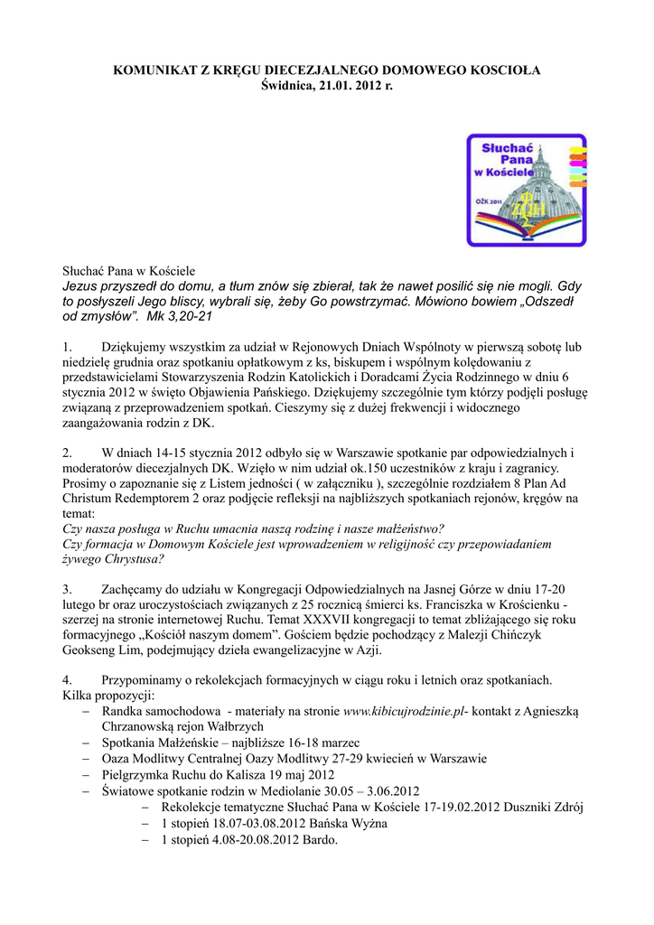 KOMUNIKAT Z KRĘGU DIECEZJALNEGO DOMOWEGO KOSCIOŁA Świdnica, 21.01. 2012 r. Słuchać Pana w Kościele Jezus przyszedł do domu, a tłum znów się zbierał, tak że nawet posilić się nie mogli. Gdy to posłyszeli Jego bliscy, wybrali się, żeby Go powstrzymać. Mówiono bowiem „Odszedł od zmysłów”. Mk 3,20-21 1. Dziękujemy wszystkim za udział w Rejonowych Dniach Wspólnoty w pierwszą sobotę lub niedzielę grudnia oraz spotkaniu opłatkowym z ks, biskupem i wspólnym kolędowaniu z przedstawicielami Stowarzyszenia Rodzin Katolickich i Doradcami Życia Rodzinnego w dniu 6 stycznia 2012 w święto Objawienia Pańskiego. Dziękujemy szczególnie tym którzy podjęli posługę związaną z przeprowadzeniem spotkań. Cieszymy się z dużej frekwencji i widocznego zaangażowania rodzin z DK. 2. W dniach 14-15 stycznia 2012 odbyło się w Warszawie spotkanie par odpowiedzialnych i moderatorów diecezjalnych DK. Wzięło w nim udział ok.150 uczestników z kraju i zagranicy. Prosimy o zapoznanie się z Listem jedności ( w załączniku ), szczególnie rozdziałem 8 Plan Ad Christum Redemptorem 2 oraz podjęcie refleksji na najbliższych spotkaniach rejonów, kręgów na temat: Czy nasza posługa w Ruchu umacnia naszą rodzinę i nasze małżeństwo? Czy formacja w Domowym Kościele jest wprowadzeniem w religijność czy przepowiadaniem żywego Chrystusa? 3. Zachęcamy do udziału w Kongregacji Odpowiedzialnych na Jasnej Górze w dniu 17-20 lutego br oraz uroczystościach związanych z 25 rocznicą śmierci ks. Franciszka w Krościenku szerzej na stronie internetowej Ruchu. Temat XXXVII kongregacji to temat zbliżającego się roku formacyjnego „Kościół naszym domem”. Gościem będzie pochodzący z Malezji Chińczyk Geokseng Lim, podejmujący dzieła ewangelizacyjne w Azji. 4. Przypominamy o rekolekcjach formacyjnych w ciągu roku i letnich oraz spotkaniach. Kilka propozycji: − Randka samochodowa - materiały na stronie www.kibicujrodzinie.pl- kontakt z Agnieszką Chrzanowską rejon Wałbrzych − Spotkania Małżeńskie – najbliższe 16-18 marzec − Oaza Modlitwy Centralnej Oazy Modlitwy 27-29 kwiecień w Warszawie − Pielgrzymka Ruchu do Kalisza 19 maj 2012 − Światowe spotkanie rodzin w Mediolanie 30.05 – 3.06.2012 − Rekolekcje tematyczne Słuchać Pana w Kościele 17-19.02.2012 Duszniki Zdrój − 1 stopień 18.07-03.08.2012 Bańska Wyżna − 1 stopień 4.08-20.08.2012 Bardo. 5. Prosimy o modlitwę i post w intencji wszystkich dzieł podejmowanych przez nasz Ruch na wszystkich szczeblach. 6. Prosimy, aby dobrym zwyczajem w naszym ruchu było potwierdzanie odebranych , przeczytanych i rozesłanych informacji. 7. Następny krąg diecezjalny 31.03.2012. Para Diecezjalna DK Lila i Olek Bojnowscy Diecezjalny Moderator DK Ks. Adam Woźniak