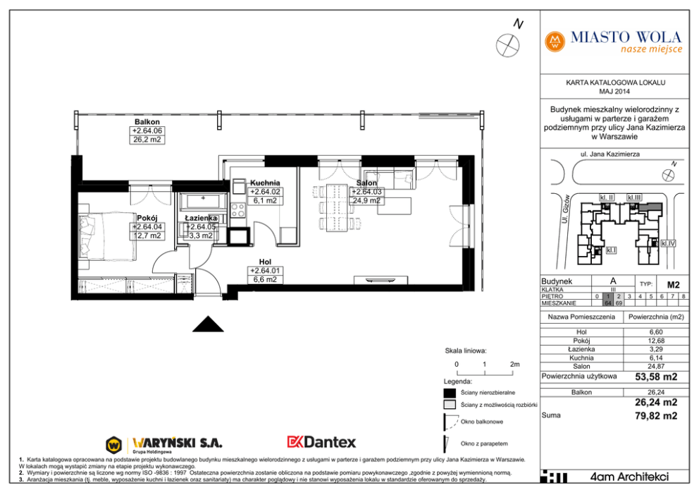 N KARTA KATALOGOWA LOKALU MAJ 2014 Budynek mieszkalny wielorodzinny z usługami w parterze i garażem podziemnym przy ulicy Jana Kazimierza w Warszawie Balkon +2.64.06 26,2 m2 ul. Jana Kazimierza N Łazienka +2.64.05 3,3 m2 9x17,1 29 kl.III 9x16,9 9x17,1 29 29 II 9x17,1 29 kl. II 9x16,9 9x17,1 29 29 III Pokój +2.64.04 12,7 m2 Salon +2.64.03 24,9 m2 Ul. Gizów Kuchnia +2.64.02 6,1 m2 III IV 9x17,1 29 9x16,9 29 I 9x17,1 29 9x16,9 29 Hol +2.64.01 6,6 m2 9x17,1 29 A Budynek KLATKA PIĘTRO MIESZKANIE M64 1 M64.1 Ściany nierozbieralne Okno z parapetem 1. Karta katalogowa opracowana na podstawie projektu budowlanego budynku mieszkalnego wielorodzinnego z usługami w parterze i garażem podziemnym przy ulicy Jana Kazimierza w Warszawie. W lokalach mogą wystapić zmiany na etapie projektu wykonawczego. 2. Wymiary i powierzchnie są liczone wg normy ISO -9836 : 1997 Ostateczna powierzchnia zostanie obliczona na podstawie pomiaru powykonawczego ,zgodnie z powyżej wymiennioną normą. 3. Aranżacja mieszkania (tj. meble, wyposażenie kuchni i łazienek oraz sanitariaty) ma charakter poglądowy i nie stanowi wyposażenia lokalu w standardzie oferowanym do sprzedaży. M2 TYP: 3 4 5 6 7 8 Hol Pokój Łazienka Kuchnia Salon 6,60 12,68 3,29 6,14 24,87 Powierzchnia użytkowa Balkon Ściany z możliwością rozbiórki Okno balkonowe III 1 2 64 69 kl.IV Powierzchnia (m2) 2m Legenda: 0 9x17,1 29 Nazwa Pomieszczenia Skala liniowa: 0 kl.I Suma 53,58 m2 26,24 26,24 m2 79,82 m2