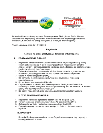 Dolnośląski Alarm Smogowy oraz Stowarzyszenie Ekologiczne EKO-UNIA na zlecenie i we współpracy z miastem Wrocław serdecznie zapraszają do wzięcia udziału w „Konkursie na pracę plastyczną o tematyce antysmogowej”. Temin składania prac do 12.10.2015. Regulamin Konkurs na pracę plastyczną o tematyce antysmogowej I. POSTANOWIENIA OGÓLNE 1. Regulamin określa warunki udziału w konkursie na pracę graficzną, której celem jest prezentacja w sieci oraz w przestrzeni miejskiej problematyki „niskiej emisji” – zanieczyszczenia powietrza pochodzącego ze spalania węgla i śmieci w piecach (przy)domowych. 2. Celem konkursu jest promowanie wizji zmian w zakresie ogrzewania we Wrocławiu, niosącej poprawę jakości powietrza i zdrowia obywateli. 3. Udział w konkursie jest bezpłatny. 4. Do konkursu można zgłaszać jedynie prace oryginalne, wcześniej niepublikowane. 5. Do konkursu może przystąpić każdy. 6. Organizatorem konkursu jest Stowarzyszenie Ekologiczne EKO-UNIA Dolnośląski Alarm Smogowy. Konkurs prowadzony jest na zlecenie i w imieniu gminy Wrocław http://www.wroclaw.pl/ 7. Do oceny nadesłanych prac powołana zostanie Komisja Konkursowa. II. CZAS TRWANIA KONKURSU 1. 2. 3. 4. Regulamin konkursu ogłoszony zostanie do 15 sierpnia 2015. Termin składania prac konkursowych do 12 października 2015. Ogłoszenie wyników nastąpi do końca października 2015. Zawarcie umowy ze zwycięzcami nastąpi do 7 dni od daty ogłoszenia wyników. III. NAGRODY 1. Komisja Konkursowa powołana przez Organizatora przyzna trzy nagrody o łącznej puli 6000 zł brutto. 2. O podziale puli na nagrody zadecyduje Komisja Konkursowa. 3. O przyznaniu nagród autorzy nagrodzonych prac będą powiadomieni emailem lub telefonicznie. IV. WYSTAWY Organizator przewiduje prezentację wybranych prac w sieci, w przestrzeni miejskiej Wrocławia na nośnikach Miejskiego Przedsiębiorstwa Komunikacyjnego we Wrocławiu, a także na citylight’ach i billboardach. V. SZCZEGÓŁOWE WARUNKI KONKURSU 1. Udział w konkursie mogą brać osoby fizyczne i prawne. 2. Konkurs jest skierowany do wszystkich, w tym szczególnie do artystów plastyków, absolwentów, studentów uczelni i wydziałów plastycznych, a także do agencji reklamowych. Liczba prac zgłoszona przez jednego autora (lub zespół) nie jest ograniczona. 3. Warunkiem udziału w konkursie jest przekazanie pracy o tematyce konkursowej oraz wyrażenie zgody na podpisanie umowy, w wypadku otrzymania nagrody. 4. Praca musi być dostarczona w formie elektronicznej, w formacie PDF lub JPG w rozdzielczości min. 300 DPI przy rozmiarze rzeczywistym. Prace w formacie PDF muszą mieć kolory definiowane w standardzie CMYK. 5. Prace należy przysłać Organizatorowi pocztą elektroniczną na adres [email protected] z dopiskiem „Konkurs na plakat”, do dnia 12 października 2015. 6. Preferowane będą: 1. prace przedstawione zarówno w układzie poziomym jak i pionowym 2. oryginalność kształtowania wizerunku problematyki zanieczyszczenia powietrza i jego wpływu na zdrowie 7. Uczestnicząc w niniejszym konkursie autorzy wyrażają zgodę na modyfikację swoich prac, celem dostosowania ich do formatu nośnika i warunków emisji. 8. Do oceny nadesłanych prac powołana zostanie Komisja Konkursowa, w skład której wchodzić będą przedstawiciele: 1. Urzędu Miasta Wrocławia 2. Polskiego Alarmu Smogowego 3. świata nauki zajmujący się problematyką wpływu zanieczyszczenia powietrza na zdrowie 4. artyści / graficy doświadczeni w kampaniach społecznych 9. Komisja konkursowa będzie zwracała szczególną uwagę na prace, które będą dotykały problemu „niskiej emisji” – zanieczyszczenia powietrza pochodzącego z pieców (przy)domowych, w których spalany jest węgiel i śmieci. Dodatkowo prace mogą uwzględniać następujące aspekty: 1. wpływ zanieczyszczenia powietrza na zdrowie mieszkańców miasta 2. ekonomiczny aspekt zanieczyszczenia powietrza 3. wagę zmian w zakresie ogrzewania, produkcji ciepła i energii elektrycznej we Wrocławiu służących poprawie jakości powietrza w mieście 4. rolę decydentów, deweloperów i mieszkańców w kwestii efektywności energetycznej VI. PRAWA AUTORSKIE 1. Uczestnicy konkursu mogą zgłaszać tylko prace wykonane samodzielnie, do których przysługują im autorskie prawa osobiste oraz całość autorskich praw majątkowych i prawa zależne. 2. Uczestnik, jako autor pracy, nie może tym utworem plastycznym naruszać prawa do wizerunku, ani innych praw osób trzecich, za co ponosi pełną i wyłączną odpowiedzialność, także w razie roszczeń do Organizatora w związku z wykorzystaniem pracy w sposób opisany w Regulaminie. 3. Uczestnik konkursu przystępując do udziału w nim wyraża zgodę wykorzystywanie i publikowanie przez Organizatora swojego głosu i wizerunku w materiałach promocyjnych, w wydawnictwach związanych z konkursem oraz na stronie internetowej Organizatora. 4. Przystępując do udziału w konkursie uczestnik zobowiązuje się, że w wypadku przyznania mu nagrody, w przeciągu 7 dni od otrzymania informacji o tym fakcie podpisze z Organizatorem umowę o przeniesieniu praw autorskich. 5. W wypadku przyznania mu nagrody uczestnik konkursu oświadcza, że bezterminowo przeniesie na Organizatora autorskie prawa majątkowe do swojej pracy i prawa zależne do jego opracowań na następujących polach eksploatacji: 1. utrwalanie i zwielokrotnianie plakatu dowolną techniką, w tym drukarską, cyfrową, na dowolnych nośnikach, bez ograniczeń co do ilości i wielkości nakładu, wprowadzanie do pamięci komputera, 2. publiczne wyświetlanie, odtwarzanie, udostępnianie pracy oraz nadawanie i reemitowanie, także w sieciach komputerowych, 3. wprowadzenie do obrotu, użyczanie lub najem oryginału albo jego kopii, 4. zamieszczanie w wydawnictwach drukowanych lub multimedialnych oraz w dowolnych publikacjach, w tym w materiałach edukacyjnych, 5. wykorzystanie dla celów upow