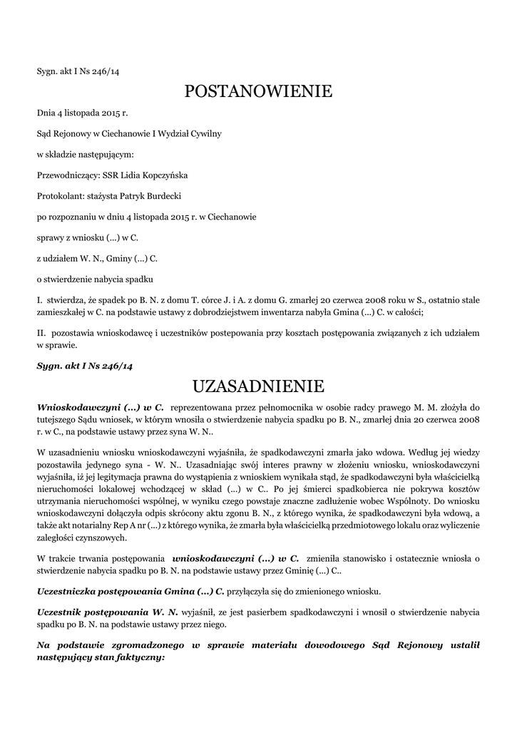 Sygn. akt I Ns 246/14 POSTANOWIENIE Dnia 4 listopada 2015 r. Sąd Rejonowy w Ciechanowie I Wydział Cywilny w składzie następującym: Przewodniczący: SSR Lidia Kopczyńska Protokolant: stażysta Patryk Burdecki po rozpoznaniu w dniu 4 listopada 2015 r. w Ciechanowie sprawy z wniosku (...) w C. z udziałem W. N., Gminy (...) C. o stwierdzenie nabycia spadku I. stwierdza, że spadek po B. N. z domu T. córce J. i A. z domu G. zmarłej 20 czerwca 2008 roku w S., ostatnio stale zamieszkałej w C. na podstawie ustawy z dobrodziejstwem inwentarza nabyła Gmina (...) C. w całości; II. pozostawia wnioskodawcę i uczestników postepowania przy kosztach postępowania związanych z ich udziałem w sprawie. Sygn. akt I Ns 246/14 UZASADNIENIE Wnioskodawczyni (...) w C. reprezentowana przez pełnomocnika w osobie radcy prawego M. M. złożyła do tutejszego Sądu wniosek, w którym wnosiła o stwierdzenie nabycia spadku po B. N., zmarłej dnia 20 czerwca 2008 r. w C., na podstawie ustawy przez syna W. N.. W uzasadnieniu wniosku wnioskodawczyni wyjaśniła, że spadkodawczyni zmarła jako wdowa. Według jej wiedzy pozostawiła jedynego syna - W. N.. Uzasadniając swój interes prawny w złożeniu wniosku, wnioskodawczyni wyjaśniła, iż jej legitymacja prawna do wystąpienia z wnioskiem wynikała stąd, że spadkodawczyni była właścicielką nieruchomości lokalowej wchodzącej w skład (...) w C.. Po jej śmierci spadkobierca nie pokrywa kosztów utrzymania nieruchomości wspólnej, w wyniku czego powstaje znaczne zadłużenie wobec Wspólnoty. Do wniosku wnioskodawczyni dołączyła odpis skrócony aktu zgonu B. N., z którego wynika, że spadkodawczyni była wdową, a także akt notarialny Rep A nr (...) z którego wynika, że zmarła była właścicielką przedmiotowego lokalu oraz wyliczenie zaległości czynszowych. W trakcie trwania postępowania wnioskodawczyni (...) w C. zmieniła stanowisko i ostatecznie wniosła o stwierdzenie nabycia spadku po B. N. na podstawie ustawy przez Gminię (...) C.. Uczestniczka postępowania Gmina (...) C. przyłączyła się do zmienionego wniosku. Uczestnik postępowania W. N. wyjaśnił, ze jest pasierbem spadkodawczyni i wnosił o stwierdzenie nabycia spadku po B. N. na podstawie ustawy przez niego. Na podstawie zgromadzonego w sprawie materiału dowodowego Sąd Rejonowy ustalił następujący stan faktyczny: B. N. z domu T., córka J. i A. z domu G. była właścicielką lokalu mieszkalnego nr (...) położonego w budynku wielomieszkaniowym przy ul. (...) w C. wchodzącym w skład (...) w C.. dowód: poświadczona kserokopia aktu notarialnego Rep. A Nr (...) - k. 9-12 akt B. N. zmarła w dniu 20 czerwca 2008 r. w S., ostatnio stale zamieszkała w C.. W chwili śmierci była wdową. Jej mąż S. N. zmarł przed nią w dniu 15 sierpnia 2001 r. w C.. dowód: odpis skrócony aktu zgonu B. N. - k. 7 akt, odpis skrócony aktu zgonu S. N. – k. 108 akt, odpis skrócony aktu małżeństwa B. N. i S. N. – k. 109 akt Z uwagi na brak dokładnego adresu zamieszkania uczestnika postępowania W. N. wezwanie do osobistego stawiennictwa na rozprawę w dniu 26 września 2014 r. wysłane na adres wskazany przez wnioskodawczynię we wniosku (ul (...), (...)-(...) C.) nie zostało mu skutecznie doręczone. Wobec czego nie mogło zostać odebrane zapewnienie spadkowe. Z powodu powyższego Sąd zobligowany przepisami art. 672 – 676 KPC dokonał ogłoszenia o toczącym się postępowaniu o stwierdzeniu nabycia spadku po B. N. na tablicy ogłoszeń tutejszego Sądu, Urzędu Miejskiego w C. oraz w Gazecie Rzeczpospolita. dowód: koperta z adnotacją doręczyciela – k. 29 akt, postanowienie (protokół) - k. 29-30 akt Podczas biegu terminu ogłoszenia o następującej treści: „Przed Sądem Rejonowym w Ciechanowie toczy się postępowanie pod sygnaturą I Ns 246/14 z wniosku (...)w C. o stwierdzenie nabycia spadku po B. N. z domu T., córce J. i A. z domu G., zmarłej w dniu 20 czerwca 2008 r. w S., ostatnio stale zamieszkałej w C.. W skład spadku wchodzi nieruchomość lokalowa położona w C. położona przy ul. (...). Sąd wzywa wszystkich spadkobierców, aby w terminie 6 miesięcy od dnia ukazania się ogłoszenia zgłosili się do tutejszego Sądu i wykazali swe prawa do spadku, gdyż w przeciwnym razie mogą być pominięci w postanowieniu o stwierdzeniu nabycia spadku." nie zgłosił się żaden spadkobierca po zamarłej B. N.. bezsporne Uczestnik postępowania W. N. był dla spadkodawczyni pasierbem, gdyż jest synem zmarłego męża spadkodawczyni z pierwszego małżeństwa z H. N. z domu R.. Matka uczestnika W. H. N. z domu Rudnicka żyje. dowód: odpis skrócony aktu urodzenia W. N. – k. 86, 87, 91, 107 akt, zapewnienie spadkowe uczestnika postępowania W. N. - k. 118 akt Spadkodawczyni B. N. pozostawiła po sobie córkę i wnuków po zmarłym synu, których dokładna tożsamość, ani miejsce zamieszkania nie są znane, jak podał podczas składania zapewnienia spadkowego uczestnik postępowania „córka spadkodawczyni prawdopodobnie nazywa się A. J., natomiast syn nie żyje, jego nazwisko to prawdopodobnie G., pozostawił po sobie dzieci”. Mimo wezwania przez ogłoszenie o toczącej się sprawie żadne z nich nie zgłosiło się do niej. Spadkodawczyni nie miała innych dzieci ani pozamałżeńskich ani przysposobionych ani też takich, które by zmarły przed jej śmiercią. Nikt nie składał oświadczeń o przyjęciu lub odrzuceniu spadku po spadkodawczyni. Nikt nie został uznany przez Sąd za niegodnego dziedziczenia, nikt nie zrzekł się dziedziczenia. Spadkodawczyni nie pozostawiła testamentu. Nie był u Notariusza zarejestrowany akt poświadczenia. dowód: zapewnienie spadkowe uczestnika postępowania W. N. - k. 118 akt Powyższy stan faktyczny Sąd ustalił w oparciu o dołączone dokumenty, a w szczególności: odpisy (w tym kserokopie) skróconych aktów zgonu k. 7, 108 akt, skróconego aktu małżeństwa k. 109 akt, skróconego aktu