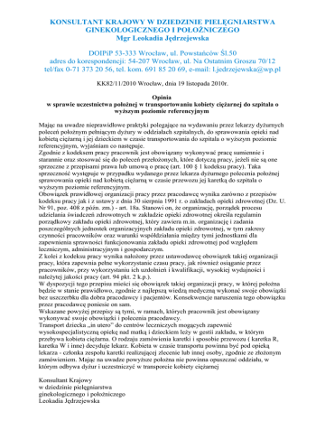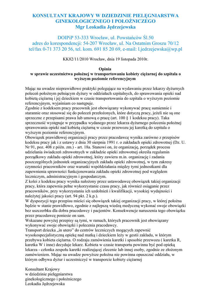 KONSULTANT KRAJOWY W DZIEDZINIE PIELĘGNIARSTWA GINEKOLOGICZNEGO I POŁOŻNICZEGO Mgr Leokadia Jędrzejewska DOIPiP 53-333 Wrocław, ul. Powstańców Śl.50 adres do korespondencji: 54-207 Wrocław, ul. Na Ostatnim Groszu 70/12 tel/fax 0-71 373 20 56, tel. kom. 691 85 20 69, e-mail: [email protected] KK82/11/2010 Wrocław, dnia 19 listopada 2010r. Opinia w sprawie uczestnictwa położnej w transportowaniu kobiety ciężarnej do szpitala o wyższym poziomie referencyjnym Mając na uwadze nieprawidłowe praktyki polegające na wydawaniu przez lekarzy dyżurnych poleceń położnym pełniącym dyżury w oddziałach szpitalnych, do sprawowania opieki nad kobietą ciężarną i jej dzieckiem w czasie transportowania do szpitala o wyższym poziomie referencyjnym, wyjaśniam co następuje. Zgodnie z kodeksem pracy pracownik jest obowiązany wykonywać pracę sumiennie i starannie oraz stosować się do poleceń przełożonych, które dotyczą pracy, jeżeli nie są one sprzeczne z przepisami prawa lub umową o pracę (art. 100 § 1 kodeksu pracy). Taka sprzeczność występuje w przypadku wydanego przez lekarza dyżurnego polecenia położnej sprawowania opieki nad kobietą ciężarną w czasie przewozu jej karetką do szpitala o wyższym poziomie referencyjnym. Obowiązek prawidłowej organizacji pracy przez pracodawcę wynika zarówno z przepisów kodeksu pracy jak i z ustawy z dnia 30 sierpnia 1991 r. o zakładach opieki zdrowotnej (Dz. U. Nr 91, poz. 408 z późn. zm.) - art. 18a. Stanowi on, że organizację, porządek procesu udzielania świadczeń zdrowotnych w zakładzie opieki zdrowotnej określa regulamin porządkowy zakładu opieki zdrowotnej, który zawiera m.in. organizację i zadania poszczególnych jednostek organizacyjnych zakładu opieki zdrowotnej, w tym zakresy czynności pracowników oraz warunki współdziałania między tymi jednostkami dla zapewnienia sprawności funkcjonowania zakładu opieki zdrowotnej pod względem leczniczym, administracyjnym i gospodarczym. Z kolei z kodeksu pracy wynika nałożony przez ustawodawcę obowiązek takiej organizacji pracy, która zapewnia pełne wykorzystanie czasu pracy, jak również osiąganie przez pracowników, przy wykorzystaniu ich uzdolnień i kwalifikacji, wysokiej wydajności i należytej jakości pracy (art. 94 pkt. 2 k.p.). W dyspozycji tego przepisu mieści się obowiązek takiej organizacji pracy, w której położna będzie w stanie prawidłowo, zgodnie z najlepszą wiedzą medyczną wykonać swoje obowiązki bez uszczerbku dla dobra pracodawcy i pacjentów. Konsekwencje naruszenia tego obowiązku przez pracodawcę poniesie on sam. Wskazane powyżej przepisy są tymi, w ramach, których pracownik jest obowiązany wykonywać swoje obowiązki i polecenia pracodawcy. Transport dziecka „in utero” do centrów leczniczych mogących zapewnić wysokospecjalistyczną opiekę nad matką i dzieckiem leży w gestii zakładu, w którym przebywa kobieta ciężarna. O rodzaju zamówienia karetki i sposobie przewozu ( karetka R, karetka W i inne) decyduje lekarz. Kobieta w czasie transportu powinna być pod opieką lekarza - członka zespołu karetki realizującej zlecenie lub innej osoby, zgodnie ze złożonym zamówieniem. Mając na uwadze powyższe położna nie powinna opuszczać oddziału, w którym odbywa dyżur i uczestniczyć w transporcie kobiety ciężarnej Konsultant Krajowy w dziedzinie pielęgniarstwa ginekologicznego i położniczego Leokadia Jędrzejewska