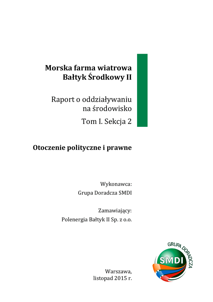 Morska farma wiatrowa Bałtyk Środkowy II Raport o oddziaływaniu na środowisko Tom I. Sekcja 2 Otoczenie polityczne i prawne Wykonawca: Grupa Doradcza SMDI Zamawiający: Polenergia Bałtyk II Sp. z o.o. Warszawa, listopad 2015 r. Raport o oddziaływaniu na środowisko MFW Bałtyk Środkowy II Tom I. Sekcja 2 Otoczenie polityczne i prawne Informacje o dokumencie Dokument: Morska farma wiatrowa Bałtyk Środkowy II Raport o oddziaływaniu na środowisko Tom I. Sekcja 2 Otoczenie polityczne i prawne Wersja: Ostateczna Autorzy: Zespół autorski został wskazany w oddzielnej części raportu (Tom I. Sekcja 1) Sprawdził: Krzysztof Mielniczuk Zatwierdził: Maciej Stryjecki Zamawiający: Polenergia Bałtyk II Sp. z o.o. ul. Krucza 24/26 00-526 Warszawa Wykonawca: SMDI Doradztwo Inwestycyjne Sp. z o.o. Al. Wilanowska 208/4 02-765 Warszawa Data umowy: 20.01.2015 r. 2 Raport o oddziaływaniu na środowisko MFW Bałtyk Środkowy II Tom I. Sekcja 2 Otoczenie polityczne i prawne Spis treści Skróty ...................................................................................................................................... 4 1. Wprowadzenie............................................................................................................... 5 2. Uwarunkowania międzynarodowe ................................................................................. 5 3. Polityka i prawo Unii Europejskiej................................................................................... 6 4. Krajowe uwarunkowania polityczne ............................................................................... 7 4.1. Morska energetyka w dokumentach strategicznych ............................................................................. 8 4.2. Bariery polityczne ................................................................................................................................ 10 5. Krajowe uwarunkowania prawne ................................................................................. 11 5.1. System wsparcia dla odnawialnych źródeł energii .............................................................................. 11 5.2. Pozwolenia wymagane polskim prawem ............................................................................................ 12 5.3. Bariery prawne .................................................................................................................................... 12 6. Materiały źródłowe i porównawcze .............................................................................. 14 6.1. Dokumenty strategiczne ...................................................................................................................... 14 6.2. Akty prawne......................................................................................................................................... 14 6.3. Literatura i opracowania eksperckie ................................................................................................... 15 6.4. Strony internetowe.............................................................................................................................. 15 3 Raport o oddziaływaniu na środowisko MFW Bałtyk Środkowy II Tom I. Sekcja 2 Otoczenie polityczne i prawne Skróty GW Gigawat KPD Krajowy Plan Działania MW Megawat MFW MWh Morska farma wiatrowa Megawatogodzina Odnawialne źródła energii OZE PSZW Ustawa OZE Pozwolenie na wznoszenie i wykorzystywanie sztucznych wysp, konstrukcji i urządzeń w polskich obszarach morskich Ustawa z dnia 20 lutego 2015 r. o odnawialnych źródłach energii (Dz.U. poz. 478) 4 Raport o oddziaływaniu na środowisko MFW Bałtyk Środkowy II Tom I. Sekcja 2 Otoczenie polityczne i prawne 1. Wprowadzenie Morska energetyka wiatrowa odgrywa coraz większą rolę w Europie i na świecie. Chociaż farmy wiatrowe zlokalizowane na lądzie wciąż przeważają to rola morskich farm wiatrowych będzie sukcesywnie wzrastać. Mimo znacząco większych niż na lądzie kosztów inwestycyjnych MFW stają się coraz bardziej konkurencyjne ze względu na następujące czynniki: • wiatry na obszarach morskich wieją z większą prędkością i nie są tak zmienne, dzięki czemu rośnie potencjał wytwórczy farm wiatrowych i stabilność systemu elektroenergetycznego; • na obszarach morskich można montować większe turbiny wiatrowe o znacznie większej mocy z uwagi na brak ograniczeń przestrzennych i możliwość transportu komponentów z miejsca produkcji na miejsce instalacji drogą morską; • morskie farmy wiatrowe, jeżeli nie zakłócają działalności na morzu i nie oddziałują negatywnie na środowisko morskie, nie budzą w społeczeństwie tak silnych emocji i nie wywołują konfliktów społecznych1. Rozwój energetyki wiatrowej wpisuje się też w międzynarodowe i unijne zobowiązania Polski, które zostały opisane w dalszej części Sekcji. 2. Uwarunkowania międzynarodowe Podstawowym czynnikiem stymulującym światowy rozwój odnawialnych źródeł energii, w tym morskiej energetyki wiatrowej, jest dążenie do ograniczenia wykorzystania paliw kopalnych oraz przeciwdziałanie zmianom klimatu. W kontekście międzynarodowym Polska jest sygnatariuszem Ramowej Konwencji Narodów Zjednoczonych w sprawie Zmian Klimatu (United Nations Framework Convention on Climate Change, UNFCCC). Konwencja ta została podpisana 9 maja 1992 r. w Rio de Janeiro. Konwencja określa założenia międzynarodowej współpracy dotyczącej ograniczenia emisji gazów cieplarnianych (mitygacji) odpowiedzialnych za zjawisko globalnego ocieplenia, mających swoje źródło w działalności człowieka. Dotychczas Konwencję ratyfikowało 195 stron (194 państwa oraz Unia Europejska). Polska ratyfikowała Konwencję w czerwcu 1994 r. Najważniejszym, prawnie wiążącym instrumentem Konwencji, jest Protokół z Kioto, podpisany 11 grudnia 1997 r., wszedł w życie w lutym 2005 r. Na jego mocy państwa 