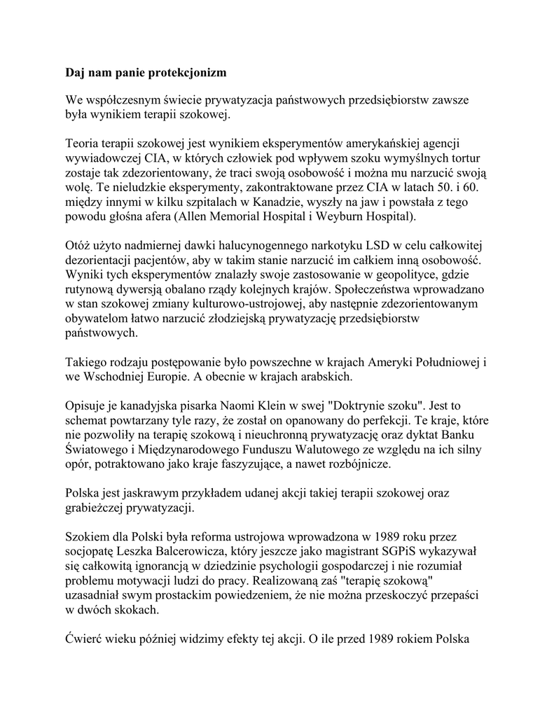 Daj nam panie protekcjonizm We współczesnym świecie prywatyzacja państwowych przedsiębiorstw zawsze była wynikiem terapii szokowej. Teoria terapii szokowej jest wynikiem eksperymentów amerykańskiej agencji wywiadowczej CIA, w których człowiek pod wpływem szoku wymyślnych tortur zostaje tak zdezorientowany, że traci swoją osobowość i można mu narzucić swoją wolę. Te nieludzkie eksperymenty, zakontraktowane przez CIA w latach 50. i 60. między innymi w kilku szpitalach w Kanadzie, wyszły na jaw i powstała z tego powodu głośna afera (Allen Memorial Hospital i Weyburn Hospital). Otóż użyto nadmiernej dawki halucynogennego narkotyku LSD w celu całkowitej dezorientacji pacjentów, aby w takim stanie narzucić im całkiem inną osobowość. Wyniki tych eksperymentów znalazły swoje zastosowanie w geopolityce, gdzie rutynową dywersją obalano rządy kolejnych krajów. Społeczeństwa wprowadzano w stan szokowej zmiany kulturowo-ustrojowej, aby następnie zdezorientowanym obywatelom łatwo narzucić złodziejską prywatyzację przedsiębiorstw państwowych. Takiego rodzaju postępowanie było powszechne w krajach Ameryki Południowej i we Wschodniej Europie. A obecnie w krajach arabskich. Opisuje je kanadyjska pisarka Naomi Klein w swej "Doktrynie szoku". Jest to schemat powtarzany tyle razy, że został on opanowany do perfekcji. Te kraje, które nie pozwoliły na terapię szokową i nieuchronną prywatyzację oraz dyktat Banku Światowego i Międzynarodowego Funduszu Walutowego ze względu na ich silny opór, potraktowano jako kraje faszyzujące, a nawet rozbójnicze. Polska jest jaskrawym przykładem udanej akcji takiej terapii szokowej oraz grabieżczej prywatyzacji. Szokiem dla Polski była reforma ustrojowa wprowadzona w 1989 roku przez socjopatę Leszka Balcerowicza, który jeszcze jako magistrant SGPiS wykazywał się całkowitą ignorancją w dziedzinie psychologii gospodarczej i nie rozumiał problemu motywacji ludzi do pracy. Realizowaną zaś "terapię szokową" uzasadniał swym prostackim powiedzeniem, że nie można przeskoczyć przepaści w dwóch skokach. Ćwierć wieku później widzimy efekty tej akcji. O ile przed 1989 rokiem Polska miała wiele gałęzi przemysłu na przyzwoitym poziomie światowym, to obecnie nasz dumny kraj został sprowadzony do poziomu żebraka. Żyje głównie zasilany zagranicznymi pożyczkami, w tym Banku Światowego i Międzynarodowego Funduszu Walutowego, tworzącymi gigantyczne już i stale rosnące zadłużenie zagraniczne. A instytucje Międzynarodowego Funduszu Walutowego i Banku Światowego, tak jak kiedyś dyktatorskie partie komunistyczne, przyznają się dziś do błędów i wypaczeń. Tak jak kiedyś komuniści, obiecują reformy swoich działań. W mojej skromnej opinii, po zmianach ustrojowych z socjalizmu na kapitalizm, chłonny rynek zbytu 300 milionów ludzi Wschodniej Europy opóźnił gospodarczą recesję pazernych krajów Zachodu co najmniej o 20 lat. Dyktat Banku Światowego i Międzynarodowego Funduszu Walutowego zawsze zalecał globalizację i wolnorynkowość, ponieważ dotowana przez państwo sklerotyczna biurokracja zakładów pracy gospodarki państwowych nie dawała zysków, tylko straty. Podawano liczne przykłady państwowych firm, które traciły pieniądze i utrzymywały się z państwowych dotacji. A przecież nie zawsze inwestycje firm prywatnych są udane. Summa summarum w przestrzeni czasu okazało się, że jedyne kraje, które miały znaczący gospodarczy wzrost, to kraje, które po terapii szokowej stosowały interwencjonizm, czyli protekcjonizm w strategicznych gałęziach swojej gospodarki, takich jak huty, stocznie etc. I nawet przy pomocy taryf celnych chroniły swój młody przemysł. Dobitnym przykładem takiego postępowania są Chiny, Japonia, Korea i Brazylia. Każdy z tych krajów w czasie reform ustrojowych, czyli po terapii szokowej, miał szczęście, że w ich rządach mieli patriotów, którzy potrafili obronić kraj przed atakiem nowoczesnej wojny ekonomicznej. Nawet nie trzeba było do takiej obrony mieć ekonomistów – w Japonii reformy gospodarcze zostały wprowadzone przez prawników, a w Korei i w Chinach przez inżynierów. Kanadyjski ekonomista śp. John Galbraith powiedział, że ekonomia to nauka dla ekonomistów, którzy z tego żyją. Z kolei śp. Marshall McLuhan, słynny kanadyjski guru teorii mass mediów, powiedział, iż "dzisiejszy tyran nie rządzi pałką czy pięścią, ale przebrany na badacza rynku prowadzi swoje stado drogami wygody i komfortu". Celem jest bezbolesne zniewolenie ludzi. Tak jak żaba powoli podgrzewana w garnku z niego nie wyskoczy, aż się ją ugotuje. Polityka bezmyślnej prywatyzacji, której dokonała grupa władzy w Polsce, jest obecnie ostro krytykowana przez wielu ekonomistów. Na przykład amerykański ekonomista Ian Bremmer, w swojej nowej książce pt. "Każdy naród dla siebie" (2012), mówi tak: "pomijając własną ważność, akceptacja wymuszanych przez Amerykanów rozwiązań nie jest zawsze najlepszą drogą. Nie każdy kraj w stanie rozwoju jest gotowy do wielopartyjnej demokracji i wielkiej prywatyzacji ściśle regulowanej gospodarki. Amerykańscy twórcy zagranicznej polityki muszą zrobić więcej, niż tylko zrozumieć ten fakt. Muszą oni pozwolić na lokalne rozwiązania dla lokalnych problemów. Adaptacja do zmiennych sytuacji oznacza unikanie doktrynalnego postępowania w obliczu wyzwań dla danego kraju". Niestety, Polska nie miała patriotycznego rządu od 1944 roku, kiedy to cały powojenny rząd Polski został porwany przez Stalina do Moskwy, gdzie w typowo komunistycznym procesie pokazowym skazano jego członków na wieloletnie kary więzienia. I natychmiast zastąpiła ich grupa polskojęzycznych Żydów, specjalnie do tego celu przygotowanych przez Sowietów. To ich dzieci i wnuczkowie, z poparciem już krajów Zachodu, niezmiennie rządzą Polakami od 1944 roku. Współcześnie przy pomocy prop