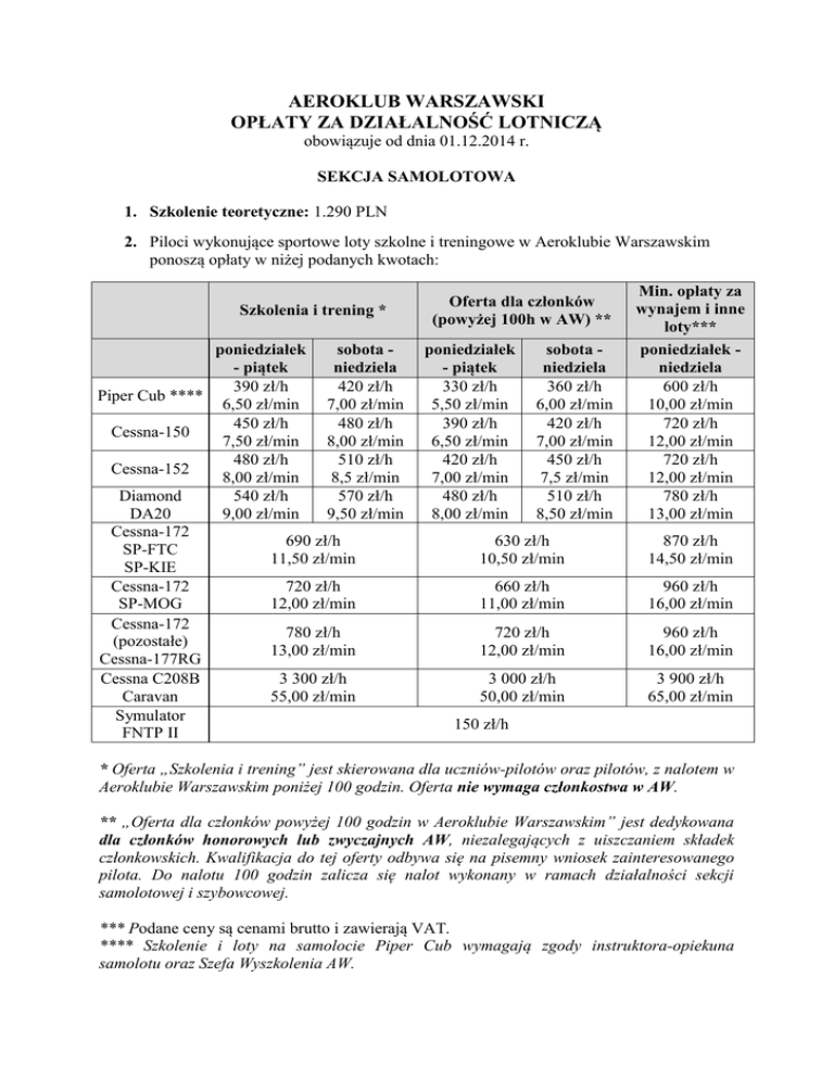 AEROKLUB WARSZAWSKI OPŁATY ZA DZIAŁALNOŚĆ LOTNICZĄ obowiązuje od dnia 01.12.2014 r. SEKCJA SAMOLOTOWA 1. Szkolenie teoretyczne: 1.290 PLN 2. Piloci wykonujące sportowe loty szkolne i treningowe w Aeroklubie Warszawskim ponoszą opłaty w niżej podanych kwotach: Szkolenia i trening * poniedziałek sobota - piątek niedziela 390 zł/h 420 zł/h Piper Cub **** 6,50 zł/min 7,00 zł/min 450 zł/h 480 zł/h Cessna-150 7,50 zł/min 8,00 zł/min 480 zł/h 510 zł/h Cessna-152 8,00 zł/min 8,5 zł/min Diamond 540 zł/h 570 zł/h DA20 9,00 zł/min 9,50 zł/min Cessna-172 690 zł/h SP-FTC 11,50 zł/min SP-KIE Cessna-172 720 zł/h SP-MOG 12,00 zł/min Cessna-172 780 zł/h (pozostałe) 13,00 zł/min Cessna-177RG Cessna C208B 3 300 zł/h Caravan 55,00 zł/min Symulator FNTP II Oferta dla członków (powyżej 100h w AW) ** poniedziałek - piątek 330 zł/h 5,50 zł/min 390 zł/h 6,50 zł/min 420 zł/h 7,00 zł/min 480 zł/h 8,00 zł/min sobota niedziela 360 zł/h 6,00 zł/min 420 zł/h 7,00 zł/min 450 zł/h 7,5 zł/min 510 zł/h 8,50 zł/min Min. opłaty za wynajem i inne loty*** usługowe poniedziałek niedziela 600 zł/h 10,00 zł/min 720 zł/h 12,00 zł/min 720 zł/h 12,00 zł/min 780 zł/h 13,00 zł/min 630 zł/h 10,50 zł/min 870 zł/h 14,50 zł/min 660 zł/h 11,00 zł/min 960 zł/h 16,00 zł/min 720 zł/h 12,00 zł/min 960 zł/h 16,00 zł/min 3 000 zł/h 50,00 zł/min 3 900 zł/h 65,00 zł/min 150 zł/h * Oferta „Szkolenia i trening” jest skierowana dla uczniów-pilotów oraz pilotów, z nalotem w Aeroklubie Warszawskim poniżej 100 godzin. Oferta nie wymaga członkostwa w AW. ** „Oferta dla członków powyżej 100 godzin w Aeroklubie Warszawskim” jest dedykowana dla członków honorowych lub zwyczajnych AW, niezalegających z uiszczaniem składek członkowskich. Kwalifikacja do tej oferty odbywa się na pisemny wniosek zainteresowanego pilota. Do nalotu 100 godzin zalicza się nalot wykonany w ramach działalności sekcji samolotowej i szybowcowej. *** Podane ceny są cenami brutto i zawierają VAT. **** Szkolenie i loty na samolocie Piper Cub wymagają zgody instruktora-opiekuna samolotu oraz Szefa Wyszkolenia AW. Sportowe loty szkolne i treningowe są rozliczane wg stawki VAT zwolniony. Loty szkolne i treningowe, niebędące lotami sportowymi są rozliczane wg cen podanych powyżej powiększonych o 10%. Tak obliczona cena jest ceną brutto, w tym 23% VAT. (Nie dotyczy cen w ostatniej kolumnie, które są już cenami brutto z VAT). Oferty „szkolenia i trening” oraz „oferty dla członków powyżej 100h w AW” obowiązują także firmy oraz organizacje pod warunkiem, że samolot jest pilotowany (jako pilot-dowódca lub uczeń w locie szkolnym) przez członka honorowego, zwyczajnego lub wspierającego AW. W takim przypadku kwalifikacja do odpowiedniej kategorii stawek odbywa się analogicznie jak poprzednio, na podstawie nalotu tego pilota w Aeroklubie Warszawskim. Gdy usługi nie są świadczone na rzecz osób uprawiających sport, dolicza się 10% - tak obliczona cena jest ceną brutto, w tym 23% VAT. 3. Opłata za instruktora: W lotach z instruktorem w samolocie oraz podczas szkolenia/treningu na symulatorze z instruktorem do każdej minuty lotu dolicza się opłatę w wysokości 1,50 zł/min. W lotach samodzielnych uczniów-pilotów nadzór instruktorski gratis! 4. Wypożyczenie sprzętu na zawody Udostępnienie członkom AW sprzętu na zawody samolotowe i pokazy lotnicze podlega opłatom wg stawki „poniedziałek-piątek”. 5. Opłaty lotniskowe i zakup paliwa Piloci i uczniowie-piloci wszelkie dodatkowe opłaty ponoszą indywidualnie za wyjątkiem lotnisk Babice i Chrcynno. Podane ceny skalkulowano na podstawie wartości paliwa dostępnego w AW. W przypadku tankowania samolotu poza AW zostanie doliczona opłata dodatkowa za lot stanowiąca różnicę ceny zakupu paliwa poza AW i wartości paliwa dostępnego w AW. Opłata dodatkowa zostanie potrącona przy rozliczeniu faktury zakupu paliwa poza AW na podstawie kompletu dokumentów niezbędnych do rozliczenia zużycia paliwa zwolnionego z akcyzy. Rozliczenie następuje, jeżeli nie było możliwe tankowanie w AW oraz umowa użytkowania statku powietrznego przewiduje możliwość tankowania na koszt AW. 6. Rozliczenia Przekazywanie kwot zgromadzonych w Aeroklubie Warszawskim pomiędzy kontami różnych sekcji specjalnościowych odbywa się na pisemną prośbę właściciela konta i wymaga zatwierdzenia Dyrektora AW. Przed wykonaniem lotu pilot zobowiązany jest zasilić konto (dokonać wpłaty) w wysokości pozwalającej na wykonanie planowanego zadania. W wyjątkowych przypadkach osiągnięcia salda mniejszego od zera, pilot zobowiązany jest niezwłocznie uzupełnić stan konta. Warunkiem korzystania z cen podanych w pkt. 2 i 3 jest brak zaległych zobowiązań wobec Aeroklubu Warszawskiego oraz dokonanie przedpłaty w odpowiedniej wysokości i wykonywanie lotu z dodatnim stanem konta pilota. Wykonywanie lotów z ujemnym saldem jest zabronione. W przypadku wykonania lotu z ujemnym saldem rozliczeń pilota, obowiązuje powyższy cennik powiększony o 30% (nie dotyczy wyjątkowych przypadków osiągnięcia ujemnego salda, pod warunkiem niezwłocznego uzupełnienia konta). SEKCJA SZYBOWCOWA 1. Teoretyczny kurs szybowcowy Oferta specjalna dla młodzieży uczącej się do 25 roku życia: 690 PLN Oferta podstawowa dla pozostałych osób: 990 PLN 2. Indywidualny program szkolenia do licencji PL(G) 300 PLN 3. Podstawowe Szkolenie szybowcowe Szkolenie za wyciągarką Cena podstawowa: 4.590 PLN Oferta specjalna dla uczniów i studentów do 25 roku życia: 3.790 PLN Oferta specjalna dla młodzieży do 18 roku życia: 2.990 PLN Szkolenie podstawowe obejmuje 70 lotów (opłata zryczałtowana). Loty dodatkowe (poza opłatą zryczałtowaną) rozliczane są zgodnie z Tabelą B. 4. Szkolenie ponadpodstawowe i loty treningowe Tabela A GOŚĆ Piloci spoza AW Start za samolotem SP-AWA – HOL (zł / min holu) Start za innym samolotem -