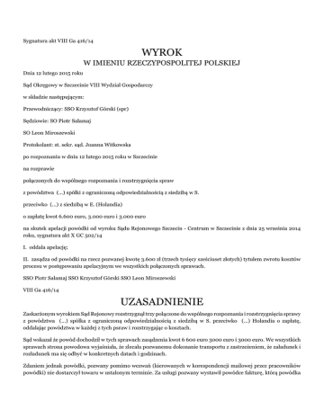 Sygnatura akt VIII Ga 416/14 WYROK W IMIENIU RZECZYPOSPOLITEJ POLSKIEJ Dnia 12 lutego 2015 roku Sąd Okręgowy w Szczecinie VIII Wydział Gospodarczy w składzie następującym: Przewodniczący: SSO Krzysztof Górski (spr) Sędziowie: SO Piotr Sałamaj SO Leon Miroszewski Protokolant: st. sekr. sąd. Joanna Witkowska po rozpoznaniu w dniu 12 lutego 2015 roku w Szczecinie na rozprawie połączonych do wspólnego rozpoznania i rozstrzygnięcia spraw z powództwa (...) spółki z ograniczoną odpowiedzialnością z siedzibą w S. przeciwko (...) z siedzibą w E. (Holandia) o zapłatę kwot 6.600 euro, 3.000 euro i 3.000 euro na skutek apelacji powódki od wyroku Sądu Rejonowego Szczecin - Centrum w Szczecinie z dnia 25 września 2014 roku, sygnatura akt X GC 502/14 I. oddala apelację; II. zasądza od powódki na rzecz pozwanej kwotę 3.600 zł (trzech tysięcy sześciuset złotych) tytułem zwrotu kosztów procesu w postępowaniu apelacyjnym we wszystkich połączonych sprawach. SSO Piotr Sałamaj SSO Krzysztof Górski SSO Leon Miroszewski VIII Ga 416/14 UZASADNIENIE Zaskarżonym wyrokiem Sąd Rejonowy rozstrzygnął trzy połączone do wspólnego rozpoznania i rozstrzygnięcia sprawy z powództwa (...) spółka z ograniczoną odpowiedzialnością z siedzibą w S. przeciwko (...) Holandia o zapłatę, oddalając powództwa w każdej z tych psraw i rozstrzygając o kosztach. Sąd wskazał że powód dochodził w tych sprawach zasądzenia kwot 6 600 euro 3000 euro i 3000 euro. We wszystkich sprawach strona powodowa wyjaśniała, że zlecała pozwanemu dokonanie transportu z zastrzeżeniem, że załadunek i rozładunek ma się odbyć w konkretnych datach i godzinach. Zdaniem jednak powódki, pozwany pomimo wezwań (kierowanych w korespondencji mailowej przez pracowników powódki) nie dostarczył towaru w ustalonym terminie. Za usługi pozwany wystawił powódce fakturę, którą powódka opłaciła z zastrzeżeniem jednak zwrotu z uwagi na niewłaściwe wykonanie transportu przez pozwanego i przekroczenie terminu dostawy. Mając to na uwadze powódka wskazywała na warunki zlecenia (pkt. 8), stanowiące integralną część wszystkich zleceń transportowych, zgodnie z którymi w przypadku określenia terminu fix termin rozumianego jako odbiór i dostawę w określonej godzinie zleceniodawca (powódka) zastrzega sobie prawo do obciążenia zleceniobiorcy (pozwanego) karą umowną w wysokości 150 euro za każdą godzinę opóźnienia. Dochodzone kwoty stanowiły kary umownr obliczoną stosownie do ustalonej w godzinach długości opóźnienia Pozwany wniósł o oddalenie powództwa w całości we wszystkich sprawach . Uzasadniając swoje stanowisko pozwany stwierdził, że to na skutek niewywiązywania się przez powódkę z umowy, pozwany zmuszony był wstrzymać dostawę. Pozwany zaznaczył jednocześnie, że dochował wszelkich możliwych czynności w zakresie uchronienia powódki przed jakąkolwiek odpowiedzialnością wobec odbiorcy, gdyż porozumiał się z bezpośrednim odbiorcą. Biorąc to pod uwagę pozwany podniósł, że ani powódką, ani odbiorca nie ponieśli jakiejkolwiek szkody z tytułu opóźnienia w dostawie. Ponadto pozwany stwierdził, iż takie jego zachowanie było spowodowane wyłącznie postępowaniem powódki, gdyż jedynym możliwym zabiegiem w celu „przymuszenia” powódki do realizacji opóźnionego o ponad 90 dni świadczenia. Co więcej, zdaniem pozwanego, tego rodzaju działania, polegające na wstrzymaniu dostawy, czy przekazanie prawa do rozporządzania towarem odbiorcy w myśl przepisów Konwencji CMR, stanowi powszechnie stosowany w praktyce sposób dochodzenia roszczeń przez przewoźników realizujących przewozy międzynarodowe. Niezależnie od powyższych okoliczności, pozwany podkreślił, że dostawa została odebrana bez żadnych zastrzeżeń, a powódka uregulowała należność z tytułu przewozu, nie dokonując żadnych reklamacji. Ponadto pozwany wskazał, że w niniejszej sprawie znajdzie zastosowanie Konwencja CMR. Zdaniem pozwanego w tym akcie prawnym ustalono, że przewoźnik ponosi odpowiedzialność odszkodowawczą za opóźnienie dostawy, wyłącznie gdy z opóźnieniem tym związana jest szkoda. Ponadto w ocenie pozwanego w akcie tym, w istocie chodzi nie o każde opóźnienie, a o „zwłokę”, tj. takie opóźnienie, które powstało na skutek okoliczności, za które odpowiedzialność ponosi przewoźnik. Pozwany stwierdził również, że Konwencja w sposób jednoznaczny określa zasady ustalania wysokości odszkodowania, należnego od przewoźnika, w ten sposób, że w razie opóźnienia dostawy, jeżeli osoba uprawniona udowodni, że wynikła stąd dla niej szkoda, przewoźnik obowiązany jest zapłacić odszkodowanie, które nie może przewyższyć kwoty przewoźnego (art. 23 ust. 5). Pozwany zwrócił przy tym uwagę, że Konwencja stanowi, iż dochodzenie roszczeń z tytułu opóźnienia dostawy uzależnione jest od zgłoszenia przez osobę uprawnioną zastrzeżenia pisemnego, skierowanego w terminie 21 dni od dnia postawienia towaru do dyspozycji odbiorcy (art. 30 ust. 3). Mając na uwadze te przepisy pozwany zwrócił zaznaczył jednocześnie, że zgodnie z art. 41 Konwencji nieważna i pozbawiona mocy jest każda klauzula, która pośrednio lub bezpośrednio naruszałaby postanowienia Konwencji, a zatem według pozwanego niedopuszczalna jest praktyka zastrzegania kar umownych z tych tytułów, które są unormowane w konwencji CMR w sposób wymagający od osoby uprawnionej dowodu szkody. Biorąc pod uwagę powyższe okoliczności pozwany podniósł, że roszczenia powódki są bezzasadne, gdyż nie zgłosiła ona żadnych zastrzeżeń, czy też reklamacji co do przewozów, opóźnienia w dostawach wynikały z przyczyn niezależnych od pozwanego, a ponadto powódka nie wykazała, aby z tytułu tych opóźnień poniosła jakąkolwiek szkodę. Bez względu na to pozwany zwrócił również uwagę, że naliczona przez pow