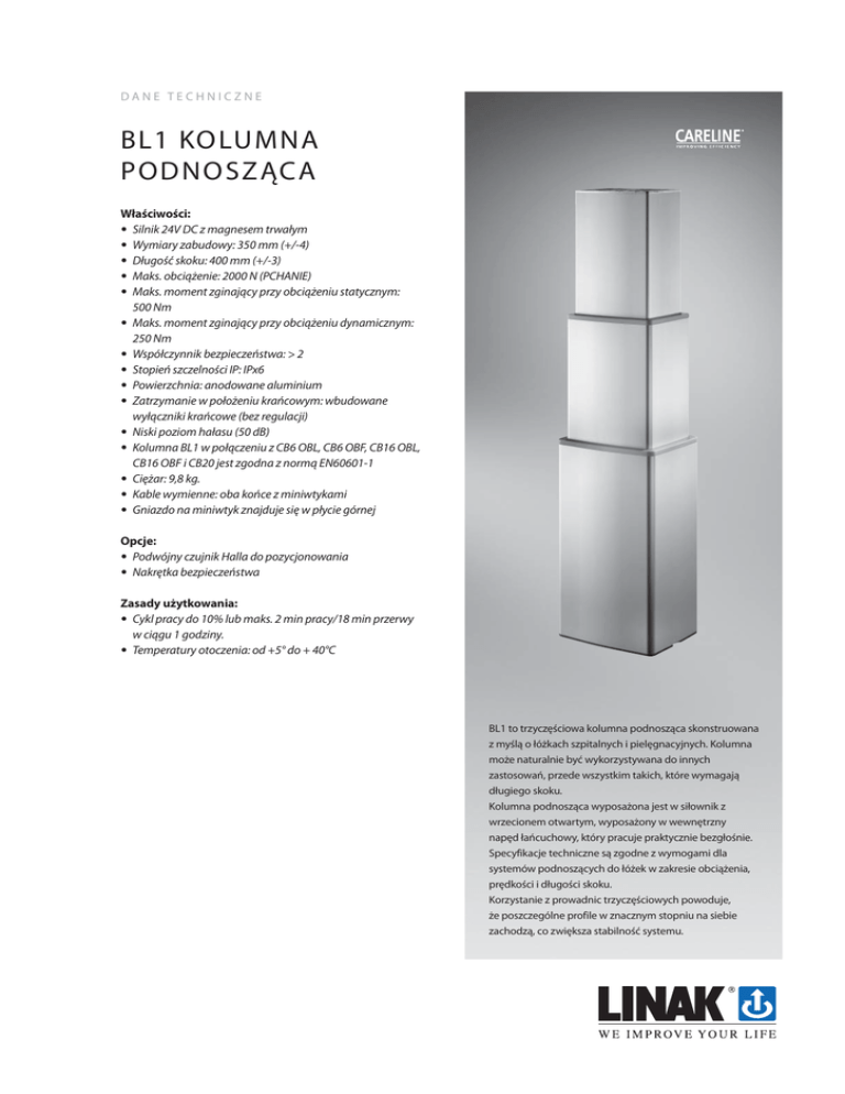 DANE TECHNICZNE BL1 KOLUMNA PODNOSZĄCA Właściwości: • Silnik 24V DC z magnesem trwałym • Wymiary zabudowy: 350 mm (+/-4) • Długość skoku: 400 mm (+/-3) • Maks. obciążenie: 2000 N (PCHANIE) • Maks. moment zginający przy obciążeniu statycznym: 500 Nm • Maks. moment zginający przy obciążeniu dynamicznym: 250 Nm • Współczynnik bezpieczeństwa: > 2 • Stopień szczelności IP: IPx6 • Powierzchnia: anodowane aluminium • Zatrzymanie w położeniu krańcowym: wbudowane wyłączniki krańcowe (bez regulacji) • Niski poziom hałasu (50 dB) • Kolumna BL1 w połączeniu z CB6 OBL, CB6 OBF, CB16 OBL, CB16 OBF i CB20 jest zgodna z normą EN60601-1 • Ciężar: 9,8 kg. • Kable wymienne: oba końce z miniwtykami • Gniazdo na miniwtyk znajduje się w płycie górnej Opcje: • Podwójny czujnik Halla do pozycjonowania • Nakrętka bezpieczeństwa Zasady użytkowania: • Cykl pracy do 10% lub maks. 2 min pracy/18 min przerwy w ciągu 1 godziny. • Temperatury otoczenia: od +5° do + 40°C BL1 to trzyczęściowa kolumna podnosząca skonstruowana z myślą o łóżkach szpitalnych i pielęgnacyjnych. Kolumna może naturalnie być wykorzystywana do innych zastosowań, przede wszystkim takich, które wymagają długiego skoku. Kolumna podnosząca wyposażona jest w siłownik z wrzecionem otwartym, wyposażony w wewnętrzny napęd łańcuchowy, który pracuje praktycznie bezgłośnie. Specyfikacje techniczne są zgodne z wymogami dla systemów podnoszących do łóżek w zakresie obciążenia, prędkości i długości skoku. Korzystanie z prowadnic trzyczęściowych powoduje, że poszczególne profile w znacznym stopniu na siebie zachodzą, co zwiększa stabilność systemu. Specyfikacja techniczna: Typ Skok wrzeciona (mm) Siła maks. (N) BL1 4 2000 Typ 2000 Typowa szybkość** 0/pełne obciążenie 24V (CB6 / CB16 OBL) (mm/s) BL1 * *Blokada Maks. moment zginający Maks. moment zginający samoczynna (obciążenie (obciążenie min. (N) statyczne) (Nm) dynamiczne) (Nm) 18 500 250 Typowa szybkość** 0/pełne obciążenie 24V (CB6 / CB16 OBF) (mm/s) 9 19 Typowa szybkość** 0/pełne obciążenie 24V (CB20) (mm/s) 10 19 Długość skoku (mm) Maks. siła ciągnięcia statycznego (N) 400 2000 Typowy pobór prądu przy** pełnym obciążeniu 24V (A) 12 3.8 - 4.0 Skrzynki kontrolne LINAK pozwalają na zwieranie zacisków (styków) siłowników, gdy te nie pracują. Takie rozwiązanie zapewnia większą zdolność do samohamowania siłownika. Ważne: Jeżeli siłownik nie jest podłączony do skrzynki kontrolnej LINAK, zaciski silnika muszą zostać zwarte, aby uruchomić samoczynną blokadę (2000N) siłownika. ** Więcej szczegółów można znaleźć przy wykresach szybkości w zależności od natężenia prądu. BL1 Przykładowe zamówienie: BL1 4 1 H A 0 1 400 A Wymiary zabudowy: A = 350 mm Skok: 400 mm Silnik: 1 = 24 V DC standardowy Zabezpieczenie: 0 = standard 1 = nakrętka bezpieczeństwa (pchanie) Kolor: A = aluminium anodowane B = anodowane aluminium z malowanymi płytami górną i dolną Pozycjonowanie: 1 = wyłącznik krańcowy H = wyłącznik krańcowy i dwa czujniki Halla Stopień IP: 1 = IPx6 Wrzeciono: 4 = skok 4 mm Typ: BL1 Uwaga: Należy pamiętać, że dla uzyskania zgodności z odnośnymi normami nie jest wymagane wybranie wersji z nakrętką bezpieczeństwa. Kolumna BL1 wykazuje zgodność z odnośnymi normami bez nakrętki bezpieczeństwa. Do wyboru są, oczywiście, wersje USP i KSF. Dostępne są poniższe kable: (Kolor: RAL 7035) Kable dla CB20 z czujnikiem Halla: 00914657-1250 z 2 miniwtykami 00914657-2500 z 2 miniwtykami Powyższe kable można także stosować w systemach bez czujnika Halla. Długość kabla Rysunek nr: 00914657 1 1 3 113.3 0.8 0.1 1 0.8 1 175 153.6 1 154 134 134 0.5 0.1 0.1 116.2 99 140 0.8 99 350 77.1 119 Wymiary: 0.3 G 140 Oś momentu nr 1 0.1 Oś momentu nr 1 Rysunek nr: 080FAI BL1 – wskazówki montażowe: Kolumna BL1 przeznaczona jest do zastosowań wymagających pchania. Najmniejszy profil może być montowany w obu kierunkach (na górze lub u dołu). Uwaga: Wyjście przewodu może znajdować się wyłącznie na końcu małego profilu. • Montaż kolumny BL1 jest niezwykle łatwy i wymaga wykorzystania jedynie 4 otworów montażowych, które znajdują się w płytach skrajnych. • W czasie montażu konieczne jest dokręcenie 4 wkrętów samogwintujących z każdej strony. Nr części LINAK to 0002085, a typ – DG80x60 WN 1552. Moment obrotowy = 21 Nm. • Jeżeli w czasie eksploatacji dojdzie do poluzowania osadzenia wkrętów, ważne jest, aby wkręty samogwintujące były mocowane na tym samym gwincie, tak aby uzyskać tę samą siłę. Dlatego zaleca się odkręcać wkręty maksymalnie 1-2 razy. Otwory montażowe Otwory montażowe 77.1 0.1 113.3 0.8 116.2 153.6 0.8 0.1 Otwór odpływowy Otwór odpływowy Otwory montażowe Otwory montażowe Oś momentu nr 1 Płyta montażowa w tym rozwiązaniu musi przykrywać całą płytę górną jednostki BL1 i musi być w stanie wytrzymać obciążenie, jakiemu jest poddawana. Należy pamiętać, aby zabezpieczyć kabel poprowadzony z górnej części kolumny, tak aby nie doszło do jego wyrwania. Wykresy szybkości w zależności od natężenia prądu. Wartości pokazane na poniższych wykresach odnoszą się do pojedynczej kolumny BL1, testowanej w systemie złożonym z dwóch kolumn BL1 z jedną z kompatybilnych skrzynek kontrolnych. Powyższe wykresy pokazują wartości uśrednione. Cieńsze linie (przerywana i ciągła) pokazują odpowiednio maksymalne natężenie prądu i minimalną szybkość (wartości uzyskane w czasie testu). CB6 OBF i CB16 OBF Średnie natężenie (A)OBF i and CB16 OBF Average current CB06 [amp] średnia szybkość (mm/s) Average speed CB06 OBF and CB16 OBF [mm/sec] 5 25 4,5 4 20 3 15 2,5 2 Szybkość (mm/s) Natężenie (A) 3,5 10 1,5 1 5 0,5 0 0 200 400 600 800 1000 1200 1400 1600 1800 0 2000 Obciążenie (N) CB6 OBL i CB16 OBL Current [amp] Spee