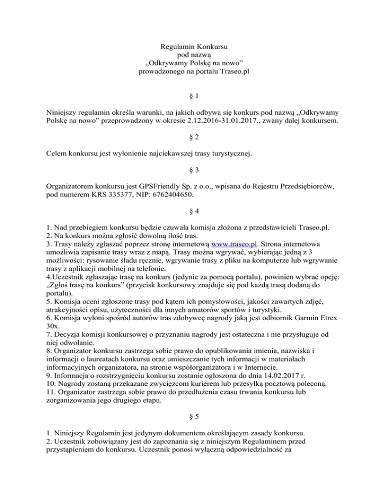 Regulamin Konkursu pod nazwą „Odkrywamy Polskę na nowo” prowadzonego na portalu Traseo.pl §1 Niniejszy regulamin określa warunki, na jakich odbywa się konkurs pod nazwą „Odkrywamy Polskę na nowo” przeprowadzony w okresie 2.12.2016-31.01.2017., zwany dalej konkursem. §2 Celem konkursu jest wyłonienie najciekawszej trasy turystycznej. §3 Organizatorem konkursu jest GPSFriendly Sp. z o.o., wpisana do Rejestru Przedsiębiorców, pod numerem KRS 335377, NIP: 6762404650. §4 1. Nad przebiegiem konkursu będzie czuwała komisja złożona z przedstawicieli Traseo.pl. 2. Na konkurs można zgłosić dowolną ilość tras. 3. Trasy należy zgłaszać poprzez stronę internetową www.traseo.pl. Strona internetowa umożliwia zapisanie trasy wraz z mapą. Trasy można wgrywać, wybierając jedną z 3 możliwości: rysowanie śladu ręcznie, wgrywanie trasy z pliku na komputerze lub wgrywanie trasy z aplikacji mobilnej na telefonie. 4.Uczestnik zgłaszając trasę na konkurs (jedynie za pomocą portalu), powinien wybrać opcję: „Zgłoś trasę na konkurs” (przycisk konkursowy znajduje się pod każdą trasą dodaną do portalu). 5. Komisja oceni zgłoszone trasy pod kątem ich pomysłowości, jakości zawartych zdjęć, atrakcyjności opisu, użyteczności dla innych amatorów sportów i turystyki. 6. Komisja wyłoni spośród autorów tras zdobywcę nagrody jaką jest odbiornik Garmin Etrex 30x. 7. Decyzja komisji konkursowej o przyznaniu nagrody jest ostateczna i nie przysługuje od niej odwołanie. 8. Organizator konkursu zastrzega sobie prawo do opublikowania imienia, nazwiska i informacji o laureatach konkursu oraz umieszczanie tych informacji w materiałach informacyjnych organizatora, na stronie współorganizatora i w Internecie. 9. Informacja o rozstrzygnięciu konkursu zostanie ogłoszona do dnia 14.02.2017 r. 10. Nagrody zostaną przekazane zwycięzcom kurierem lub przesyłką pocztową poleconą. 11. Organizator zastrzega sobie prawo do przedłużenia czasu trwania konkursu lub zorganizowania jego drugiego etapu. §5 1. Niniejszy Regulamin jest jedynym dokumentem określającym zasady konkursu. 2. Uczestnik zobowiązany jest do zapoznania się z niniejszym Regulaminem przed przystąpieniem do konkursu. Uczestnik ponosi wyłączną odpowiedzialność za niezastosowanie się do postanowień niniejszego Regulaminu. 3. Uczestnik konkursu zgadza się na przekazanie swojego loginu na Traseo, imienia, nazwiska oraz swojego adresu mailowego współorganizatorowi konkursu w celu przesyłania drogą elektroniczną treści promocyjnych. Sklep Trigar.pl zobowiązuje się wykorzystywać pozyskane dane zgodnie z Ustawą o ochronie danych osobowych z 29 sierpnia 1997 r. z późniejszymi zmianami. 4. Pracownicy GPSFriendly/ Trigar.pl oraz ich rodziny nie mogą brać udziału w konkursie. 5. Uczestnik poprzez fakt przystąpienia do konkursu akceptuje postanowienia niniejszego Regulaminu. 6. Niniejszy regulamin wchodzi w życie od dnia 2.12.2016 r. ORGANIZATOR GPSFriendly Sp. z o.o.