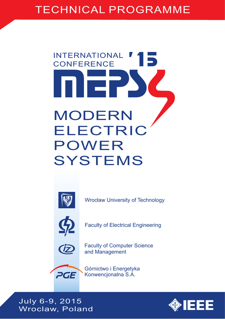 TECHNICAL PROGRAMME INTERNATIONAL CONFERENCE ’15 MODERN ELECTRIC POWER SYSTEMS Wrocław University of Technology Faculty of Electrical Engineering Faculty of Computer Science and Management Górnictwo i Energetyka Konwencjonalna S.A. July 6-9, 2015 Wroclaw, Poland Exhibitors – Sponsors Technical co-sponsored by Hosted by 2 Table of Contents IEEE Technical Co-sponsorship.................................................................................... 4 MEPS 2015 Committees .............................................................................................. 5 Conference Information ................................................................................................ 7 Conference Overview ................................................................................................. 12 Keynote Lectures ........................................................................................................ 13 Technical Programme ................................................................................................ 14 Notes .......................................................................................................................... 24 Maps ........................................................................................................................... 25 3 Technical Co-sponsorship IEEE (Institute of Electrical and Electronics Engineers) is the largest worldwide organization which aim is to support technological development and provide people all over the world possibilities to exchange information about new, important and innovative scientific works and solutions. Having been founded over 130 years ago, nowadays it brings together over 426 thousand members in more than 160 countries which areas of interests focus on computer sciences, telecommunications, electrical engineering, electronics, information technologies and other related and similar domains. The association is divided geographically into 334 local sections in 10 regions. From the thematic point of view, it consists of 39 societies and 6 technical councils that compose 10 technical divisions. IEEE consists of 2116 chapters in which local members (with similar technical interests) are associated. IEEE includes also 2669 student branches at colleges and universities in 80 countries. In order to spread technological knowledge IEEE organizes and sponsors more than 1600 conferences and meetings annually; publishes lots of (about 180) transactions, journals and magazines; and supports student organizations. It also takes part in creating commonly accepted and used international standards (more than 1670 standards and projects under development). Scientific electronic libraries maintained by IEEE (The IEEE Xplore Digital Library) containing over 3,5 million documents are priceless and reliable source of information for scientific workers and students from all over the world. Region 8 was formed in 1963 and now it is one of the largest regions of IEEE both by membership, as well as by the geographical size. It covers the area of Africa, Europe and Middle East. It consists of 56 local sections containing 566 chapters and about 455 student branches which gives the total number of approximately 79 thousand IEEE members. IEEE Poland Section was founded in 1972 and since that time have been one of the most active sections working in the range of Region 8. The section is composed of 18 chapters and 1 affinity group specialized in particular domains and 4 student branches, consisting of both students and graduates, located in Łódź, Opole, Szczecin, and Wrocław. IEEE Poland Section has currently over 1100 members. The community organizes and sponsors many international and national conferences, supports student branches activities, improves the cooperation between professionals. It also sponsors scholarships for standing out students and graduates being the members of the association. More information on subject of IEEE, IEEE Region 8 and IEEE Poland Section is available on web pages: www.ieee.org, www.ieee.org/r8/ and www.ieee.pl respectively. Miroslaw Parol IEEE Poland Section Representative on MEPS’2015 Conference 4 MEPS 2015 Committees Technical Programme Committee Chair: Jan Izykowski, Wroclaw University of Technology, Poland Members: Rene Aid Göran Andersson Janusz Białek Arturo Bretas Teresa Correia de Barros Xinzhou Dong Ivan Dudurych Abdelsalam Elhaffar Istvan Erlich Paolo Falbo Stein-Erik Fleten Marek Florkowski Arif Gashimov Oliver Gherke Tomás Gómez Antonio Gómez-Expósito Zbigniew Hanzelka Tao Hong Piotr Kacejko Takashi Kanamura Bogdan Kasztenny Mladen Kezunovic Anna Kosek Thilo Krause Matti Lehtonen Yuan Liao Tahir Lazimov Carlo Lucheroni Jan Machowski Stefano Massucco Italy Marta Molinas Norway Carlo Alberto Nucci Italy Aydogan Ozdemir Turkey Miroslaw Parol Poland Pierre Pinson Denmark Desire Rasolomampionona Poland Waldemar Rebizant Poland Christian Rehtanz Germany Krzysztof Rudion Germany Murari Mohan Saha Sweden Antans - Saulus Sauhats Latvia Peter Schegner Germany Tomasz Sikorski Poland Marian Sobierajski Poland Jorge Sousa Portugal Paweł Sowa Poland Petro Stakhiv Ukraine Kai Strunz Germany Zbigniew Styczynski Germany Maria Cristina Dias Tavares Brazil Petr Toman Czech Rep. Thierry Van Cutsem Belgium Wolfram Wellßow Germany Rafal Weron Poland Kazimierz Wilkosz Poland Julia Yamnenko Ukraine Inmaculada Zamora Spain France Switzerland Russia Brazil Portugal China Ireland Libya Germany Italy Norway Poland Azerbaijan Denmark Spain Spain Poland USA Poland Japan Canada USA Denmark Switzerland Finland USA Azerbaijan Italy Poland 5 MEPS 2015 Committees Local Organising Committee Chair: Eugeniusz Rosolowski Wroclaw University of Technology (WUT), Poland Members: Bartosz Brusilowicz, WUT Daniel Bejmert, WUT Marcin Habrych, WUT Miroslaw Lukowicz, WUT Piotr Pierz, WUT Krzysztof Solak, WUT Rafal Weron, WUT Grzegorz Wisniewski, WUT Conference Secretariat: Wroclaw Unive