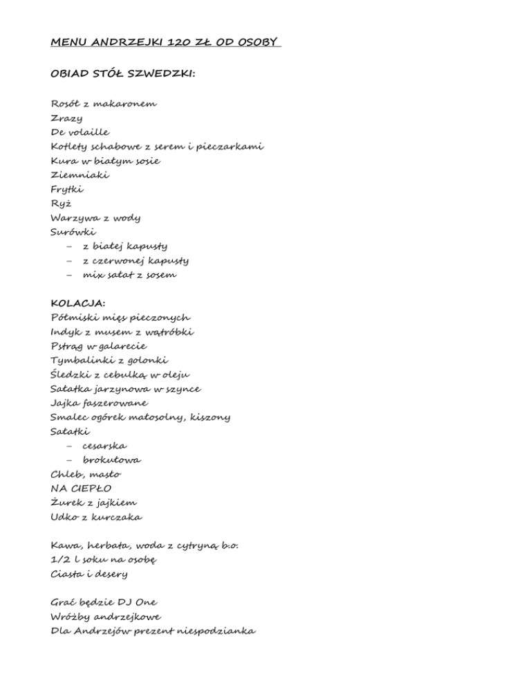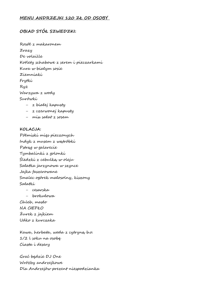 MENU ANDRZEJKI 120 ZŁ OD OSOBY OBIAD STÓŁ SZWEDZKI: Rosół z makaronem Zrazy De volaille Kotlety schabowe z serem i pieczarkami Kura w białym sosie Ziemniaki Frytki Ryż Warzywa z wody Surówki z białej kapusty z czerwonej kapusty mix sałat z sosem KOLACJA: Półmiski mięs pieczonych Indyk z musem z wątróbki Pstrąg w galarecie Tymbalinki z golonki Śledzki z cebulką w oleju Sałatka jarzynowa w szynce Jajka faszerowane Smalec ogórek małosolny, kiszony Sałatki cesarska brokułowa Chleb, masło NA CIEPŁO Żurek z jajkiem Udko z kurczaka Kawa, herbata, woda z cytryną b.o. 1/2 l soku na osobę Ciasta i desery Grać będzie DJ One Wróżby andrzejkowe Dla Andrzejów prezent niespodzianka