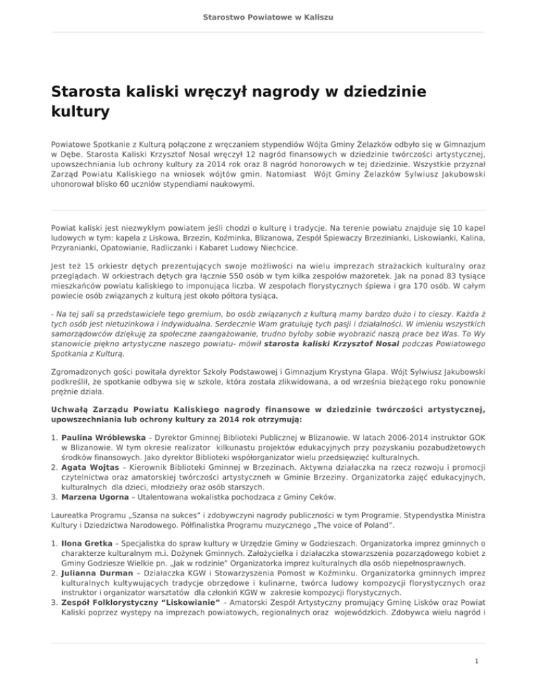 Starostwo Powiatowe w Kaliszu Starosta kaliski wręczył nagrody w dziedzinie kultury Powiatowe Spotkanie z Kulturą połączone z wręczaniem stypendiów Wójta Gminy Żelazków odbyło się w Gimnazjum w Dębe. Starosta Kaliski Krzysztof Nosal wręczył 12 nagród finansowych w dziedzinie twórczości artystycznej, upowszechniania lub ochrony kultury za 2014 rok oraz 8 nagród honorowych w tej dziedzinie. Wszystkie przyznał Zarząd Powiatu Kaliskiego na wniosek wójtów gmin. Natomiast Wójt Gminy Żelazków Sylwiusz Jakubowski uhonorował blisko 60 uczniów stypendiami naukowymi. Powiat kaliski jest niezwykłym powiatem jeśli chodzi o kulturę i tradycje. Na terenie powiatu znajduje się 10 kapel ludowych w tym: kapela z Liskowa, Brzezin, Koźminka, Blizanowa, Zespół Śpiewaczy Brzezinianki, Liskowianki, Kalina, Przyranianki, Opatowianie, Radliczanki i Kabaret Ludowy Niechcice. Jest też 15 orkiestr dętych prezentujących swoje możliwości na wielu imprezach strażackich kulturalny oraz przeglądach. W orkiestrach dętych gra łącznie 550 osób w tym kilka zespołów mażoretek. Jak na ponad 83 tysiące mieszkańców powiatu kaliskiego to imponująca liczba. W zespołach florystycznych śpiewa i gra 170 osób. W całym powiecie osób związanych z kulturą jest około półtora tysiąca. - Na tej sali są przedstawiciele tego gremium, bo osób związanych z kulturą mamy bardzo dużo i to cieszy. Każda ż tych osób jest nietuzinkowa i indywidualna. Serdecznie Wam gratuluję tych pasji i działalności. W imieniu wszystkich samorządowców dziękuję za społeczne zaangażowanie, trudno byłoby sobie wyobrazić naszą prace bez Was. To Wy stanowicie piękno artystyczne naszego powiatu- mówił starosta kaliski Krzysztof Nosal podczas Powiatowego Spotkania z Kulturą. Zgromadzonych gości powitała dyrektor Szkoły Podstawowej i Gimnazjum Krystyna Glapa. Wójt Sylwiusz Jakubowski podkreślił, że spotkanie odbywa się w szkole, która została zlikwidowana, a od września bieżącego roku ponownie prężnie działa. Uchwałą Zarządu Powiatu Kaliskiego nagrody finansowe w dziedzinie twórczości artystycznej, upowszechniania lub ochrony kultury za 2014 rok otrzymują: 1. Paulina Wróblewska – Dyrektor Gminnej Biblioteki Publicznej w Blizanowie. W latach 2006-2014 instruktor GOK w Blizanowie. W tym okresie realizator kilkunastu projektów edukacyjnych przy pozyskaniu pozabudżetowych środków finansowych. Jako dyrektor Biblioteki współorganizator wielu przedsięwzięć kulturalnych. 2. Agata Wojtas – Kierownik Biblioteki Gminnej w Brzezinach. Aktywna działaczka na rzecz rozwoju i promocji czytelnictwa oraz amatorskiej twórczości artystyczneh w Gminie Brzeziny. Organizatorka zajęć edukacyjnych, kulturalnych dla dzieci, młodzieży oraz osób starszych. 3. Marzena Ugorna – Utalentowana wokalistka pochodzaca z Gminy Ceków. Laureatka Programu „Szansa na sukces” i zdobywczyni nagrody publiczności w tym Programie. Stypendystka Ministra Kultury i Dziedzictwa Narodowego. Półfinalistka Programu muzycznego „The voice of Poland”. 1. Ilona Gretka – Specjalistka do spraw kultury w Urzędzie Gminy w Godzieszach. Organizatorka imprez gminnych o charakterze kulturalnym m.i. Dożynek Gminnych. Założycielka i działaczka stowarzszenia pozarządowego kobiet z Gminy Godziesze Wielkie pn. „Jak w rodzinie” Organizatorka imprez kulturalnych dla osób niepełnosprawnych. 2. Julianna Durman – Działaczka KGW i Stowarzyszenia Pomost w Koźminku. Organizatorka gminnych imprez kulturalnych kultywujących tradycje obrzędowe i kulinarne, twórca ludowy kompozycji florystycznych oraz instruktor i organizator warsztatów dla członkiń KGW w zakresie kompozycji florystycznych. 3. Zespół Folklorystyczny “Liskowianie” – Amatorski Zespół Artystyczny promujący Gminę Lisków oraz Powiat Kaliski poprzez występy na imprezach powiatowych, regionalnych oraz wojewódzkich. Zdobywca wielu nagród i 1 Starostwo Powiatowe w Kaliszu wyróżnień. Kultywuje tradycje ludowe regionu kaliskiego. 4. Karol Matczak – Kolekcjoner unikalnych zbiorów militarnych. Aktywny działacz ZHP, Członek Ogólnopolskiego Klubu Traktor i Maszyna w Lipnie, Członek Grupy Rekonstrukcji Historycznej 155 IR Ostrów Wielkopolski, Współorganizator wielu imprez historycznych i etnograficznych. 5. Zespół Śpiewaczy “Ale Babki” z Kościelca -Uczestnik oraz współorganizator imprez gminnych oraz regionalnych mających na celu upowszechnianie kultury: Spotkania z piosenką i muzyką ludową, Festynu rodzinnego z okazji Dnia Dziecka, Festynu Rychwalia, Nocy Świętojańskiej w Głogowie (gm. Władysławów) oraz wielu innych uroczystości. 6. Kapela Ludowa “Sami Swoi” z Opatówka -Uczestnik gminnych uroczystości wydarzeń kulturalnych oraz innych spotkań o charakterze kulturalnym m.in. Przeglądów orkiestr dętych, Dni Seniora. Uczestnik oraz zdobywca II miejsca na Przeglądzie Kapel Ludowych z Polski Centralnej w Sieradzu. 7. Józef Janusz Wlazło –Artysta, twórca ludowy, rzeźbiarz ze Zbierska. Jego prace zdobią publiczne instytucje na terenie gminy Stawiszyn m.in. pamiatkowa tablica nadania Gimnazjum w Stawiszynie imienia Polskich Olimpijczyków, tablica z okazji jubileuszu 60 lecia powstania przedszkola w Zbiersku, okolicznościowa tablica dla Szkoły Podstawowej w Zbiersku. 8. Katarzyna Kubera –Instruktor marżonetek przy orkiestrze dętej OSP Iwanowice. Od 3 lat pracuje społecznie, będąc instruktorem ma wpływ na wychowanie młodzieży a przede wszystkim zamiłowania do kultury. 9. Marcin Nowotny – Kapelmistrz Orkiestry Dętej OSP w Tykadłowie. Aktywny propagator wśród dzieci i młodzieży amatorskiego ruchu muzycznego. Wraz z Orkiestrą Dętą OSP Tykadłów aktywnie uczestniczy w uroczystościach i imprezach lokalnych oraz wszelkiego rodzaju przeglądach orkiestr dętych. Zdobywca wraz z Orkiestrą wielu nagród i wyróżnień m.in. w 2014 r. III miejsce na Wojewó