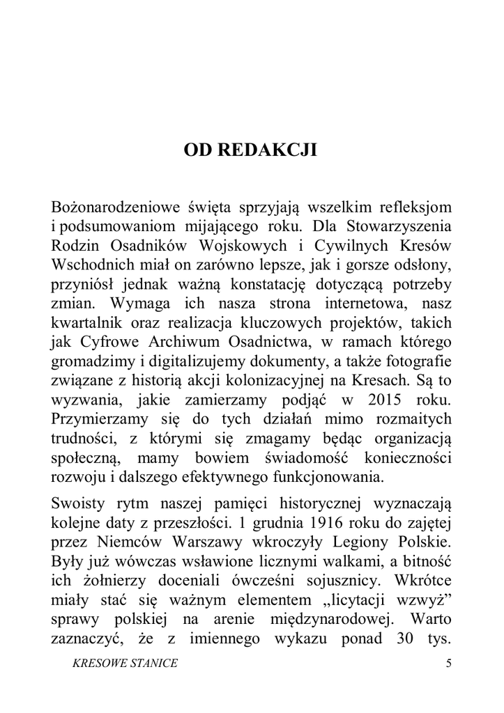 OD REDAKCJI Bożonarodzeniowe święta sprzyjają wszelkim refleksjom i podsumowaniom mijającego roku. Dla Stowarzyszenia Rodzin Osadników Wojskowych i Cywilnych Kresów Wschodnich miał on zarówno lepsze, jak i gorsze odsłony, przyniósł jednak ważną konstatację dotyczącą potrzeby zmian. Wymaga ich nasza strona internetowa, nasz kwartalnik oraz realizacja kluczowych projektów, takich jak Cyfrowe Archiwum Osadnictwa, w ramach którego gromadzimy i digitalizujemy dokumenty, a także fotografie związane z historią akcji kolonizacyjnej na Kresach. Są to wyzwania, jakie zamierzamy podjąć w 2015 roku. Przymierzamy się do tych działań mimo rozmaitych trudności, z którymi się zmagamy będąc organizacją społeczną, mamy bowiem świadomość konieczności rozwoju i dalszego efektywnego funkcjonowania. Swoisty rytm naszej pamięci historycznej wyznaczają kolejne daty z przeszłości. 1 grudnia 1916 roku do zajętej przez Niemców Warszawy wkroczyły Legiony Polskie. Były już wówczas wsławione licznymi walkami, a bitność ich żołnierzy doceniali ówcześni sojusznicy. Wkrótce miały stać się ważnym elementem „licytacji wzwyż” sprawy polskiej na arenie międzynarodowej. Warto zaznaczyć, że z imiennego wykazu ponad 30 tys. KRESOWE STANICE 5 legionistów wynika, iż najwięcej ich rekrutowało się ze Lwowa. Ale również z innych miast kresowych rzecz jasna, z Galicji Wschodniej wywodziło się wielu żołnierzy tej formacji. Były to głównie: Stanisławów, Stryj, Sambor, Kołomyja i Tarnopol. 21 grudnia 1939 roku na anektowanych przez ZSRS Kresach Wschodnich definitywnie wycofano z obiegu złotego. Zastąpiono go rublem przy jednoczesnym zakazaniu wymiany polskiej waluty na sowiecką. Wcześniej wartość obu zrównano, wprowadzając wymienialność 1:1, co umożliwiało okupantom sztucznie zwielokrotnić siłę nabywczą pieniędzy przywiezionych z „ojczyzny proletariatu”. 24 grudnia 1944 roku w Ihrowicy na Podolu UPA zamordowała 89 Polaków. Na zajętych przez Armię Czerwoną terenach przedwojennego województwa tarnopolskiego sotnia Iwana Szemczyszyna, wspomagana przez oddział Samoobronni Kuszczowi Widdiły oraz chłopów ukraińskich, zaatakowała miejscowość w noc wigilijną. Polscy mieszkańcy wsi zaalarmowani przez miejscowego księdza biciem w dzwony uciekali lub kryli się u ukraińskich sąsiadów, z których co najmniej trzech udzieliło im schronienia. Większość Polaków jednak zginęła. Wigilijny wieczór, zawsze bliski sercom Polaków, w naszej zagmatwanej historii niejednokrotnie był celebrowany w ciężkich warunkach i tragicznych okolicznościach. Spełniał więc on nie tylko rolę święta religijnego, ale też bywał aktem nadziei, którym 6 KRESOWE STANICE manifestowali swoją polskość i tym, co pomagało Polakom zachować wiarę i przetrwać nawet w najbardziej skrajnych warunkach. Zapraszamy do zapoznania się z zamieszczonym w numerze interesującym w kontekście Bożego Narodzenia artykułem o Wigilii Polaków na zesłaniu. W bieżącym numerze naszego kwartalnika polecamy również uwadze Czytelników artykuł Mariusza Olczaka o wojennych losach księdza Jakuba Dymitrowskiego, zobrazowany wyborem fragmentów jego dziennika. Ponadto zachęcamy do lektury tekstu Włodzimierza Kaniewskiego o bliskim osadniczemu środowisku poecie Zygmuncie Rumlu oraz Michała Bronowickiego o początkach budowy stanic Korpusu Ochrony Pogranicza, a także do zapoznania się z historią wykluczenia ZSRS z Ligi Narodów opisaną przez Antoniego Lenkiewicza. Zwracamy również uwagę na tekst Tadeusza Trąbskiego dotyczący paktu Ribbentrop-Mołotow oraz opis działalności ważnej ze względu na swój profil wśród organizacji trzeciego sektora Fundacji Solidarność-Wschód, którą przybliża na łamach naszego kwartalnika Czesław Skarżyński. Jak zwykle pragniemy równocześnie zaciekawić stałymi rubrykami i kontynuacją publikowanych już wcześniej materiałów. Wszystkim Czytelnikom życzymy przy tym wesołych świąt! Redakcja KRESOWE STANICE 7