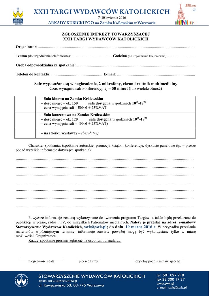 XXII TARGI WYDAWCÓW KATOLICKICH 7-10 kwietnia 2016 ARKADY KUBICKIEGO na Zamku Królewskim w Warszawie ZGŁOSZENIE IMPREZY TOWARZYSZĄCEJ XXII TARGI WYDAWCÓW KATOLICKICH Organizator: ................................................................................................................................................................... Termin (do uzgodnienia telefoniczne):.............................................. Godzina (do uzgodnienia telefonicznie): ............................ Osoba odpowiedzialna za spotkanie: ........................................................................................................................... Telefon do kontaktu: ..................................................... E-mail: ................................................................................. Sale wyposażone są w nagłośnienie, 2 mikrofony, ekran i rzutnik multimedialny Czas wynajmu sali konferencyjnej – 50 minut (lub wielokrotność) – Sala kinowa na Zamku Królewskim – ilość miejsc – ok. 150 sala dostępna w godzinach 1000-1800 – cena wynajęcia sali – 500 zł + 23%VAT – Sala koncertowa na Zamku Królewskim – ilość miejsc – ok. 120 sala dostępna w godzinach 1000-1800 – cena wynajęcia sali – 400 zł + 23%VAT) – na stoisku wystawcy – (bezpłatne) Charakter spotkania: (spotkanie autorskie, promocja książki, konferencje, dyskusje panelowe itp. – proszę podać wszelkie informacje dotyczące spotkania): ......................................................................................................................................................................... ......................................................................................................................................................................... ......................................................................................................................................................................... ......................................................................................................................................................................... ......................................................................................................................................................................... ......................................................................................................................................................................... ......................................................................................................................................................................... Powyższe informacje zostaną wykorzystane do tworzenia programu Targów, a także będą przekazane do publikacji w prasie, radiu i TV, do wszystkich Patronatów medialnych. Należy je przesłać na adres: e-mailowy Stowarzyszenie Wydawców Katolickich, [email protected]; do dnia 19 marca 2016 r. W przypadku przesłania materiałów w późniejszym terminie, informacje zawarte powyżej mogą być wykorzystane tylko w miarę możliwości Organizatora. Każde spotkanie prosimy zgłaszać na osobnym formularzu. _________________________ miejscowość i data _____________ pieczęć firmy ____________________________ czytelny podpis zamawiającego