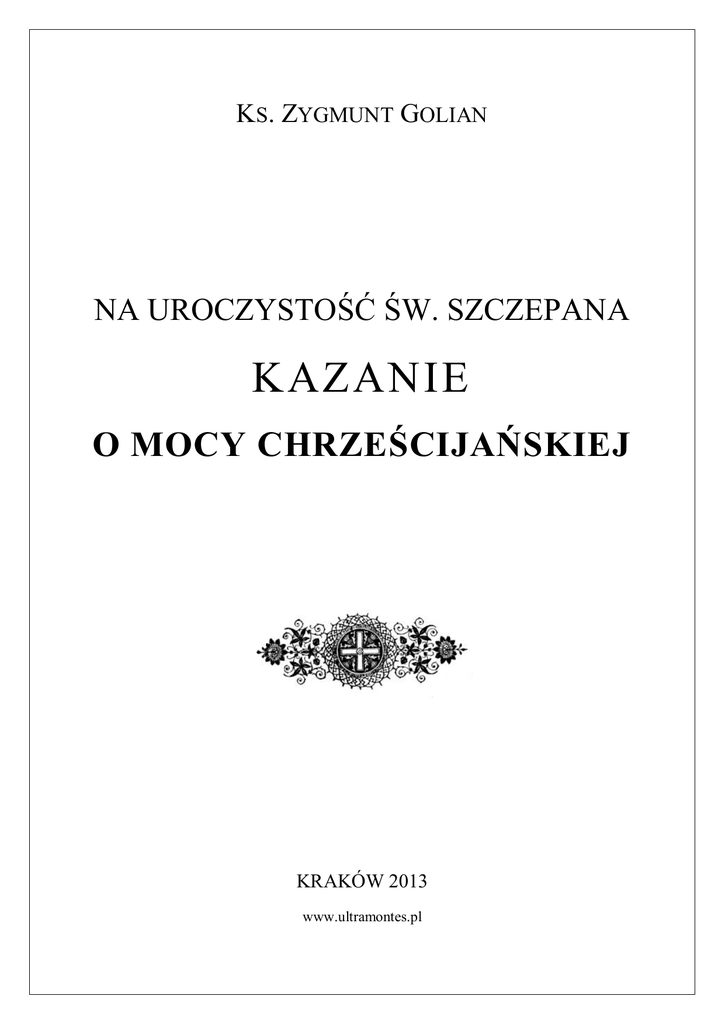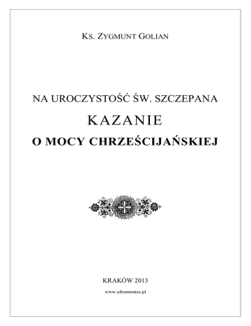 KS. ZYGMUNT GOLIAN NA UROCZYSTOŚĆ ŚW. SZCZEPANA KAZANIE O MOCY CHRZEŚCIJAŃSKIEJ KRAKÓW 2013 www.ultramontes.pl SPIS TREŚCI Str. Wstęp: Czemu dzisiaj ta ewangelia. – Groźba nie usłuchana sprawuje pustkę u Żydów. – I my możem się stać pustką. – Większa ruina nasza. – Dziś [się] zastanówmy jak przez moc odbudować się mamy, rozważając w Szczepanie św. 1° skąd źródło tej mocy, 2° jej istotę i działanie ................................................. 3 Część I. 1. Widok Szczepana zachęcający – moc nam potrzebna – wielka. – 2. Moc ta z wiary płynie. – 3. Szczepan pełen wiary – czym to pokazuje. – 4. Zawsze tu walczyć potrzeba. – 5. Oburzenie wrogów na Szczepana. – 6. Podjudzenie starszych i skrybów przeciw niemu – to samo i dzisiaj się dzieje. – 7. Zarzut bluźnierstwa i zdrady kraju – wartość opinii zbiorowej – powszechnej. – 8. Gniew patrzących na Szczepana św. – 9. Spokój jego wśród kamienowania. – 10. Zdobywa Pawła – nauka św. Pawła o wierze ............................................. 4 Część II. 1. Bóg jest mocą i wszystkie swoje dzieła nią nacechował. – 2. Człowiek potęgą i siłą świata – jako najwyższe stworzenie. – 3. Człowiek odzwierciedleniem mocy Bożej, ma na duszy obraz Bożej wielkości i piękna – darem więc Boga moc. – 4. Ma być cnotą. Bóg na to zstąpił, by go mocą swoją spotężnić. – 5. Moc na co dana. – 6. Jak się ma objawiać w znoszeniu cierpień. – 7. Znoszenie większy akt niż działanie, bo ciągłe, bo obecnego, bo długo ...... 10 Domówienie. Takiej mocy nam najwięcej potrzeba. – Niech widzenie z wiary Boga nas pokrzepia w tym ................................................................................ 13 ––––––––––– 2 Na Uroczystość św. Szczepana KAZANIE O mocy chrześcijańskiej (1) KS. ZYGMUNT GOLIAN ––––––– "Oto wam zostanie dom wasz pusty, albowiem powiadam wam nie ujrzycie mnie odtąd aż rzeczecie: Błogosławiony, który idzie w Imię Pańskie". (Mt. XXIII, 38-39). Czemu dzisiaj Kościół czyta nam te straszne słowa? Słuszna, że w Adwencie czytał nam o głosie wołającego na puszczy, bo póki na tę ziemię nie zstąpił Bóg-człowiek, ziemia była wielką puszczą, łez doliną, krainą śmierci, ale teraz, gdy jesteśmy wśród najweselszych świąt, gdy obchodzimy właśnie pamiątkę narodzenia Zbawiciela; gdy już zajaśniał "Wschód z wysokości" (2), gdyśmy już ujrzeli światłość i życie nasze, gdy zamieszkał wpośród nas pełen łaski i prawdy, czemu dzisiaj ta groźba zapowiadająca pustkę? Jezus Chrystus tak miłował Jeruzalem, czemuż jej tak strasznie pogroził? Lud żydowski, to lud Jego, czemuż nań rzuca tę klątwę? "Oto wam zostanie dom wasz pusty!" (3). "Bo przyszedł do własności, a swoi Go nie przyjęli" (4). On chciał dom życiem napełnić, ale dom nie chciał: "Ilekroć chciałem zgromadzić syny twoje, jako kokosz kurczęta swoje pod skrzydła zgromadza, a nie chciałoś" (5). Nie, to nie klątwa. On ostrzega tylko, jakie są nieuniknione następstwa stawiania oporu miłościwej woli Jego. On przyszedł z błogosławieństwem, ale chce, aby Go dobrowolnie przyjęto. Chce dać życie, to jest samego siebie, ale tych, których stworzył wolnymi, nie chce czynić gwałtu, nie chce się narzucać, więc powiada: Ja chciałem, o Jeruzalem – aleś ty nie chciała, "przeto wam zostanie dom wasz pusty", póki mnie sami nie przyjmiecie jako dawcę życia i błogosławieństwa, aż rzeczecie: "błogosławiony, który idzie w Imię Pańskie" (6). Próżne napomnienie! Naród własny przyjąć Go nie chciał, więc został domem, narodem, ale domem pustym. 3 I do nas Pan Jezus przychodzi z pełnością swoich błogosławieństw, przynosi pokój, którego świat dać nie może, ale "pokój ludziom dobrej woli" (7). Jak najwspanialszy gmach skutkiem wojny staje się przerażającą pustką, tak i najwspanialsze stworzenie, człowiek – dom Boskimi wzniesiony rękami, o którym Job: "Co jest człowiek, iż go wielmożysz" (8) i Psalmista: "postanowiłeś go nad dziełami rąk Twoich" (9), tak i sam chrześcijanin, dla którego odbudowania i wzniesienia aż do nieba, Stwórca zstąpił z nieba; jakkolwiek wspaniałym jest gmachem, skutkiem oporu swej woli stawianego woli Boskiej, staje się smutną, przerażającego wśród wszystkiego stworzenia pustką i ruiną. Im ogromniejszy i piękniejszy gmach, tym z niego straszliwsza ruina. Dreszcz cię przejmuje, gdy staniesz wśród przepysznych ruin pogańskiego Rzymu. Umysł truchleje, gdy rozmyśla o tej przez lat dwa tysiące tułającej się ruinie, która się zowie narodem żydowskim, lecz aniołowie tylko rozumieć mogą i godnie opłakać tę ruinę ruin, jaką jest społeczność chrześcijańska bez Chrystusa, jaką jest chrześcijanin, który się wyzbył Chrystusa i który mimo wszystkich nawoływań miłościwej Jego woli, nie zaprosił Go i nie przyjął dobrą swoją wolą. Jeżeli każda wielka ruina, jest sterczącym świadectwem wielkiej siły i wielkiej słabości, tedy któż ogarnie i wypowie, czym jest ruina chrześcijańskiej duszy, którą Bóg człowiek miał naprawić ruinę, sprawioną upadkiem aniołów, a która zamiast tę wielką szczerbę w niebiesiech zapełnić jak zapowiada Psalmista: "napełni upaści" (10), pomnaża ruiny piekielne! Kiedy więc Kościół z powodu święta narodzin Jezusa Chrystusa przypomina nam radośnie, że On przyszedł dla nas i dla naszego zbawienia propter nos homines et propter nostram salutem, słusznie, że dzisiaj stawiając nam przed oczyma nieszczęście Izraela, który nie przyjął, odepchnął przychodzącego w imię Pańskie, i został jako dom pusty, przeraża serca nasze pogróżką Zbawicielową, a zarazem przypomina, czym staliśmy się ruiną i czym się odbudować możem, co na nas sprowadziło ostateczną słabość i n