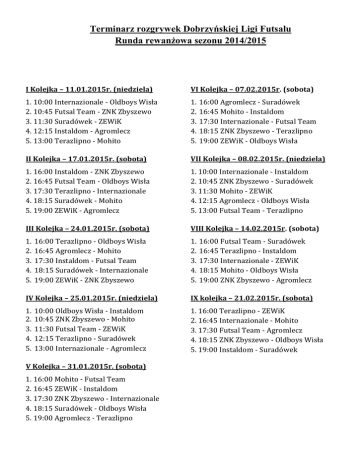 Terminarz rozgrywek Dobrzyńskiej Ligi Futsalu Runda rewanżowa sezonu 2014/2015 I Kolejka – 11.01.2015r. (niedziela) VI Kolejka – 07.02.2015r. (sobota) 1. 10:00 Internazionale - Oldboys Wisła 2. 10:45 Futsal Team - ZNK Zbyszewo 3. 11:30 Suradówek - ZEWiK 4. 12:15 Instaldom - Agromlecz 5. 13:00 Terazlipno - Mohito 1. 2. 3. 4. 5. II Kolejka – 17.01.2015r. (sobota) VII Kolejka – 08.02.2015r. (niedziela) 1. 16:00 Instaldom - ZNK Zbyszewo 2. 16:45 Futsal Team - Oldboys Wisła 3. 17:30 Terazlipno - Internazionale 4. 18:15 Suradówek - Mohito 5. 19:00 ZEWiK - Agromlecz 1. 10:00 Internazionale - Instaldom 2. 10:45 ZNK Zbyszewo - Suradówek 3. 11:30 Mohito - ZEWiK 4. 12:15 Agromlecz - Oldboys Wisła 5. 13:00 Futsal Team - Terazlipno III Kolejka – 24.01.2015r. (sobota) VIII Kolejka – 14.02.2015r. (sobota) 1. 2. 3. 4. 5. 1. 2. 3. 4. 5. 16:00 Terazlipno - Oldboys Wisła 16:45 Agromlecz - Mohito 17:30 Instaldom - Futsal Team 18:15 Suradówek - Internazionale 19:00 ZEWiK - ZNK Zbyszewo 16:00 Agromlecz - Suradówek 16:45 Mohito - Instaldom 17:30 Internazionale - Futsal Team 18:15 ZNK Zbyszewo - Terazlipno 19:00 ZEWiK - Oldboys Wisła 16:00 Futsal Team - Suradówek 16:45 Terazlipno - Instaldom 17:30 Internazionale - ZEWiK 18:15 Mohito - Oldboys Wisła 19:00 ZNK Zbyszewo - Agromlecz IV Kolejka – 25.01.2015r. (niedziela) IX kolejka – 21.02.2015r. (sobota) 1. 2. 3. 4. 5. 1. 16:00 Terazlipno - ZEWiK 2. 16:45 Internazionale - Mohito 3. 17:30 Futsal Team - Agromlecz 4. 18:15 ZNK Zbyszewo - Oldboys Wisła 5. 19:00 Instaldom - Suradówek 10:00 Oldboys Wisła - Instaldom 10:45 ZNK Zbyszewo - Mohito 11:30 Futsal Team - ZEWiK 12:15 Terazlipno - Suradówek 13:00 Internazionale - Agromlecz V Kolejka – 31.01.2015r. (sobota) 1. 16:00 Mohito - Futsal Team 2. 16:45 ZEWiK - Instaldom 3. 17:30 ZNK Zbyszewo - Internazionale 4. 18:15 Suradówek - Oldboys Wisła 5. 19:00 Agromlecz - Terazlipno