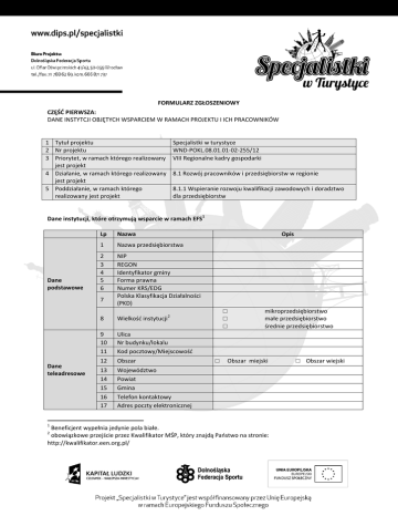FORMULARZ ZGŁOSZENIOWY CZĘŚĆ PIERWSZA: DANE INSTYTCJI OBJĘTYCH WSPARCIEM W RAMACH PROJEKTU I ICH PRACOWNIKÓW 1 Tytuł projektu 2 Nr projektu 3 Priorytet, w ramach którego realizowany jest projekt 4 Działanie, w ramach którego realizowany jest projekt 5 Poddziałanie, w ramach którego realizowany jest projekt Specjalistki w turystyce WND-POKL.08.01.01-02-255/12 VIII Regionalne kadry gospodarki 8.1 Rozwój pracowników i przedsiębiorstw w regionie 8.1.1 Wspieranie rozwoju kwalifikacji zawodowych i doradztwo dla przedsiębiorstw Dane instytucji, które otrzymują wsparcie w ramach EFS Dane podstawowe Lp Nazwa 1 Nazwa przedsiębiorstwa 2 3 4 5 6 NIP REGON Identyfikator gminy Forma prawna Numer KRS/EDG Polska Klasyfikacja Działalności (PKD) 7 Dane teleadresowe 1 1 Opis □ □ □ 2 8 Wielkość instytucji 9 10 11 Ulica Nr budynku/lokalu Kod pocztowy/Miejscowość 12 Obszar 13 14 15 16 17 Województwo Powiat Gmina Telefon kontaktowy Adres poczty elektronicznej □ mikroprzedsiębiorstwo małe przedsiębiorstwo średnie przedsiębiorstwo Obszar miejski Beneficjent wypełnia jedynie pola białe. obowiązkowe przejście przez Kwalifikator MŚP, który znajdą Państwo na stronie: http://kwalifikator.een.org.pl/ 2 □ Obszar wiejski Szczegóły wsparcia 18 19 Rodzaj przyznanego wsparcia Liczba osób objętych wsparciem w ramach instytucji szkolenia Oświadczam, iż firma: - prowadzi działalność gospodarczą na obszarze województwa dolnośląskiego, - prowadzą działalność w oparciu o wymienioną klasyfikację działalności (PKD) 1. 79.12.Z – Działalność organizatorów turystyki 2. 79.11.B – Działalność pośredników turystycznych 3. 79.11.A – Działalność agentów turystycznych 4. 79.90.A – Działalność pilotów wycieczek i przewodników turystycznych 5. 79.90.B – Działalność w zakresie informacji turystycznej 6. 79.90.C – Pozostała działalność usługowa w zakresie rezerwacji, gdzie indziej nieklasyfikowana 7. 55.10.Z – Hotele i podobne obiekty zakwaterowania 8. 55.90.Z – Pozostałe zakwaterowanie 9. 55.20.Z - Obiekty noclegowe turystyczne i miejsca krótkotrwałego zakwaterowania 10. 55.30.Z - Pola kempingowe (włączając pola dla pojazdów kempingowych) i pola namiotowe 11. 93.29.Z - Pozostała działalność rozrywkowa i rekreacyjna 12. 82.30.Z - Działalność związana z organizacją targów, wystaw i kongresów 13. 56.10.A - Restauracje i inne stałe placówki gastronomiczne 14. 56.10.B - Ruchome placówki gastronomiczne 15. 56.21.Z - Przygotowywanie i dostarczanie żywności dla odbiorców zewnętrznych (katering) 16. 56.29.Z - Pozostała usługowa działalność gastronomiczna 17. 85.51.Z - Pozaszkolne formy edukacji sportowej oraz zajęć sportowych i rekreacyjnych 18. 68.20.Z - Wynajem i zarządzanie nieruchomościami własnymi lub dzierżawionymi 19. 56.30.Z - Przygotowywanie i podawanie napojów - nie należy do sektora górnictwa węgla, nie pozostaje pod zarządem komisarycznym, nie znajduje się w toku likwidacji, postępowania upadłościowego i postępowania naprawczego. Oświadczam, że zgłoszone pracownice* - wykonują swoją pracę na terenie województwa dolnośląskiego, - są zatrudnione na umowę o pracę, powołania, wyboru, mianowania lub spółdzielczej umowy o pracę - zostały oddelegowane na szkolenia Oświadczam, że jestem osobą samozatrudnioną i wykonuję swoją pracę na terenie województwa dolnośląskiego* Uprzedzony/a o odpowiedzialności za złożenie nieprawdziwego oświadczenia lub zatajenie prawdy, niniejszym oświadczam, że ww. dane są zgodne z prawdą. Data i podpis osoby upoważnionej do reprezentowania Wnioskodawcy …….……………… pieczęć firmy …………………………... *niepotrzebne skreślić Tabela - Dane uczestniczek projektu Lp 1 2 3 4 5 3 Nazwa Imię (imiona) Nazwisko PESEL Zajmowane stanowisko Forma zatrudnienia Dane uczestnika Wykształcenie 7 Telefon Adres poczty elektronicznej (e-mail) Ulica Nr domu/lokalu Miejscowość Obszar □ Kod pocztowy Województwo Powiat Ulica Nr domu/lokalu Miejscowość Obszar Kod pocztowy Województwo Powiat Adres zameldowania Adres do korespondencji (o ile inny niż zameldowania) 3 9 10 11 12 13 14 15 16 17 18 19 20 21 22 □ □ □ □ □ □ umowa o pracę na podstawie mianowania umowa o pracę na podstawie powołania umowa o pracę na podstawie wyboru spółdzielcza umowa o pracę umowa o pracę osoba samozatrudniona Brak Podstawowe Gimnazjalne Ponadgimnazjalne Pomaturalne Wyższe 6 8 Opis Tabelę należy powielić dla każdej zgłaszanej osoby Obszar miejski □ Obszar wiejski □ Szkolenia 23 Wybór szkoleń 4 □ □ Zarządzanie firmą oraz źródłem finansowania w turystyce Tworzenie i administracja stron internetowych Negocjacje i sprzedaż produktu turystycznego Motywacja do udziału w 24 projekcie oraz możliwość wykorzystania umiejętności oraz wiedzy nabytej w trakcie szkoleń (krótkie uzasadnienie) Oświadczam, że: - wyrażam zgodę na uczestnictwo w projekcie oraz jestem uprawniona do uczestnictwa w projekcie, - będę aktywnie uczestniczyć we wszystkich zajęciach w ramach projektu - zostałam poinformowana, że projekt jest współfinansowany ze środków Unii Europejskiej w ramach Europejskiego Funduszu Społecznego oraz w ramach współfinansowania krajowego z budżetu państwa, - mam świadomość, że szkolenie może odbywać się w miejscowości innej od mojego miejsca zamieszkania, - wyrażam zgodę na udział w badaniu ankietowym, które odbędzie się przed rozpoczęciem i po zakończeniu udziału w szkoleniu/projekcie. Wyrażam zgodę na wprowadzenie do bazy danych i przetwarzanie moich danych osobowych obecnie i w przyszłości przez Dolnośląską Federację Sportu lub upoważnioną instytucję (zgodnie z przepisami ustawy z dnia 29 sierpnia 1997 r. o ochronie danych osobowych – Dz. U. nr 101 z 2002 r. poz. 926 z późniejszymi zmianami) – w celach związanych z rekrutacją, monitoringiem, kon