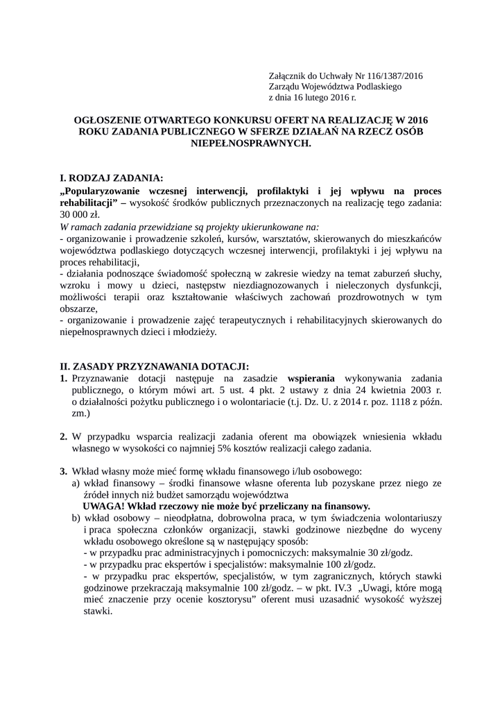Załącznik do Uchwały Nr 116/1387/2016 Zarządu Województwa Podlaskiego z dnia 16 lutego 2016 r. OGŁOSZENIE OTWARTEGO KONKURSU OFERT NA REALIZACJĘ W 2016 ROKU ZADANIA PUBLICZNEGO W SFERZE DZIAŁAŃ NA RZECZ OSÓB NIEPEŁNOSPRAWNYCH. I. RODZAJ ZADANIA: „Popularyzowanie wczesnej interwencji, profilaktyki i jej wpływu na proces rehabilitacji” – wysokość środków publicznych przeznaczonych na realizację tego zadania: 30 000 zł. W ramach zadania przewidziane są projekty ukierunkowane na: - organizowanie i prowadzenie szkoleń, kursów, warsztatów, skierowanych do mieszkańców województwa podlaskiego dotyczących wczesnej interwencji, profilaktyki i jej wpływu na proces rehabilitacji, - działania podnoszące świadomość społeczną w zakresie wiedzy na temat zaburzeń słuchy, wzroku i mowy u dzieci, następstw niezdiagnozowanych i nieleczonych dysfunkcji, możliwości terapii oraz kształtowanie właściwych zachowań prozdrowotnych w tym obszarze, - organizowanie i prowadzenie zajęć terapeutycznych i rehabilitacyjnych skierowanych do niepełnosprawnych dzieci i młodzieży. II. ZASADY PRZYZNAWANIA DOTACJI: 1. Przyznawanie dotacji następuje na zasadzie wspierania wykonywania zadania publicznego, o którym mówi art. 5 ust. 4 pkt. 2 ustawy z dnia 24 kwietnia 2003 r. o działalności pożytku publicznego i o wolontariacie (t.j. Dz. U. z 2014 r. poz. 1118 z późn. zm.) 2. W przypadku wsparcia realizacji zadania oferent ma obowiązek wniesienia wkładu własnego w wysokości co najmniej 5% kosztów realizacji całego zadania. 3. Wkład własny może mieć formę wkładu finansowego i/lub osobowego: a) wkład finansowy – środki finansowe własne oferenta lub pozyskane przez niego ze źródeł innych niż budżet samorządu województwa UWAGA! Wkład rzeczowy nie może być przeliczany na finansowy. b) wkład osobowy – nieodpłatna, dobrowolna praca, w tym świadczenia wolontariuszy i praca społeczna członków organizacji, stawki godzinowe niezbędne do wyceny wkładu osobowego określone są w następujący sposób: - w przypadku prac administracyjnych i pomocniczych: maksymalnie 30 zł/godz. - w przypadku prac ekspertów i specjalistów: maksymalnie 100 zł/godz. - w przypadku prac ekspertów, specjalistów, w tym zagranicznych, których stawki godzinowe przekraczają maksymalnie 100 zł/godz. – w pkt. IV.3 „Uwagi, które mogą mieć znaczenie przy ocenie kosztorysu” oferent musi uzasadnić wysokość wyższej stawki. 4. Oferent poświadcza wniesienie wkładu osobowego za pomocą wzoru „Porozumienia o wykonaniu pracy wolontarystycznej”, stanowiącego załącznik do oferty na realizację zadania publicznego. 5. Wnioskowana kwota dotacji na realizacje zadania nie może przekroczyć 5 000 zł. III. PODMIOTY UPRAWNIONE DO SKŁADANIA OFERT: 1. Organizacje pozarządowe w rozumieniu ustawy z dnia 24 kwietnia 2003 r. o działalności pożytku publicznego i o wolontariacie (t.j. Dz. U. z 2014 r. poz. 1118 z późn. zm.), 2. Podmioty wymienione w art. 3 ust. 3 ustawy z dnia 24 kwietnia 2003 r. o działalności pożytku publicznego i o wolontariacie (t.j. Dz. U. z 2014 r. poz. 1118 z późn. zm.) w zakresie prowadzenia działalności pożytku publicznego: a) osoby prawne i jednostki organizacyjne działające na podstawie przepisów o stosunku Państwa do Kościoła Katolickiego w Rzeczpospolitej Polskiej, o stosunku Państwa do innych kościołów i związków wyznaniowych oraz o gwarancjach wolności sumienia i wyznania, jeżeli ich cele statutowe obejmują prowadzenie działalności pożytku publicznego, b) stowarzyszenia jednostek samorządu terytorialnego, c) spółdzielnie socjalne; d) spółki akcyjne i spółki z ograniczoną odpowiedzialnością oraz kluby sportowe będące spółkami działającymi na podstawie przepisów ustawy z dnia 25 czerwca 2010 r. o sporcie (Dz. U. z 2014 r. poz. 715), które nie działają w celu osiągnięcia zysku oraz przeznaczają całość dochodu na realizację celów statutowych oraz nie przeznaczają zysku do podziału między swoich członków, udziałowców, akcjonariuszy i pracowników. IV. TERMIN REALIZACJI ZADANIA: Niniejszy konkurs obejmuje zadania publiczne, które mają być realizowane w terminie od 15 kwietnia 2016 r. do 31 grudnia 2016 r. V. TERMIN SKŁADANIA OFERT 18 lutego 2016 r. – 11 marca 2016 r. – oferty składane elektronicznie w systemie witkac.pl 18 lutego 2016 r. – 15 marca 2016 r. – potwierdzenie złożonych ofert w wersji papierowej wraz z obowiązującymi załącznikami. VI. ZASADY SKŁADANIA OFERT: 1. Ofertę należy sporządzić przez serwis witkac.pl Formularz oferty konkursowej należy złożyć poprzez serwis witkac.pl, który jest zgodny z wzorem oferty, stanowiący załącznik do rozporządzenia Ministra Pracy i Polityki Społecznej z dnia 15 grudnia 2010 r. w sprawie wzoru oferty i ramowego wzoru umowy dotyczących realizacji zadania publicznego oraz wzoru sprawozdania z wykonania tego zadania (Dz. U. z 2011 r., nr 6, poz.25). Po złożeniu oferty przez serwis witkac.pl należy wydrukować Potwierdzenie złożenia oferty (wygenerowane automatycznie po prawidłowym złożeniu oferty) i dostarczyć Potwierdzenie wraz z obowiązującymi załącznikami do siedziby Regionalnego Ośrodka Polityki Społecznej w Białymstoku, ul. Kombatantów 7, 15 – 110 Białystok (II piętro – pokój 116) lub przesłać pocztą na ten adres (liczy się data stempla pocztowego). Warunkiem rozpatrzenia oferty jest dostarczenie Potwierdzenia złożenia oferty w 1 egzemplarzu, podpisanego przez osoby upoważnionego do reprezentowania podmiotu zgodnie z wpisem w KRS lub innym dokumentem potwierdzającym status prawny oferenta i umocowanie osób go reprezentujących wraz z obowiązującymi załącznikami w terminie określonym w punkcie V. 2. Do Potwierdzenia złożenia oferty należy załączyć następujące dokumenty: a) aktualny odpis z Krajowego Rejestru Sądowego, innego rejestru/ewidencji lub inny 