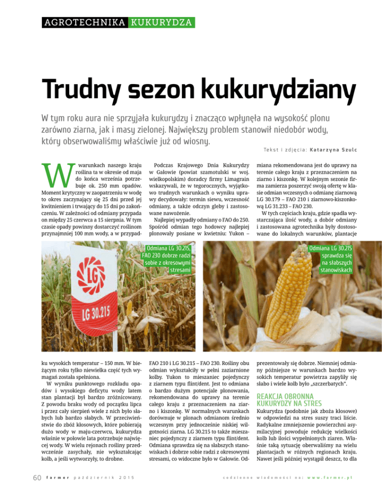 Agrotechnika KUKURYDZA Trudny sezon kukurydziany W tym roku aura nie sprzyjała kukurydzy i znacząco wpłynęła na wysokość plonu zarówno ziarna, jak i masy zielonej. Największy problem stanowił niedobór wody, który obserwowaliśmy właściwie już od wiosny. Te k s t i z d j ę c i a : K a t a r z y n a S z u l c W warunkach naszego kraju roślina ta w okresie od maja do końca września potrzebuje ok. 250 mm opadów. Moment krytyczny w zaopatrzeniu w wodę to okres zaczynający się 25 dni przed jej kwitnieniem i trwający do 15 dni po zakończeniu. W zależności od odmiany przypada on między 25 czerwca a 15 sierpnia. W tym czasie opady powinny dostarczyć roślinom przynajmniej 100 mm wody, a w przypad- Podczas Krajowego Dnia Kukurydzy w Gałowie (powiat szamotulski w woj. wielkopolskim) doradcy firmy Limagrain wskazywali, że w tegorocznych, wyjątkowo trudnych warunkach o wyniku uprawy decydowały: termin siewu, wczesność odmiany, a także odczyn gleby i zastosowane nawożenie. Najlepiej wypadły odmiany o FAO do 250. Spośród odmian tego hodowcy najlepiej plonowały posiane w kwietniu: Yukon – miana rekomendowana jest do uprawy na terenie całego kraju z przeznaczeniem na ziarno i kiszonkę. W kolejnym sezonie firma zamierza poszerzyć swoją ofertę w klasie odmian wczesnych o odmianę ziarnową LG 30.179 – FAO 210 i ziarnowo-kiszonkową LG 31.233 – FAO 230. W tych częściach kraju, gdzie spadła wystarczająca ilość wody, a dobór odmiany i zastosowana agrotechnika były dostosowane do lokalnych warunków, plantacje Odmiana LG 30.215, FAO 230 dobrze radzi sobie z okresowymi stresami ku wysokich temperatur – 150 mm. W bieżącym roku tylko niewielka część tych wymagań została spełniona. W wyniku punktowego rozkładu opadów i wysokiego deficytu wody latem stan plantacji był bardzo zróżnicowany. Z powodu braku wody od początku lipca i przez cały sierpień wiele z nich było słabych lub bardzo słabych. W przeciwieństwie do zbóż kłosowych, które pobierają dużo wody w maju-czerwcu, kukurydza właśnie w połowie lata potrzebuje najwięcej wody. W wielu rejonach rośliny przedwcześnie zasychały, nie wykształcając kolb, a jeśli wytworzyły, to drobne. 60 f a r m e r p a ź d z i e r n i k 2 0 1 5 Odmiana LG 30.215 sprawdza się na słabszych stanowiskach FAO 210 i LG 30.215 – FAO 230. Rośliny obu odmian wykształciły w pełni zaziarnione kolby. Yukon to mieszaniec pojedynczy z ziarnem typu flint/dent. Jest to odmiana o bardzo dużym potencjale plonowania, rekomendowana do uprawy na terenie całego kraju z przeznaczeniem na ziarno i kiszonkę. W normalnych warunkach dorównuje w plonach odmianom średnio wczesnym przy jednocześnie niskiej wilgotności ziarna. LG 30.215 to także mieszaniec pojedynczy z ziarnem typu flint/dent. Odmiana sprawdza się na słabszych stanowiskach i dobrze sobie radzi z okresowymi stresami, co widoczne było w Gałowie. Od- c o d z i e n n e prezentowały się dobrze. Niemniej odmiany późniejsze w warunkach bardzo wysokich temperatur powietrza zapyliły się słabo i wiele kolb było „szczerbatych”. Reakcja obronna kukurydzy na stres Kukurydza (podobnie jak zboża kłosowe) w odpowiedzi na stres suszy traci liście. Radykalne zmniejszenie powierzchni asymilacyjnej powoduje redukcję wielkości kolb lub ilości wypełnionych ziaren. Właśnie taką sytuację oberwaliśmy na wielu plantacjach w różnych regionach kraju. Nawet jeśli później wystąpił deszcz, to dla w i a d o m o ś c i n a : w w w . f a r m e r. p l KUKURYDZA Agrotechnika wzrostu kolb u roślin będących we wspomnianej kondycji nie miało już to znaczenia. Już od samego początku wegetacji roślin zwłaszcza w suchych warunkach nie powinniśmy pozwalać na straty wody. Trzeba zatem przyjrzeć się gospodarowaniu wodą – być może są pewne elementy, które można poprawić. Z pewnością o powodzeniu uprawy i dostępności wody decyduje rodzaj gleby, na której prowadzi się plantację. Przy wysiewie kukurydzy na glebach lżejszych trzeba wziąć pod uwagę, że gleba lekka i bardzo lekka ma 2-krotnie mniejszą pojemność wodną w porównaniu z glebą średnią i 3-, a nawet 4-krotnie mniejszą w porównaniu z ciężką, dlatego zawsze w pierwszej kolejności narażona jest na przesuszenie. Woda może w pewnym stopniu zostać zatrzymana i być dłużej dostępna dla roślin także na glebach lekkich, pod warunkiem, że w głębszej warstwie znajduje się glina. poprawić gospodarkę wodną Kluczową rolę w łagodzeniu skutków stresu wywołanego niedoborem wody pełni nawożenie NPK – właściwie zbilansowane ułatwia kukurydzy lepsze gospodarowanie wodą. Uwagę trzeba zwrócić na potas, Odmiana Yukon, FAO 210 rekomendowana jest do uprawy na terenie całego kraju z przeznaczeniem na ziarno i kiszonkę pamiętając, że odpowiada on za gospodarkę wodną roślin. Dlatego w celu lepszego zatrzymywania wody, zasobność gleby w składniki pokarmowe powinna być utrzymywana przynajmniej na średnim poziomie. Dotyczy to szczególnie potasu. Jeśli jego zawartość w glebie jest niska, to powoduje niedostateczne zaopatrzenie roślin w ten składnik, który odpowiada m.in. za regulację procesu transpiracji. Rośliny dobrze odżywione potasem przy wysokich temperaturach w ciągu dnia mają aparaty szparkowe zamknięte i nie tracą wody (otwierają je dopiero w nocy). Natomiast przy braku potasu w glebie i niskiej jego zawartości w roślinach aparaty szparkowe otwarte są w ciągu dnia, przez co wzrasta parowanie wody z roślin, a tym samym występują straty wody. Dlatego ważna jest odpowiednia zasobność gleby w dostępne dla roślin makroelementy. Jednak trzeba dodać, że „bez wody nie ma życia” i przy głębokiej suszy glebowej nawet zwiększone nawożenie potasem nie przyniesie pożądanego efektu. Na poprawę bilansu wodnego gleby ogromny wpływ ma ilość obecnej w niej materii organicznej. Warto zatem w nawoże