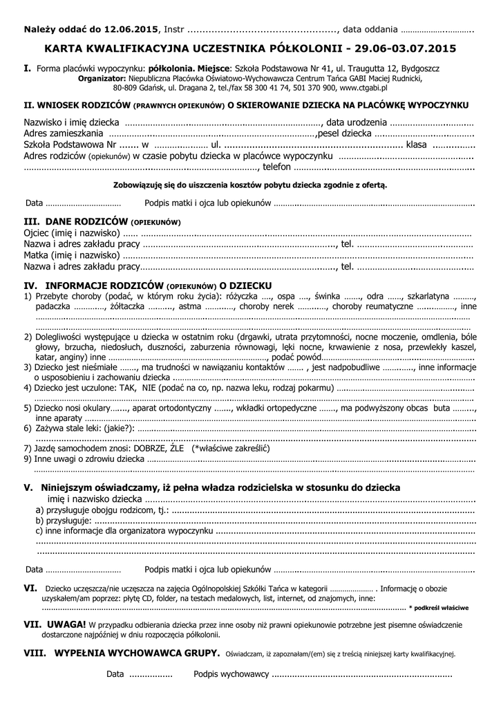Należy oddać do 12.06.2015, Instr ................................................., data oddania ………………..……….. KARTA KWALIFIKACYJNA UCZESTNIKA PÓŁKOLONII - 29.06-03.07.2015 I. Forma placówki wypoczynku: półkolonia. Miejsce: Szkoła Podstawowa Nr 41, ul. Traugutta 12, Bydgoszcz Organizator: Niepubliczna Placówka Oświatowo-Wychowawcza Centrum Tańca GABI Maciej Rudnicki, 80-809 Gdańsk, ul. Dragana 2, tel./fax 58 300 41 74, 501 370 900, www.ctgabi.pl II. WNIOSEK RODZICÓW (PRAWNYCH OPIEKUNÓW) O SKIEROWANIE DZIECKA NA PLACÓWKĘ WYPOCZYNKU Nazwisko i imię dziecka ……………………..…………..…….…………………………, data urodzenia …………………..…….… Adres zamieszkania ……………...………………….…..………………………………,pesel dziecka ….………………..…..………. Szkoła Podstawowa Nr ....... w ………..….…… ul. ................................................................ klasa ..…......….. Adres rodziców (opiekunów) w czasie pobytu dziecka w placówce wypoczynku ……………..………………………….….. …………………………………………...…………..………………………, telefon …………..……………………….…………….….……... Zobowiązuję się do uiszczenia kosztów pobytu dziecka zgodnie z ofertą. Data …………………………… Podpis matki i ojca lub opiekunów ………...………………………….…...……………………………….. III. DANE RODZICÓW (OPIEKUNÓW) Ojciec (imię i nazwisko) …… ………………….……………………….……………………………………………………………………… Nazwa i adres zakładu pracy ……………………………………….………………………..., tel. …………………………….………… Matka (imię i nazwisko) ……………………………………………………………………………………………………………………….… Nazwa i adres zakładu pracy…………………………………….………………………..….., tel. …………………..………………..… IV. INFORMACJE RODZICÓW (OPIEKUNÓW) O DZIECKU 1) Przebyte choroby (podać, w którym roku życia): różyczka …., ospa …., świnka ……., odra ……, szkarlatyna ………, padaczka ……….…, żółtaczka ….…..., astma ……...…, choroby nerek ……...…, choroby reumatyczne …....………, inne …………..………………..………………..………………..………………..………………..…………………………………………………………..…… …………..………………..………………..………………..………………..………………..………………..…………………………………..……….… 2) Dolegliwości występujące u dziecka w ostatnim roku (drgawki, utrata przytomności, nocne moczenie, omdlenia, bóle głowy, brzucha, niedosłuch, duszności, zaburzenia równowagi, lęki nocne, krwawienie z nosa, przewlekły kaszel, katar, anginy) inne ……………………………………………………………, podać powód……………………………..….....………………….. 3) Dziecko jest nieśmiałe ……., ma trudności w nawiązaniu kontaktów ……. , jest nadpobudliwe ……..….., inne informacje o usposobieniu i zachowaniu dziecka .…………………..…….………….…………………………………………………………………..………. 4) Dziecko jest uczulone: TAK, NIE (podać na co, np. nazwa leku, rodzaj pokarmu) …..…….…………………………….…......…. …………………………………………………………………………..…………………………………………………………………..………..………….…. 5) Dziecko nosi okulary…...., aparat ortodontyczny .…..., wkładki ortopedyczne ……., ma podwyższony obcas buta ……..., inne aparaty ….………………………….…………………………………………….………………………………..……………………………….…….. 6) Zażywa stale leki: (jakie?): ……..……..……………………………………………………….………………………………………………….……... ............................................................................................................................................................................. 7) Jazdę samochodem znosi: DOBRZE, ŹLE (*właściwe zakreślić) 9) Inne uwagi o zdrowiu dziecka ….………………..…………………………………………..………………………….......................…….…... …………………………………….……………………………………………………………………………..…………………………………………………… V. Niniejszym oświadczamy, iż pełna władza rodzicielska w stosunku do dziecka imię i nazwisko dziecka ……………………………………………………….…………………………………………………………. a) przysługuje obojgu rodzicom, tj.: ....................................................................................................................... b) przysługuje: ...................................................................................................................................................... c) inne informacje dla organizatora wypoczynku ...................................................................................................... ............................................................................................................................................................................. .............