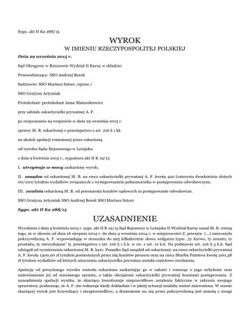 Sygn. akt II Ka 288/15 WYROK W IMIENIU RZECZYPOSPOLITEJ POLSKIEJ Dnia 29 września 2015 r. Sąd Okręgowy w Rzeszowie Wydział II Karny w składzie: Przewodniczący: SSO Andrzej Borek Sędziowie: SSO Mariusz Sztorc /spraw./ SSO Grażyna Artymiak Protokolant: protokolant Anna Matuszkiewicz przy udziale oskarżycielki prywatnej A. F. po rozpoznaniu na rozprawie w dniu 29 września 2015 r. sprawy M. B. oskarżonej o przestępstwo z art. 216 § 1 kk na skutek apelacji wniesionej przez oskarżoną od wyroku Sądu Rejonowego w Leżajsku z dnia 9 kwietnia 2015 r., sygnatura akt II K 19/15 I. utrzymuje w mocy zaskarżony wyrok; II. zasądza od oskarżonej M. B. na rzecz oskarżycielki prywatnej A. F. kwotę 420 (czterysta dwadzieścia złotych 00/100) tytułem wydatków związanych z występowaniem pełnomocnika w postępowaniu odwoławczym; III. zwalnia oskarżoną M. B. od ponoszenia kosztów sądowych za postępowanie odwoławcze. SSO Grażyna Artymiak SSO Andrzej Borek SSO Mariusz Sztorc Sygn. akt II Ka 288/15 UZASADNIENIE Wyrokiem z dnia 9 kwietnia 2015 r. sygn. akt II K 19/15 Sąd Rejonowy w Leżajsku II Wydział Karny uznał M. B. winną tego, że w okresie od dnia 16 sierpnia 2014 r. do dnia 4 września 2014 r. w miejscowości Z. powiatu (...) znieważyła pokrzywdzoną A. F. wypowiadając w stosunku do niej kilkakrotnie słowa wulgarne typu: „ty kurwo, ty szmato, ty prostaku, ty niewydojona” tj. przestępstwa z art. 216 § 1 k.k. w zw. z art. 12 k.k. Na podstawie art. 216 § 3 k.k. Sąd odstąpił od wymierzenia oskarżonej M. B. kary. Ponadto Sąd zasądził od oskarżonej: na rzecz oskarżycielki prywatnej A. F. kwotę 1300,00 zł tytułem poniesionych przez nią kosztów procesu oraz na rzecz Skarbu Państwa kwotę 200,38 zł tytułem wydatków od których uiszczenia oskarżycielka prywatna została częściowo zwolniona. Apelację od powyższego wyroku wniosła oskarżona zaskarżając go w całości i wnosząc o jego uchylenie oraz uniewinnienie jej od stawianego zarzutu, a także obciążenie oskarżycielki prywatnej kosztami postępowania. Z uzasadnienia apelacji wynika, że skarżąca kwestionuje nieprawidłowe ustalenia faktyczne w zakresie swojego sprawstwa, podnosząc, że A. F. nie wskazuje kiedy dokładnie i w jakiej sytuacji miałaby zostać znieważona. W ocenie skarżącej wyrok jest krzywdzący i niesprawiedliwy, a doniesienie na nią przez pokrzywdzoną jest zemstą z uwagi na wzajemny konflikt. Ponadto skarżąca zarzuciła, iż Sąd Rejonowy całkowicie pominął art. 631 k.p.k. i niesłusznie obciążył ją kosztami procesu, gdyż nie pracuje, pozostaje na utrzymaniu męża, z którym razem wychowują pięcioro dzieci i nie ma możliwości ponieść tych kosztów bez uszczerbku dla utrzymania dzieci i rodziny. Sąd Okręgowy zważył, co następuje: Apelacja oskarżonej nie jest zasadna i nie zasługuje na uwzględnienie. W pierwszej kolejności wskazać należy, że ustalony przez Sąd I instancji stan faktyczny nie budzi wątpliwości, bowiem znajduje oparcie w ocenie dowodów, która nie wykracza poza granice wyznaczone w art. 7 k.p.k. Sąd Rejonowy wskazał przyczynę, dla której pozytywnie ocenił dowody, na podstawie których ustalił stan faktyczny jak i wskazał powody, dla których odmówił wiary dowodom przeciwnym. Tym samym Sąd nie pozostawił w sprawie wątpliwości, które nie zostałyby usunięte, a tym bardziej rozstrzygnięte na niekorzyść oskarżonej. Uzasadnienie wyroku Sądu Rejonowego zostało sporządzone stosownie do reguł wynikających z art. 424 k.p.k. Dało ono Sądowi Okręgowemu podstawę do skontrolowania słuszności rozumowania Sądu I instancji i zgodności tego rozumowania z materiałem dowodowym. Sąd Rejonowy objęte treścią zarzutu zdarzenie przeanalizował w sposób dokładny, a ustalenia stanu faktycznego i opis czynu przypisanego oskarżonej w wyroku oparł ściśle na tym, co w sposób pewny i nie budzący wątpliwości zostało oskarżonej dowiedzione. W treści apelacji, nie wskazano żadnej okoliczności, która pozostałaby poza rozważaniem Sądu Rejonowego, ani żadnego argumentu czy dowodu przekonującego, że ustalenia faktyczne pozostają w sprzeczności z kryteriami prawidłowego rozumowania czy doświadczenia życiowego. Analizując zebrany w sprawie materiał dowodowy Sąd Okręgowy w zupełności podzielił argumentację zawartą w uzasadnieniu zaskarżonego orzeczenia Nie można uznać za słuszny zarzutu apelacji, polegającego na błędnym uznaniu przez Sąd winy oskarżonej, mimo, iż pokrzywdzona nie wskazuje kiedy dokładnie i w jakiej sytuacji miało dojść do znieważenia. Jak słusznie bowiem ustalił Sąd Rejonowy, okoliczność ta została wykazana wiarygodnymi dowodami w postaci częściowych zeznań oskarżycielki prywatnej oraz pozostałych świadków w zakresie w jakim Sąd dał im wiarę, nagrania na płycie CD oraz wywiadu środowiskowego. Sąd Rejonowy słusznie zwrócił uwagę, iż zarówno pokrzywdzona jak i oskarżona przedstawiając swoją wersję starały się ukazać swoje zachowanie w jak najkorzystniejszy sposób, a winą za zaistniały konflikt obciążyć drugą stronę. Podobnie Sąd ocenił zeznania wnioskowanych zarówno przez obronę jak i oskarżenie świadków, którzy potwierdzali wersję odpowiednio M. B. oraz A. F.. Jednak skrupulatna i całościowa ocena osobowych źródeł dowodowych, jak i obiektywnych dowodów w postaci wywiadu środowiskowego oraz nagrania z płyty CD, pozwoliły Sądowi dojść do niebudzącego wątpliwości przekonania o winie oskarżonej. Słusznie Sąd również zwrócił uwagę, że wersję pokrzywdzonej potwierdza także wezwanie przez nią na interwencję policji w dniu 2 września 2014 r., której powodem były wyzwiska kierowane do niej przez oskarżoną. Podsumowując stwierdzić należy, że Sąd I instancji obiektywnie rozważył wszystkie okoliczności sprawy, a następnie w sposób logiczny i wyczerpujący argumentował swoje st