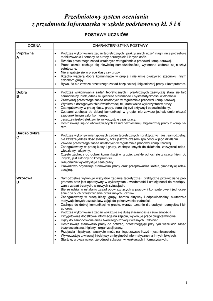 Przedmiotowy system oceniania z przedmiotu Informatyka w szkole podstawowej kl. 5 i 6 POSTAWY UCZNIÓW OCENA Poprawna A CHARAKTERYSTYKA POSTAWY · · · · · · Dobra B · · · · · · · Bardzo dobra C · · · · · · Wzorowa D · · · · · · · · · · · Podczas wykonywania zadań teoretycznych i praktycznych uczeń nagminnie potrzebuje mobilizowania i pomocy ze strony nauczyciela i innych osób. Rzadko przestrzega zasad ustalonych w regulaminie pracowni komputerowej. Praca ucznia cechuje się niewielką samodzielnością, wykonane zadania są niezbyt estetyczne. Nie angażuje się w pracę klasy czy grupy Rzadko wspiera dobrą komunikację w grupie i nie umie okazywać szacunku innym członkom grupy. Bywa, że nie zawsze przestrzega zasad bezpiecznej i higienicznej pracy z komputerem. Podczas wykonywania zadań teoretycznych i praktycznych zazwyczaj stara się być samodzielny, brak jednak mu jeszcze staranności i systematyczności w działaniu. Zazwyczaj przestrzega zasad ustalonych w regulaminie pracowni komputerowej. Wybiera z dostępnych zbiorów informacji te, które wolno wykorzystać w pracy. Zaangażowany w pracę klasy, grupy, stara się być aktywny i odpowiedzialny. Czasami zachęca do dobrej komunikacji w grupie, nie zawsze jednak umie okazać szacunek innym członkom grupy. Jeszcze niezbyt efektywnie wykorzystuje czas pracy. Dostosowuje się do obowiązujących zasad bezpiecznej i higienicznej pracy z komputerem. Podczas wykonywania typowych zadań teoretycznych i praktycznych jest samodzielny, nie zawsze jednak dość staranny, brak jeszcze czasem spójności w jego działaniu. Zawsze przestrzega zasad ustalonych w regulaminie pracowni komputerowej. Zaangażowany w pracę klasy i grupy, zachęca innych do działania, zazwyczaj odpowiedzialny i aktywny. Często zachęca do dobrej komunikacji w grupie, zwykle odnosi się z szacunkiem do innych, jest skłonny do kompromisu. Racjonalnie wykorzystuje czas pracy. Prawidłowo organizuje stanowisko pracy oraz przeprowadza krótką gimnastykę relaksacyjną. Samodzielnie wykonuje wszystkie zadania teoretyczne i praktyczne przewidziane programem oraz jest operatywny w wykorzystaniu wiadomości i umiejętności do rozwiązywania zadań trudnych, w nowych sytuacjach. Bierze udział w ustalaniu zasad obowiązujących w pracowni komputerowej i jednocześnie dba o ich przestrzeganie przez innych uczniów. Zaangażowany w pracę klasy, grupy, bardzo aktywny i odpowiedzialny, skutecznie motywuje innych uczestników zajęć do pokonywania trudności. Zachęca do dobrej komunikacji w grupie, wyraża uznanie dla cudzych pomysłów i ich autorów. Podczas wykonywania zadań wykazuje się dużą starannością i sumiennością. Przygotowuje dodatkowe informacje na zajęcia, wykonuje prace długoterminowe. Dąży do samodoskonalenia i twórczego rozwoju własnych uzdolnień. Dostosowuje stanowisko pracy do potrzeb, przestrzegając przy tym wszelkich zasad bezpieczeństwa, higieny i organizacji pracy. Przejawia inicjatywę, nauczyciel może na niego zawsze liczyć – jest niezawodny. Wykorzystuje z własnej inicjatywy umiejętności informatyczne na innych lekcjach. Startuje, a bywa nawet, że odnosi sukcesy, w konkursach informatycznych. 1 WIADOMOŚCI I UMIEJĘTNOŚCI UCZNIÓW 1. TECHNIKA KOMPUTEROWA W ŻYCIU CZŁOWIEKA OSIĄGNIĘCIA UCZNIA WYMAGANIA Konieczne K ocena dopuszczająca UMIEJĘTNOŚCI · · · Podstawowe K+P ocena dostateczna · · Rozszerzające (K + P) + R ocena dobra Dopełniające (K + P + R) + D ocena bardzo dobra · · · · Ponadprogramowe (K + P + R + D) + PP ocena celująca Dokonuje prób organizacji własnego stanowiska pracy z zachowaniem podstawowych zasad bezpieczeństwa i higieny pracy. Korzysta ze wskazanych zbiorów informacji, okazując szacunek dla cudzej własności twórczej. Obsługuje urządzenia oparte na technice komputerowej, np.: kalkulator, odtwarzacz CD lub inne urządzenia poznane na zajęciach. WIADOMOŚCI · · · · Wymienia zasady prawidłowej organizacji pracy z komputerem dotyczące: czasu pracy, miejsca pracy, pozycji ciała podczas pracy. Objaśnia zasady korzystania z programów i zbiorów dokumentów w szkolnej pracowni komputerowej. Wymienia zastosowania komputera w najbliższym środowisku. Wyjaśnia pojęcie urządzenia opartego na technice komputerowej. Dostosowuje stanowisko pracy do · wymagań bezpiecznej i higienicznej pracy. · Charakteryzuje podstawowe zastosowania poznanych na zajęciach urządzeń opartych na technice komputerowej. Omawia prawa użytkownika pracowni komputerowej podczas korzystania z programów. Wymienia poznane dziedziny zastosowania komputerów w najbliższym otoczeniu i wskazuje na korzyści wynikające z ich zastosowania. Ocenia organizację stanowisk pra- · cy w różnych miejscach w szkole. Charakteryzuje konsekwencje · prawne piractwa komputerowego. Wyjaśnia pojęcia: piractwo komputerowe, licencja, prawa autorskie, programy demo, pokaz multimedialny. Wskazuje na zastosowanie techniki komputerowej w urządzeniach innych niż omawiane na zajęciach. Przewiduje skutki nieprawidłowego · zorganizowania komputerowego stanowiska pracy. · Obsługuje urządzenia oparte na technice komputerowej związane z najbliższym środowiskiem (np.: magnetowid, informacja komputerowa, pralka automatyczna, telefon komórkowy). Wyjaśnia pojęcia: programy freeware, public domain, shareware. Prezentuje inne od poznanych na zajęciach dziedziny życia, w których zastosowano komputer. Wykraczające poza program, np.: · Przewiduje wpływ doboru monitora na samopoczucie użytkownika komputera. · Uzasadnia konieczność stosowania programów antywirusowych oraz przeprowadza profilaktykę antywirusową. · Analizuje zalety i zagrożenia, jakie niesie komputeryzacja życia. · Ocenia wpływ urządzeń opartych na technice komputerowej na jakość życia człowieka. Wykraczające poza program, np.: · Omawia przyczyny chorób związanych z obsługą komputera. · Ws