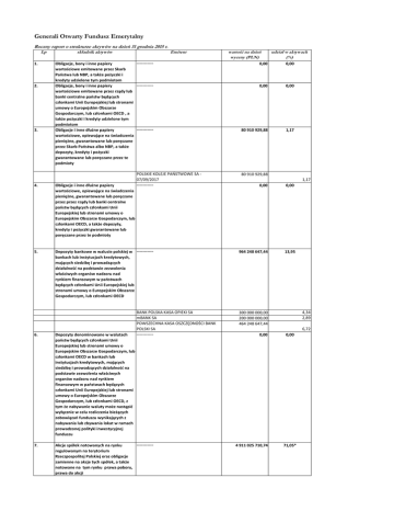 Generali Otwarty Fundusz Emerytalny Roczny raport o strukturze aktywów na dzień 31 grudnia 2015 r. Lp 1. 2. 3. składnik aktywów Emitent ----------Obligacje, bony i inne papiery wartościowe emitowane przez Skarb Państwa lub NBP, a także pożyczki i kredyty udzielone tym podmiotom ----------Obligacje, bony i inne papiery wartościowe emitowane przez rządy lub banki centralne państw będących członkami Unii Europejskiej lub stronami umowy o Europejskim Obszarze Gospodarczym, lub członkami OECD , a także pożyczki i kredyty udzielone tym podmiotom ----------Obligacje i inne dłużne papiery wartościowe, opiewające na świadczenia pieniężne, gwarantowane lub poręczane przez Skarb Państwa albo NBP, a także depozyty, kredyty i pożyczki gwarantowane lub poręczane przez te podmioty POLSKIE KOLEJE PAŃSTWOWE SA 07/09/2017 ----------- 4. Obligacje i inne dłużne papiery wartościowe, opiewające na świadczenia pieniężne, gwarantowane lub poręczane przez przez rządy lub banki centralne państw będących członkami Unii Europejskiej lub stronami umowy o Europejskim Obszarze Gospodarczym, lub członkami OECD, a także depozyty, kredyty i pożyczki gwarantowane lub poręczane przez te podmioty 5. Depozyty bankowe w walucie polskiej w ----------bankach lub instytucjach kredytowych, mających siedzibę i prowadzących działalność na podstawie zezwolenia właściwych organów nadzoru nad rynkiem finansowym w państwach będących członkami Unii Europejskiej lub stronami umowy o Europejskim Obszarze Gospodarczym, lub członkami OECD BANK POLSKA KASA OPIEKI SA mBANK SA POWSZECHNA KASA OSZCZĘDNOŚCI BANK POLSKI SA ----------- 6. Depozyty denominowane w walutach państw będących członkami Unii Europejskiej lub stronami umowy o Europejskim Obszarze Gospodarczym, lub członkami OECD w bankach lub instytucjach kredytowych, mających siedzibę i prowadzących działalność na podstawie zezwolenia właściwych organów nadzoru nad rynkiem finansowym w państwach będących członkami Unii Europejskiej lub stronami umowy o Europejskim Obszarze Gospodarczym, lub członkami OECD, z tym że nabywanie waluty może nastąpić wyłącznie w celu rozliczenia bieżących zobowiązań funduszu wynikających z nabywania lub zbywania lokat w ramach prowadzonej polityki inwestycyjnej funduszu 7. ----------Akcje spółek notowanych na rynku regulowanym na terytorium Rzeczpospolitej Polskiej oraz obligacje zamienne na akcje tych spółek, a także notowane na tym rynku prawa poboru, prawa do akcji wartość na dzień wyceny (PLN) udział w aktywach (%) 0,00 0,00 0,00 0,00 80 910 929,88 1,17 80 910 929,88 1,17 0,00 0,00 964 248 647,44 13,95 4,34 2,89 300 000 000,00 200 000 000,00 464 248 647,44 6,72 0,00 4 911 025 710,74 0,00 71,05* BANK POLSKA KASA OPIEKI SA ACTION SA ALIOR BANK SA AMICA WRONKI SA APATOR SA ARTERIA SA ASSECO POLAND SA ATLANTA POLAND SA BANK BPH SA BANK BGŻ BNP PARIBAS SA BANK HANDLOWY W WARSZAWIE SA BANK MILLENNIUM SA BANK OCHRONY ŚRODOWISKA SA BANK ZACHODNI WBK SA BUDIMEX SA BUWOG AG CCC SA CENTRUM MEDYCZNE ENEL-MED SA CEZ A.S. CIECH SA COMP SA CYFROWY POLSAT SA DOM DEVELOPMENT SA ECHO INVESTMENT SA ELEKTROBUDOWA SA ENEA SA ENERGA SA ENERGOINSTAL SA FARMACOL SA GETIN HOLDING SA GIEŁDA PAPIERÓW WARTOŚCIOWYCH SA GRUPA AZOTY SA GRUPA KĘTY SA GRUPA LOTOS SA IMMOFINANZ AG ING BANK ŚLĄSKI SA INPOST SA INPRO SA INSTAL KRAKÓW SA INTEGER PL SA INTER CARS SA KGHM POLSKA MIEDŹ SA KREDYT INKASO SA KRUK SA LPP SA LUBELSKI WĘGIEL "BOGDANKA" SA MABION SA MAGELLAN SA Mbank SA MEDICALGOROTHMICS SA MOL MAGYAR OLAJ - ES GAZIPARI RESZVENYTARSASAG NEWAG SA ORANGE POLSKA SA ORBIS SA OVOSTAR UNION N.V. PCC Intermodal SA PELION SA PFLEIDERER GRAJEWO SA PGE SA PKP CARGO SA POLENERGIA SA POLSKI KONCERN NAFTOWY ORLEN SA POLSKIE GÓRNICTWO NAFTOWE I GAZOWNICTWO SA POWSZECHNA KASA OSZCZĘDNOŚCI BANK POLSKI SA 265 774 750,24 53 761 043,32 116 249 573,88 25 725 552,72 32 111 799,52 10 492 223,49 73 668 472,86 4 160 259,38 19 299 490,92 15 999 263,06 40 053 207,66 107 364 249,58 7 156 800,00 289 365 753,70 19 228 036,80 30 062 597,60 86 442 741,84 21 923 887,64 46 377 734,16 30 937 221,80 15 362 448,01 131 161 771,20 5 636 537,27 56 090 328,00 31 355 206,40 46 625 834,88 23 640 394,32 2 932 624,89 8 591 688,04 11 403 006,52 32 108 614,20 47 015 881,87 91 242 261,00 19 753 623,41 46 435 789,52 162 551 769,20 11 896 500,00 4 270 000,00 5 675 252,86 64 945 817,60 34 852 391,55 111 233 656,89 49 076 523,76 198 843 800,48 135 560 351,61 8 844 307,12 41 453 656,24 17 960 042,10 114 107 913,33 17 643 115,00 45 673 133,00 8 364 711,36 36 137 752,20 88 973 537,40 47 838 752,50 6 376 776,20 6 138 175,68 3 015 353,56 128 638 333,26 34 757 058,81 83 100 759,36 493 988 620,65 3,85 0,78 1,68 0,37 0,46 0,15 1,07 0,06 0,28 0,23 0,58 1,55 0,10 4,19 0,28 0,43 1,25 0,32 0,67 0,45 0,22 1,90 0,08 0,81 0,45 0,67 0,34 0,04 0,12 0,16 0,46 0,68 1,32 0,29 0,67 2,35 0,17 0,06 0,08 0,94 0,50 1,61 0,71 2,88 1,96 0,13 0,60 0,26 1,65 0,26 0,66 0,12 0,52 1,29 0,69 0,09 0,09 0,04 1,86 0,50 1,20 7,15 109 564 683,66 1,59 479 674 880,72 6,94 264 732 849,00 POWSZECHNY ZAKŁAD UBEZPIECZEŃ SA RAWLPLUG SA 7 994 453,85 3,83 0,12 8. Akcje, prawa poboru i prawa do akcji, będące przedmiotem oferty publicznej na terytorium Rzeczpospolitej Polskiej 9. Akcje spółek notowanych na rynku regulowanym w państwach innych niż Rzeczpospolita Polska oraz obligacje zamienne na akcje tych spółek, a także notowane na tych rynkach prawa poboru, prawa do akcji ROBYG SA SOLAR COMPANY SA SYNTHOS SA TAURON POLSKA ENERGIA SA TOYA SA ULMA CONSTRUCCION POLSKA SA VISTAL GDYNIA SA WIRTUALNA POLSKA HOLDING SA ZESPÓŁ ELEKTROWNII " PĄTNÓW-ADAMÓWKONIN" SA ZETKAMA SA ENTER AIR SA ----------- ----------- 0,75 0,00 0,76 0,17 0,34 0,28 0,07 0,09 52 180 333,68 289 726,00 52 515 243,48 11 615 428,80 23 455 379,43 19 281 903,90 4 926 600,00 5 928 000,00 7 590 114,56 0,11 0,35 0,29 24 056 382,24 19 791 000,00 0,00 0,00 417 471 104,10 6,04* 21 477 506,06 AMER