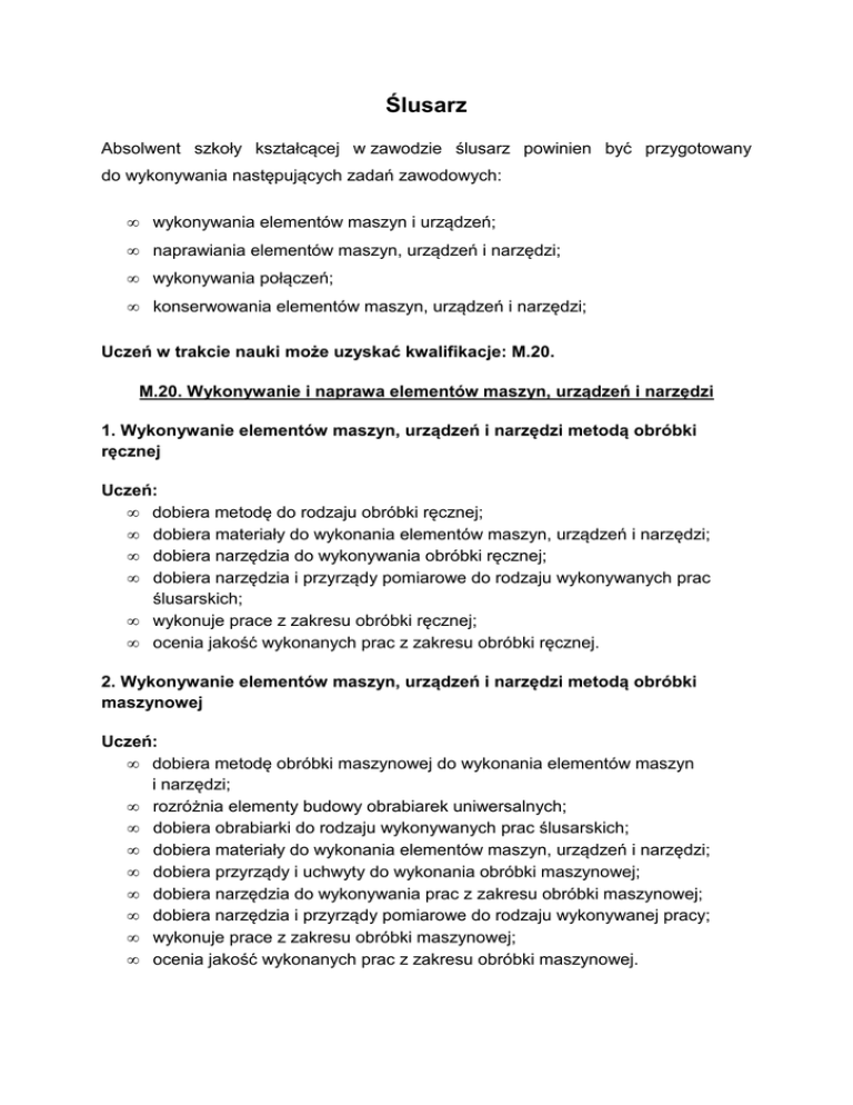 Ślusarz Absolwent szkoły kształcącej w zawodzie ślusarz powinien być przygotowany do wykonywania następujących zadań zawodowych: • wykonywania elementów maszyn i urządzeń; • naprawiania elementów maszyn, urządzeń i narzędzi; • wykonywania połączeń; • konserwowania elementów maszyn, urządzeń i narzędzi; Uczeń w trakcie nauki może uzyskać kwalifikacje: M.20. M.20. Wykonywanie i naprawa elementów maszyn, urządzeń i narzędzi 1. Wykonywanie elementów maszyn, urządzeń i narzędzi metodą obróbki ręcznej Uczeń: • dobiera metodę do rodzaju obróbki ręcznej; • dobiera materiały do wykonania elementów maszyn, urządzeń i narzędzi; • dobiera narzędzia do wykonywania obróbki ręcznej; • dobiera narzędzia i przyrządy pomiarowe do rodzaju wykonywanych prac ślusarskich; • wykonuje prace z zakresu obróbki ręcznej; • ocenia jakość wykonanych prac z zakresu obróbki ręcznej. 2. Wykonywanie elementów maszyn, urządzeń i narzędzi metodą obróbki maszynowej Uczeń: • dobiera metodę obróbki maszynowej do wykonania elementów maszyn i narzędzi; • rozróżnia elementy budowy obrabiarek uniwersalnych; • dobiera obrabiarki do rodzaju wykonywanych prac ślusarskich; • dobiera materiały do wykonania elementów maszyn, urządzeń i narzędzi; • dobiera przyrządy i uchwyty do wykonania obróbki maszynowej; • dobiera narzędzia do wykonywania prac z zakresu obróbki maszynowej; • dobiera narzędzia i przyrządy pomiarowe do rodzaju wykonywanej pracy; • wykonuje prace z zakresu obróbki maszynowej; • ocenia jakość wykonanych prac z zakresu obróbki maszynowej. 3. Wykonywanie połączeń materiałów Uczeń: • rozróżnia techniki łączenia materiałów; • dobiera metodę łączenia materiałów; • rozróżnia narzędzia i sprzęt do wykonywania połączeń materiałów; • dobiera materiały do wykonania ich połączeń; • dobiera narzędzia i sprzęt do wykonania połączeń materiałów; • przygotowuje materiały do wykonania ich połączeń; • wykonuje połączenia materiałów; • ocenia jakość wykonanych połączeń. 4. Naprawa i konserwacja elementów maszyn, urządzeń i narzędzi Uczeń: • posługuje się dokumentacją techniczną maszyn i urządzeń; • planuje czynności związane z demontażem maszyn i urządzeń; • charakteryzuje procesy zużycia elementów maszyn, urządzeń i narzędzi; • ocenia stan techniczny elementów maszyn, urządzeń i narzędzi; • dobiera części podlegające wymianie; • wykonuje czynności naprawcze elementów maszyn i urządzeń; • wykonuje czynności naprawcze narzędzi; • montuje maszyny i urządzenia po naprawie; • dobiera metodę zabezpieczeń antykorozyjnych maszyn i urządzeń; • wykonuje zabezpieczenia antykorozyjne elementów maszyn i urządzeń; • wykonuje konserwację narzędzi; • ocenia jakość wykonanej naprawy i konserwacji. Absolwent szkoły kształcącej w zawodzie ślusarz po potwierdzeniu kwalifikacji M.20. Wykonywanie i naprawa elementów maszyn, urządzeń i narzędzi może uzyskać dyplom potwierdzający kwalifikacje w zawodzie technik mechanik po potwierdzeniu dodatkowo kwalifikacji M.44. Organizacja i nadzorowanie procesów produkcji maszyn i urządzeń oraz uzyskaniu wykształcenia średniego.