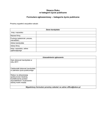 Siewca Roku w kategorii życie publiczne Formularz zgłoszeniowy – kategoria życie publiczne Prosimy wypełnić wszystkie rubryki: Dane kandydata Imię i nazwisko Nazwa firmy Funkcja (właściciel, prezes, menadżer) Adres kandydata Adres firmy Imię i nazwisko, adres zgłaszającego Uzasadnienie zgłoszenia Opis dokonań kandydata w roku 2011 Całokształt dokonań kandydata w zakresie życia publicznego Wpływ na aktywizację społeczności lokalnej, kształtowanie postaw obywatelskich i budowanie dobrej marki miasta Wypełniony formularz prosimy odesłać na adres [email protected]