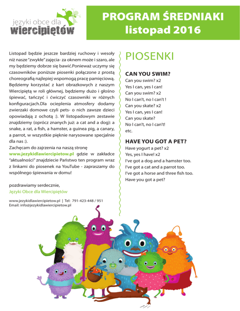 języki obce dla wiercipietow PROGRAM ŚREDNIAKI listopad 2016 Listopad będzie jeszcze bardziej ruchowy i wesoły niż nasze “zwykłe” zajęcia- za oknem może i szaro, ale my będziemy dobrze się bawić.Ponieważ uczymy się czasowników poniższe piosenki połączone z prostą choreografią najlepiej wspomogą pracę pamięciową. Będziemy korzystać z kart obrazkowych z naszym Wiercipiętą w roli głównej, będziemy dużo i głośno śpiewać, tańczyć i ćwiczyć czasowniki w różnych konfiguracjach.Dla ocieplenia atmosfery dodamy zwierzaki domowe czyli pets- o nich zawsze dzieci opowiadają z ochotą :). W listopadowym zestawie znajdziemy (oprócz znanych już: a cat and a dog): a snake, a rat, a fish, a hamster, a guinea pig, a canary, a parrot, w wszystkie pięknie narysowane specjalnie dla nas :). Zachęcam do zajrzenia na naszą stronę www.jezykidlawiercipietow.pl gdzie w zakładce “aktualności” znajdziecie Państwo ten program wraz z linkami do piosenek na YouTube - zapraszamy do wspólnego śpiewania w domu! pozdrawiamy serdecznie, Języki Obce dla Wiercipiętów www.jezykidlawiercipietow.pl | Tel: 791-423-448 / 951 Email: [email protected] PIOSENKI CAN YOU SWIM? Can you swim? x2 Yes I can, yes I can! Can you swim? x2 No I can’t, no I can’t ! Can you skate? x2 Yes I can, yes I can! Can you skate? No I can’t, no I can’t! etc. HAVE YOU GOT A PET? Have yogurt a pet? x2 Yes, yes I have! x2 I‘ve got a dog and a hamster too. I’ve got a cat and a parrot too. I’ve got a horse and three fish too. Have you got a pet?
