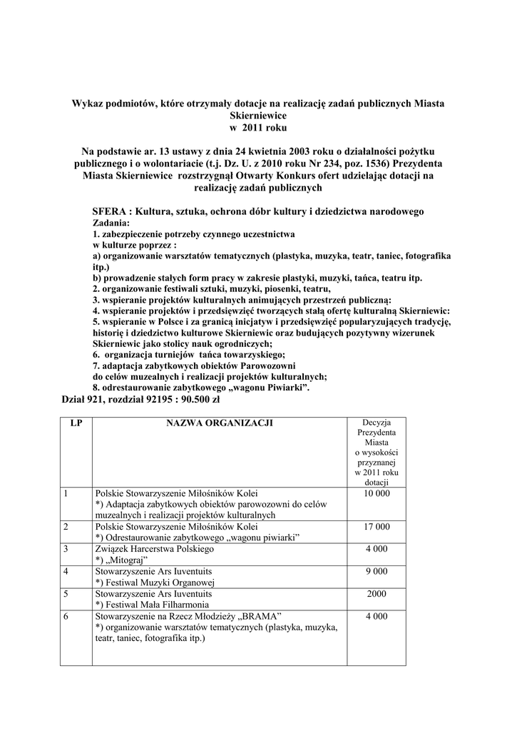 Wykaz podmiotów, które otrzymały dotacje na realizację zadań publicznych Miasta Skierniewice w 2011 roku Na podstawie ar. 13 ustawy z dnia 24 kwietnia 2003 roku o działalności pożytku publicznego i o wolontariacie (t.j. Dz. U. z 2010 roku Nr 234, poz. 1536) Prezydenta Miasta Skierniewice rozstrzygnął Otwarty Konkurs ofert udzielając dotacji na realizację zadań publicznych SFERA : Kultura, sztuka, ochrona dóbr kultury i dziedzictwa narodowego Zadania: 1. zabezpieczenie potrzeby czynnego uczestnictwa w kulturze poprzez : a) organizowanie warsztatów tematycznych (plastyka, muzyka, teatr, taniec, fotografika itp.) b) prowadzenie stałych form pracy w zakresie plastyki, muzyki, tańca, teatru itp. 2. organizowanie festiwali sztuki, muzyki, piosenki, teatru, 3. wspieranie projektów kulturalnych animujących przestrzeń publiczną: 4. wspieranie projektów i przedsięwzięć tworzących stałą ofertę kulturalną Skierniewic: 5. wspieranie w Polsce i za granicą inicjatyw i przedsięwzięć popularyzujących tradycję, historię i dziedzictwo kulturowe Skierniewic oraz budujących pozytywny wizerunek Skierniewic jako stolicy nauk ogrodniczych; 6. organizacja turniejów tańca towarzyskiego; 7. adaptacja zabytkowych obiektów Parowozowni do celów muzealnych i realizacji projektów kulturalnych; 8. odrestaurowanie zabytkowego „wagonu Piwiarki”. Dział 921, rozdział 92195 : 90.500 zł LP 1 2 3 4 5 6 NAZWA ORGANIZACJI Polskie Stowarzyszenie Miłośników Kolei *) Adaptacja zabytkowych obiektów parowozowni do celów muzealnych i realizacji projektów kulturalnych Polskie Stowarzyszenie Miłośników Kolei *) Odrestaurowanie zabytkowego „wagonu piwiarki” Związek Harcerstwa Polskiego *) „Mitograj” Stowarzyszenie Ars Iuventuits *) Festiwal Muzyki Organowej Stowarzyszenie Ars Iuventuits *) Festiwal Mała Filharmonia Stowarzyszenie na Rzecz Młodzieży „BRAMA” *) organizowanie warsztatów tematycznych (plastyka, muzyka, teatr, taniec, fotografika itp.) Decyzja Prezydenta Miasta o wysokości przyznanej w 2011 roku dotacji 10 000 17 000 4 000 9 000 2000 4 000 7 8 9 10 11 Fundacja Pomocy Społecznej „CHODŹMY RAZEM” *) Turniej Tańca Towarzyskiego Fundacja Pomocy Społecznej „CHODŹMY RAZEM” *) organizacja warsztatów tematycznych (plastyka, muzyka, teatr, taniec, fotografia itp.) prowadzenie stałych form pracy w zakresie plastyki, muzyki, tańca, teatru itp.) Fundacja Pomocy Społecznej „CHODŹMY RAZEM” *) organizowanie festiwali sztuki, muzyki, piosenki teatru; wspieranie projektów kulturalnych animujących przestrzeń publiczną; wspieranie projektów i przedsięwzięć towarzyszących stałą ofertę kulturalną Skierniewic; organizacja turniejów tańca towarzyskiego 16 000 Fundacja „Akademia Biskupa Ignacego Krasickiego” *) Warsztaty Wokalne HARMONIA Towarzystwo Przyjaciół Dzieci *) Organizowanie festiwali sztuki, muzyki, piosenki, teatru „Co może mały człowiek” 10 000 10 000 3 000 5 500 SFERA : Podtrzymywania i upowszechniania tradycji narodowej, pielęgnowanie polskości oraz świadomości narodowej, obywatelskiej i kulturowej Zadanie : ochrona miejsc pamięci narodowych Dział 921, rozdział 92195 : 10.000 zł L.p. 1. Nazwa podmiotu Towarzystwo Przyjaciół Skierniewic Decyzja Prezydenta Miasta o wysokości przyznanej w 2011 roku dotacji 10 000 Zatwierdzam Leszek Trębski – Prezydent Miasta Skierniewice