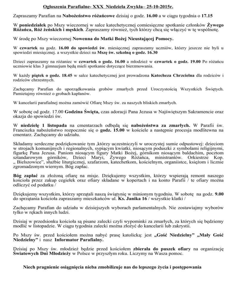Ogłoszenia Parafialne- XXX Niedziela Zwykła– 25-10-2015r. Zapraszamy Parafian na Nabożeństwo różańcowe dzisiaj o godz. 16.00 a w ciągu tygodnia o 17.15 W poniedziałek po Mszy wieczornej w salce katechetycznej comiesięczne spotkanie członków Żywego Różańca, Róż żeńskich i męskich. Zapraszamy również, tych którzy chcą się włączyć w tę wspólnotę. W środę po Mszy wieczornej Nowenna do Matki Bożej Nieustającej Pomocy. W czwartek na godz. 16.00 do spowiedzi św. miesięcznej zapraszamy uczniów, któzry jeszcze nie byli u spowiedzi miesięcznej. a wszystkie dzieci na Mszę św. szkolną o godz. 16.30 Dzieci zapraszamy na różaniec w czwartek o godz. 16.00 a młodzież w czwartek o godz. 19.00 Po różańcu uczniowie klas 3 gimnazjum będą mieli spotkanie dotyczące bierzmowania. W każdy piątek o godz. 18.45 w salce katechetycznej jest prowadzona Katecheza Chrzcielna dla rodziców i rodziców chrzestnych. Zachęcamy Parafian do uporządkowania grobów zmarłych przed Uroczystością Wszystkich Świętych. Pamietajmy również o grobach kapłanów. W kancelarii parafialnej można zamówić Ofiarę Mszy św. za naszych bliskich zmarłych. W sobotę od godz. 17.00 Godzina Święta, czas adoracji Pana Jezusa w Najświętszym Sakramencie oraz okazja do spowiedzi św. W niedzielę 1 listopada na cmentarzach odbędą się nabożeństwa za zmarłych. W Parafii św. Franciszka nabożeństwo rozpocznie się o godz. 15.00 w kościele a następnie procesja modlitewna na cmentarz. Zachęcamy do udziału. Składamy serdeczne podziękowanie tym ,którzy uczestniczyli w uroczystej sumie odpustowej: dzieciom w strojach komunijnych i regionalnych, sypiącym kwiatki, niosącym poduszki z symbolami religijnymi, figurkę Pana Jezusa. Paniom niosącym figury Matki Bożej, górnikom niosącym baldachim, pocztom sztandarowym górników, Dzieci Maryi, Żywego Różańca, ministrantów. Orkiestrze Kop. „ Bielszowice”, służbie liturgicznej, szafarzom, katechetkom, kościelnym, organiistce, księżom i licznie zgromadzonym wiernym. Bóg zapłac. Bóg zapłać za złożoną ofiarę na misje. Dziękujemy wszystkim, którzy wspierają remont naszego kościoła przez zakup cegiełek oraz ofiary składane w kopertach i na konto Parafii / te ofiary można odliczyć od podatku / Dziękujemy wszystkim, którzy sprzątali naszą świątynię w minionym tygodniu. W sobotę na godz. 9.00 do sprzątania kościoła zapraszamy mieszkańców ul. Ks. Janika 16 / wszystkie klatki / Zachęcamy Parafian do udziału w dzisiejszych wyborach parlamentalnych. Nie zostawiajmy wyborów tylko w rękach innych ludzi. Dzisiaj w przedsionku kościoła są pisane zalecki czyli wypominki za zmarłych, za których się będziemy modlić w listopadzie. W ciągu tygodnia zalecki można złożyć do kancelarii lub zakrystii. Po Mszy św. przed kościołem można nabyć prasę katolicką: jest „Gość Niedzielny” „Mały Gość Niedzielny” i nasz Informator Parafialny. Dzisiaj po Mszy św. młodzież będzie przed kościołem zbierała do puszek ofiary na organizację Światowych Dni Młodzieży w Polsce w przyszłym roku. Liczymy na Wasza pomoc. Niech pragnienie osiągnięcia nieba zmobilizuje nas do lepszego życia i postępowania
