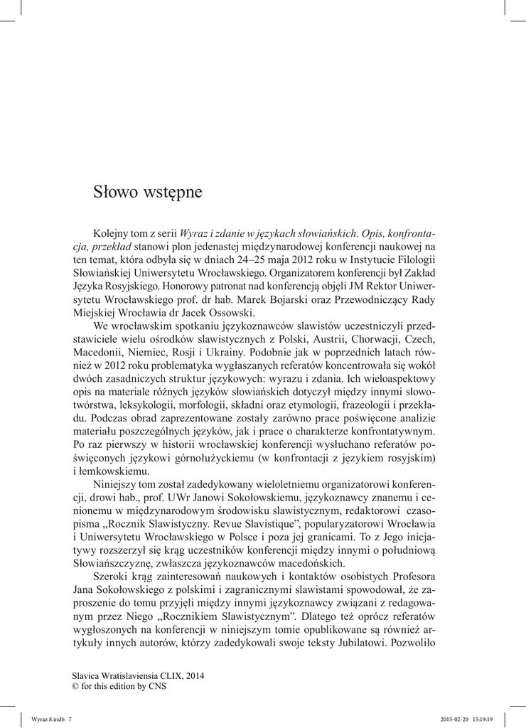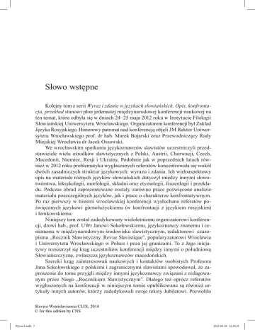 Słowo wstępne Kolejny tom z serii Wyraz i zdanie w językach słowiańskich. Opis, konfrontacja, przekład stanowi plon jedenastej międzynarodowej konferencji naukowej na ten temat, która odbyła się w dniach 24–25 maja 2012 roku w Instytucie Filologii Słowiańskiej Uniwersytetu Wrocławskiego. Organizatorem konferencji był Zakład Języka Rosyjskiego. Honorowy patronat nad konferencją objęli JM Rektor Uniwersytetu Wrocławskiego prof. dr hab. Marek Bojarski oraz Przewodniczący Rady Miejskiej Wrocławia dr Jacek Ossowski. We wrocławskim spotkaniu językoznawców slawistów uczestniczyli przedstawiciele wielu ośrodków slawistycznych z Polski, Austrii, Chorwacji, Czech, Macedonii, Niemiec, Rosji i Ukrainy. Podobnie jak w poprzednich latach również w 2012 roku problematyka wygłaszanych referatów koncentrowała się wokół dwóch zasadniczych struktur językowych: wyrazu i zdania. Ich wieloaspektowy opis na materiale różnych języków słowiańskich dotyczył między innymi słowotwórstwa, leksykologii, morfologii, składni oraz etymologii, frazeologii i przekładu. Podczas obrad zaprezentowane zostały zarówno prace poświęcone analizie materiału poszczególnych języków, jak i prace o charakterze konfrontatywnym. Po raz pierwszy w historii wrocławskiej konferencji wysłuchano referatów poświęconych językowi górnołużyckiemu (w konfrontacji z językiem rosyjskim) i łemkowskiemu. Niniejszy tom został zadedykowany wieloletniemu organizatorowi konferencji, drowi hab., prof. UWr Janowi Sokołowskiemu, językoznawcy znanemu i cenionemu w międzynarodowym środowisku slawistycznym, redaktorowi czasopisma „Rocznik Slawistyczny. Revue Slavistique”, popularyzatorowi Wrocławia i Uniwersytetu Wrocławskiego w Polsce i poza jej granicami. To z Jego inicjatywy rozszerzył się krąg uczestników konferencji między innymi o południową Słowiańszczyznę, zwłaszcza językoznawców macedońskich. Szeroki krąg zainteresowań naukowych i kontaktów osobistych Profesora Jana Sokołowskiego z polskimi i zagranicznymi slawistami spowodował, że zaproszenie do tomu przyjęli między innymi językoznawcy związani z redagowanym przez Niego „Rocznikiem Slawistycznym”. Dlatego też oprócz referatów wygłoszonych na konferencji w niniejszym tomie opublikowane są również artykuły innych autorów, którzy zadedykowali swoje teksty Jubilatowi. Pozwoliło Slavica Wratislaviensia CLIX, 2014 © for this edition by CNS Wyraz 8.indb 7 2015-02-20 15:19:19 8 • Słowo wstępne to poszerzyć spektrum slawistyczne publikacji pod względem tematyki, metodologii i analizowanych języków. Wszystkie artykuły ułożone są w porządku alfabetycznym według nazwisk autorów. Dodatkowo dołączona jest bibliografia prac naukowych Jubilata i szkice ukazujące Jego sylwetkę (nie tylko) naukową. Redaktorzy tomu Slavica Wratislaviensia CLIX, 2014 © for this edition by CNS Wyraz 8.indb 8 2015-02-20 15:19:19