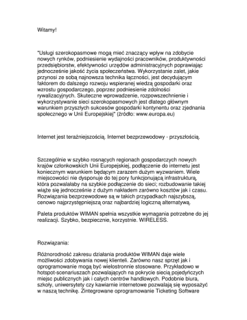 Witamy! "Usługi szerokopasmowe mogą mieć znaczący wpływ na zdobycie nowych rynków, podniesienie wydajności pracowników, produktywności przedsiębiorstw, efektywności urzędów administracyjnych poprawiając jednocześnie jakość życia społeczeństwa. Wykorzystanie zalet, jakie przynosi ze sobą najnowsza technika łączności, jest decydującym faktorem do dalszego rozwoju wspieranej wiedzą gospodarki oraz wzrostu gospodarczego, poprzez podniesienie zdolności rywalizacyjnych. Skuteczne wprowadzenie, rozpowszechnienie i wykorzystywanie sieci szerokopasmowych jest dlatego głównym warunkiem przyszłych sukcesów gospodarki kontynentu oraz zjednania społecznego w Unii Europejskiej" (źródło: www.europa.eu) Internet jest teraźniejszością. Internet bezprzewodowy - przyszłością. Szczególnie w szybko rosnących regionach gospodarczych nowych krajów członkowskich Unii Europejskiej, podłączenie do internetu jest koniecznym warunkiem będącym zarazem dużym wyzwaniem. Wiele miejscowości nie dysponuje do tej pory funkcjonującą infrastrukturą, która pozwalałaby na szybkie podłączenie do sieci; rozbudowanie takiej wiąże się jednocześnie z dużym nakładem zarówno kosztów jak i czasu. Rozwiązania bezprzewodowe są w takich przypadkach najszybszą, cenowo najprzystępniejszą oraz najbardziej logiczną alternatywą. Paleta produktów WIMAN spełnia wszystkie wymagania potrzebne do jej realizacji. Szybko, bezpiecznie, korzystnie. WIRELESS. Rozwiązania: Różnorodność zakresu działania produktów WIMAN daje wiele możliwości zdobywania nowej klienteli. Zarówno nasz sprzęt jak i oprogramowanie mogą być wielostronnie stosowane. Przykładowo w hotspot-scenariuszach pozwalających na pokrycie siecią pojedyńczych miejsc publicznych jak i całych centrów handlowych. Podobnie biura, szkoły, uniwersytety czy kawiarnie internetowe pozwalają się wyposażyć w naszą technikę. Zintegrowane oprogramowanie Ticketing Software umożliwia między innymi sporządzanie Time & Volume czy Black & White listy pozwalającej na czasowe bądź pojemnościowe ograniczenie dostępu do internetu, uzyskane poprzez wydawanie prepaid karty. W ten sposób mogą państwo dowolnie administrować konta użytkowników i klientów. Możliwe jest także wykorzystywanie kamer w systemie, przykładowo do monitorowania drogi produkcyjnej czy recepcji hotelu. Telefonia internetowa? Z produktem WIMAN - żaden problem. Od zastosowania w hotspotach aż do kompleksowych rozwiązań operatorów sieci miejskich, paleta produktów WIMAN jest odpowiedzią na wszystkie pytania w zakresie połączeń bezprzewodowych WIRELESS. WIMAN cieszy się już od dawna powodzeniem u naszych klientów. Sieci takich miast niemieckich jak Heilbronn, Wilhelmshaven czy Altmark; W-Lan oferty grupy bluespot.de spółki Wall AG, zastosowanie w wielu szkołach, realizacja wspólnego projektu zakładu penitencjarnego w Rosdorfie z Cisco Systems Germany, "bitmedia", SMART Technologies czy Fujitsu Siemens - to tylko przykłady ukazujące zakres możliwości zastosowania produktów serii WIMAN. Partnerzy Podejmując wspólną realizację poszczególnych projektów, nawiązaliśmy w chwili obecnej partnerstwo z licznymi przedsiębiorstwami. Począwszy od stworzenia konceptu, poprzez wybór odpowiednich lokacji, konsultacje prawne aż do rozbudowy cayłch sieci - zespół naszych wysokowykwalifikowanych i doświadczonych ekspertów jest w stanie pomóc w każdej istotnej kwestii, zabezpieczając bezproblemowy przebieg realizacji zadania. Oprócz tego ofiarujemy możliwość korzystania z uslug konserwacji i naprawy już po uruchomieniu sieci. Więcej informacji o korzyściach płynących z partnerstwa z WIMAN i możliwościach zdobywania nowych klientów uzyskają państwo po skontaktowaniu sie z nami.