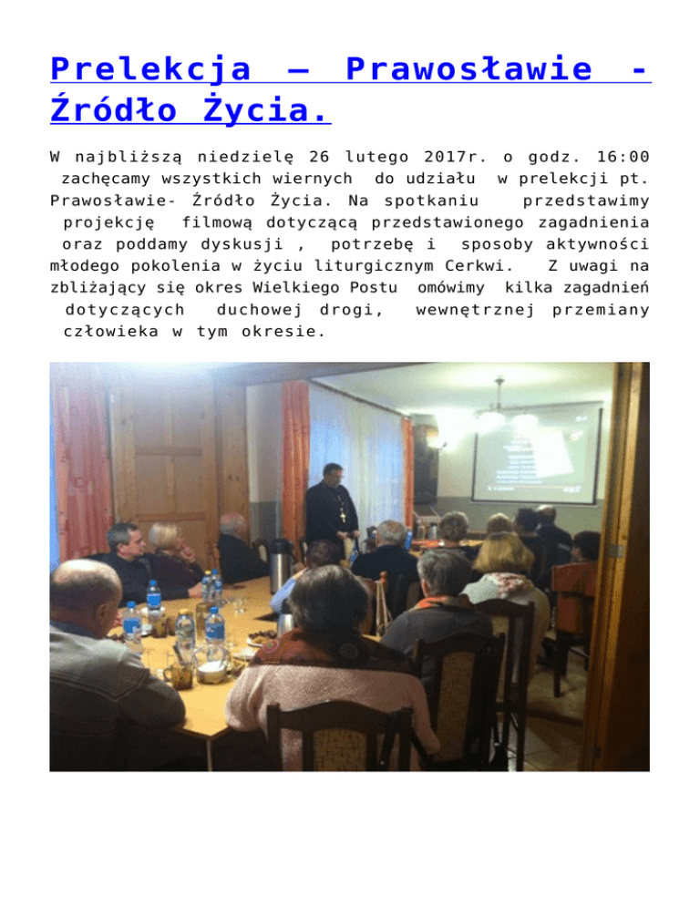 Prelekcja – Prawosławie Źródło Życia. - W najbliższą niedzielę 26 lutego 2017r. o godz. 16:00 zachęcamy wszystkich wiernych do udziału w prelekcji pt. Prawosławie- Źródło Życia. Na spotkaniu przedstawimy projekcję filmową dotyczącą przedstawionego zagadnienia oraz poddamy dyskusji , potrzebę i sposoby aktywności młodego pokolenia w życiu liturgicznym Cerkwi. Z uwagi na zbliżający się okres Wielkiego Postu omówimy kilka zagadnień dotyczących duchowej drogi, wewnętrznej przemiany człowieka w tym okresie.