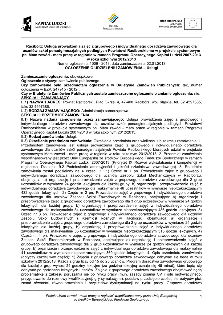 Racibórz: Usługa prowadzenia zajęć z grupowego i indywidualnego doradztwa zawodowego dla uczniów szkół ponadgimnazjalnych podległych Powiatowi Raciborskiemu w projekcie systemowym pn. Mam zawód - mam pracę w regionie w ramach Programu Operacyjnego Kapitał Ludzki 2007-2013 w roku szkolnym 2012/2013 Numer ogłoszenia: 1009 - 2013; data zamieszczenia: 02.01.2013 OGŁOSZENIE O UDZIELENIU ZAMÓWIENIA – Usługi Zamieszczanie ogłoszenia: obowiązkowe. Ogłoszenie dotyczy: zamówienia publicznego. Czy zamówienie było przedmiotem ogłoszenia w Biuletynie Zamówień Publicznych: tak, numer ogłoszenia w BZP: 247915 - 2012r. Czy w Biuletynie Zamówień Publicznych zostało zamieszczone ogłoszenie o zmianie ogłoszenia: nie. SEKCJA I: ZAMAWIAJĄCY I. 1) NAZWA I ADRES: Powiat Raciborski, Plac Okrzei 4, 47-400 Racibórz, woj. śląskie, tel. 32 4597385, faks 32 4597386. I. 2) RODZAJ ZAMAWIAJĄCEGO: Administracja samorządowa. SEKCJA II: PRZEDMIOT ZAMÓWIENIA II.1) Nazwa nadana zamówieniu przez zamawiającego: Usługa prowadzenia zajęć z grupowego i indywidualnego doradztwa zawodowego dla uczniów szkół ponadgimnazjalnych podległych Powiatowi Raciborskiemu w projekcie systemowym pn. Mam zawód - mam pracę w regionie w ramach Programu Operacyjnego Kapitał Ludzki 2007-2013 w roku szkolnym 2012/2013. II.2) Rodzaj zamówienia: Usługi. II.3) Określenie przedmiotu zamówienia: Określenie przedmiotu oraz wielkości lub zakresu zamówienia: 1. Przedmiotem zamówienia jest usługa prowadzenia zajęć z grupowego i indywidualnego doradztwa zawodowego dla uczniów szkół ponadgimnazjalnych Powiatu Raciborskiego biorących udział w projekcie systemowym Mam zawód - mam pracę w regionie w roku szkolnym 2012/2013. 2. Przedmiot zamówienia współfinansowany jest przez Unię Europejską ze środków Europejskiego Funduszu Społecznego w ramach Programu Operacyjnego Kapitał Ludzki 2007-2013 (Priorytet IX Rozwój wykształcenia i kompetencji w regionach, Działanie 9.2 Podniesienie atrakcyjności i jakości szkolnictwa zawodowego). 3. Przedmiot zamówienia został podzielony na 4 części, tj.: 1) Część nr 1 pn. Prowadzenie zajęć z grupowego i indywidulanego doradztwa zawodowego dla uczniów Zespołu Szkół Mechanicznych w Raciborzu, obejmująca: a) organizację i przeprowadzenie zajęć z grupowego doradztwa zawodowego dla 2 grup uczestników w wymiarze 24 godzin lekcyjnych dla każdej grupy, b) organizację i przeprowadzenie zajęć z indywidualnego doradztwa zawodowego dla maksymalnie 48 uczestników w wymiarze nieprzekraczającym 432 godzin lekcyjnych. 2) Część nr 2 pn. Prowadzenie zajęć z grupowego i indywidulanego doradztwa zawodowego dla uczniów Zespołu Szkół Zawodowych w Raciborzu, obejmująca: a) organizację i przeprowadzenie zajęć z grupowego doradztwa zawodowego dla 3 grup uczestników w wymiarze 24 godzin lekcyjnych dla każdej grupy, b) organizację i przeprowadzenie zajęć z indywidualnego doradztwa zawodowego dla maksymalnie 54 uczestników w wymiarze nieprzekraczającym 486 godzin lekcyjnych. 3) Część nr 3 pn. Prowadzenie zajęć z grupowego i indywidulanego doradztwa zawodowego dla uczniów Zespołu Szkół Budowlanych i Rzemiosł Różnych w Raciborzu, obejmująca: a) organizację i przeprowadzenie zajęć z grupowego doradztwa zawodowego dla 2 grup uczestników w wymiarze 24 godzin lekcyjnych dla każdej grupy, b) organizację i przeprowadzenie zajęć z indywidualnego doradztwa zawodowego dla maksymalnie 35 uczestników w wymiarze nieprzekraczającym 315 godzin lekcyjnych. 4) Część nr 4 pn. Prowadzenie zajęć z grupowego i indywidulanego doradztwa zawodowego dla uczniów Zespołu Szkół Ekonomicznych w Raciborzu, obejmująca: a) organizację i przeprowadzenie zajęć z grupowego doradztwa zawodowego dla 2 grup uczestników w wymiarze 24 godzin lekcyjnych dla każdej grupy, b) organizację i przeprowadzenie zajęć z indywidualnego doradztwa zawodowego dla maksymalnie 41 uczestników w wymiarze nieprzekraczającym 369 godzin lekcyjnych. 4. Opis przedmiotu zamówienia (dotyczy każdej w/w części): 1) Zajęcia z grupowego doradztwa zawodowego odbywać się będą w roku szkolnym 2012/2013. Każda z grup liczy od 15 do 25 uczniów. Program doradztwa zawodowego grupowego dla każdej z grup wynosi 24 godziny lekcyjne (za godzinę lekcyjną uznaje się 45 minut), które będą się odbywać po godzinach lekcyjnych uczniów. Zajęcia z grupowego doradztwa zawodowego obejmować będą problematykę z zakresu poruszania się po rynku pracy (m.in. zasady pisania CV i listu motywacyjnego, przygotowanie do rozmowy kwalifikacyjnej, gry symulacyjne), podstaw przedsiębiorczości, stereotypów płci, zasad równości, równouprawnienia i przykładów dyskryminacji na rynku pracy. Grupowe doradztwo ________________________________________________________________________________ Projekt „Mam zawód - mam pracę w regionie” współfinansowany przez Unię Europejską ze środków Europejskiego Funduszu Społecznego 1 zawodowe będzie prowadzone w oparciu o materiały dydaktyczne przekazane przez zamawiającego tj. podręcznik doradcy / konsultanta zawodowego. Do przeprowadzenia zajęć zamawiający zapewni konsultantowi zawodowemu bezpłatnie sale wykładowe znajdujące się w Zespole Szkół wskazanym w opisie zakresu zamówienia (nazwie części zamówienia). Wykonawca pokrywa koszty dojazdu konsultantów do sal wykładowych oraz wszelkie inne koszty związane ze świadczeniem usługi, w tym wydruki materiałów. 2) Zajęcia z indywidualnego doradztwa zawodowego prowadzone przez doradcę zawodowego mają na celu ukierunkowanie ucznia na dalszy rozwój zawodowy oraz opracowanie Indywidualnego Planu Rozwoju Zawodowego. Na podstawie zdiagnozowanych przez doradcę zawodowego potrzeb uczniowie będą kierowani na odpowiednie do swoich predyspozycji, oczekiwań i potrzeb formy wsparcia w ramach projektu Mam zawód - mam pracę w regionie (tj. kursy, zajęcia 