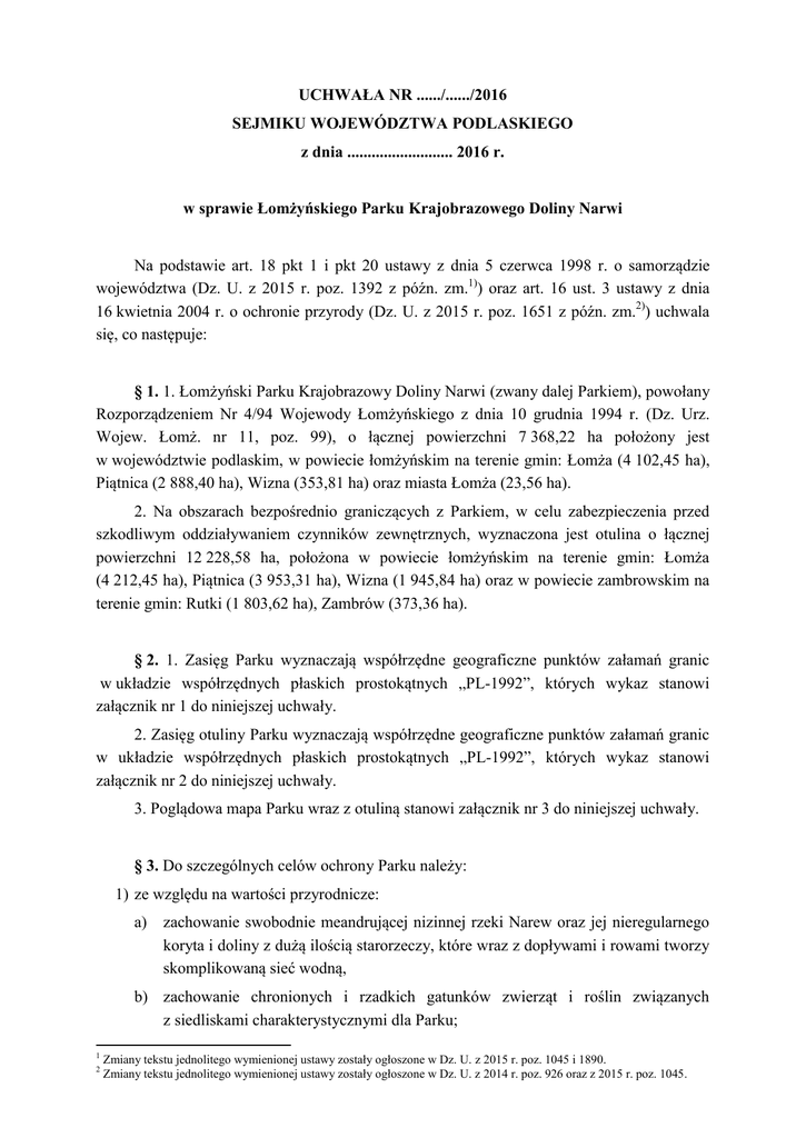 UCHWAŁA NR ....../....../2016 SEJMIKU WOJEWÓDZTWA PODLASKIEGO z dnia .......................... 2016 r. w sprawie Łomżyńskiego Parku Krajobrazowego Doliny Narwi Na podstawie art. 18 pkt 1 i pkt 20 ustawy z dnia 5 czerwca 1998 r. o samorządzie województwa (Dz. U. z 2015 r. poz. 1392 z późn. zm.1)) oraz art. 16 ust. 3 ustawy z dnia 16 kwietnia 2004 r. o ochronie przyrody (Dz. U. z 2015 r. poz. 1651 z późn. zm.2)) uchwala się, co następuje: § 1. 1. Łomżyński Parku Krajobrazowy Doliny Narwi (zwany dalej Parkiem), powołany Rozporządzeniem Nr 4/94 Wojewody Łomżyńskiego z dnia 10 grudnia 1994 r. (Dz. Urz. Wojew. Łomż. nr 11, poz. 99), o łącznej powierzchni 7 368,22 ha położony jest w województwie podlaskim, w powiecie łomżyńskim na terenie gmin: Łomża (4 102,45 ha), Piątnica (2 888,40 ha), Wizna (353,81 ha) oraz miasta Łomża (23,56 ha). 2. Na obszarach bezpośrednio graniczących z Parkiem, w celu zabezpieczenia przed szkodliwym oddziaływaniem czynników zewnętrznych, wyznaczona jest otulina o łącznej powierzchni 12 228,58 ha, położona w powiecie łomżyńskim na terenie gmin: Łomża (4 212,45 ha), Piątnica (3 953,31 ha), Wizna (1 945,84 ha) oraz w powiecie zambrowskim na terenie gmin: Rutki (1 803,62 ha), Zambrów (373,36 ha). § 2. 1. Zasięg Parku wyznaczają współrzędne geograficzne punktów załamań granic w układzie współrzędnych płaskich prostokątnych „PL-1992”, których wykaz stanowi załącznik nr 1 do niniejszej uchwały. 2. Zasięg otuliny Parku wyznaczają współrzędne geograficzne punktów załamań granic w układzie współrzędnych płaskich prostokątnych „PL-1992”, których wykaz stanowi załącznik nr 2 do niniejszej uchwały. 3. Poglądowa mapa Parku wraz z otuliną stanowi załącznik nr 3 do niniejszej uchwały. § 3. Do szczególnych celów ochrony Parku należy: 1) ze względu na wartości przyrodnicze: a) zachowanie swobodnie meandrującej nizinnej rzeki Narew oraz jej nieregularnego koryta i doliny z dużą ilością starorzeczy, które wraz z dopływami i rowami tworzy skomplikowaną sieć wodną, b) zachowanie chronionych i rzadkich gatunków zwierząt i roślin związanych z siedliskami charakterystycznymi dla Parku; 1 2 Zmiany tekstu jednolitego wymienionej ustawy zostały ogłoszone w Dz. U. z 2015 r. poz. 1045 i 1890. Zmiany tekstu jednolitego wymienionej ustawy zostały ogłoszone w Dz. U. z 2014 r. poz. 926 oraz z 2015 r. poz. 1045. 2) ze względu na wartości historyczne i kulturowe: a) ochrona tożsamości kulturowej obszaru, b) ochrona zasobów dziedzictwa kulturowego, c) odtwarzanie i ożywianie lokalnych tradycji; 3) ze względu na walory krajobrazowe: a) zachowanie i ochrona zespołów krajobrazu otwartego, stanowiącego walor wizualny współistnienia gospodarki człowieka z naturalnymi elementami środowiska, b) ochrona wyróżniających się w środowisku wizualnych form geomorfologicznych, c) przywracanie obszarom o krajobrazie niekorzystnie przekształconym potencjalnych walorów krajobrazowych i przyrodniczych, ich d) zachowanie i tworzenie mozaiki krajobrazów. § 4. 1. Na terenie Parku wprowadza się następujące zakazy: 1) umyślnego zabijania dziko występujących zwierząt, niszczenia ich nor, legowisk, innych schronień i miejsc rozrodu oraz tarlisk i złożonej ikry, z wyjątkiem amatorskiego połowu ryb oraz wykonywania czynności w ramach racjonalnej gospodarki rolnej, leśnej, rybackiej i łowieckiej; 2) likwidowania i niszczenia zadrzewień śródpolnych, przydrożnych i nadwodnych, jeżeli nie wynikają z potrzeby ochrony przeciwpowodziowej lub zapewnienia bezpieczeństwa ruchu drogowego lub wodnego lub budowy, odbudowy, utrzymania, remontów lub naprawy urządzeń wodnych; 3) pozyskiwania do celów gospodarczych skał, w tym torfu, oraz skamieniałości, w tym kopalnych szczątków roślin i zwierząt, a także minerałów i bursztynu; 4) wykonywania prac ziemnych trwale zniekształcających rzeźbę terenu, z wyjątkiem prac związanych z zabezpieczeniem przeciwsztormowym, przeciwpowodziowym lub przeciwosuwiskowym lub budową, odbudową, utrzymaniem, remontem lub naprawą urządzeń wodnych; 5) dokonywania zmian stosunków wodnych, jeżeli zmiany te nie służą ochronie przyrody lub racjonalnej gospodarce rolnej, leśnej, wodnej lub rybackiej; 6) likwidowania, zasypywania i przekształcania zbiorników wodnych, starorzeczy oraz obszarów wodno-błotnych; 7) wylewania gnojowicy, z wyjątkiem nawożenia własnych gruntów rolnych; 8) prowadzenia chowu i hodowli zwierząt metodą bezściółkową; 9) utrzymywania otwartych rowów ściekowych i zbiorników ściekowych; 10) organizowania rajdów motorowych i samochodowych. 2. Zakazy, o których mowa w ust. 1 pkt 3 i pkt 4 nie dotyczą części obszaru, na których położone są złoża kopalin: 1) udokumentowane do dnia 31 grudnia 2005 r., których dokumentacje zostały zatwierdzone przez właściwy organ administracji geologicznej; 2) udokumentowane na podstawie koncesji na poszukiwanie i rozpoznawanie, udzielonych do dnia 31 grudnia 2005 r.; 3) udokumentowane na podstawie informacji geologicznych zawartych w dokumentacjach sporządzonych i zatwierdzonych przez właściwy organ administracji geologicznej do dnia 31 grudnia 2005 r. 3. Zakaz określony w ust. 1 pkt 4 nie dotyczy terenu rekreacyjnego położonego w Parku na gruntach wsi Rybno i Pniewo, gm. Łomża, wykorzystywanego jako zjazdowe trasy narciarskie. 4. Zakaz, o którym mowa w ust. 1 pkt 8 nie dotyczy gospodarstw położonych w Parku, w których wprowadzono chów i hodowlę zwierząt metodą bezściółkową przed dniem 9 lutego 2011 r. § 5. Z dniem wejścia w życie niniejszej uchwały tracą moc: 1) Rozporządzenie Nr 31/02 Wojewody Podlaskiego z 15 października 2002 r. (Dz. Urz. Woj. Podl. nr 53, poz. 1170), 2) Rozporządzenie Nr 3/06 Wojewody Podlaskiego z 23 maja 2006 r. (Dz. Urz. Woj. Podl. nr 152, poz. 1406), 3) Uchwała Nr III/19/11 Sejmiku Województw