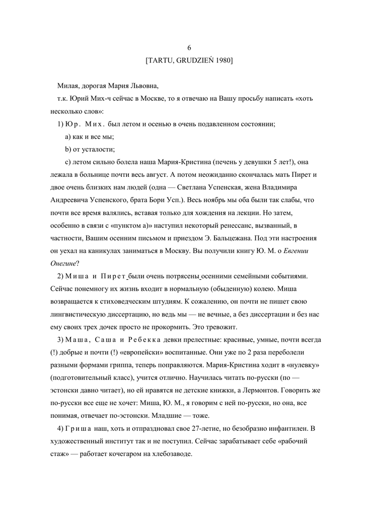 6 [TARTU, GRUDZIEŃ 1980] Милая, дорогая Мария Львовна, т.к. Юрий Мих-ч сейчас в Москве, то я отвечаю на Вашу просьбу написать «хоть несколько слов»: 1) Ю р . М и х . был летом и осенью в очень подавленном состоянии; а) как и все мы; b) от усталости; с) летом сильно болела наша Мария-Кристина (печень у девушки 5 лет!), она лежала в больнице почти весь август. А потом неожиданно скончалась мать Пирет и двое очень близких нам людей (одна — Светлана Успенская, жена Владимира Андреевича Успенского, брата Бори Усп.). Весь ноябрь мы оба были так слабы, что почти все время валялись, вставая только для хождения на лекции. Но затем, особенно в связи с «пунктом а)» наступил некоторый ренессанс, вызванный, в частности, Вашим осенним письмом и приездом Э. Бальцежана. Под эти настроения он уехал на каникулах заниматься в Москву. Вы получили книгу Ю. М. о Евгении Онегине? 2) М и ш а и П и р е т были очень потрясены осенними семейными событиями. Сейчас понемногу их жизнь входит в нормальную (обыденную) колею. Миша возвращается к стиховедческим штудиям. К сожалению, он почти не пишет свою лингвистическую диссертацию, но ведь мы — не вечные, а без диссертации и без нас ему своих трех дочек просто не прокормить. Это тревожит. 3) М а ш а , С а ш а и Р е б е к к а девки прелестные: красивые, умные, почти всегда (!) добрые и почти (!) «европейски» воспитанные. Они уже по 2 раза переболели разными формами гриппа, теперь поправляются. Мария-Кристина ходит в «нулевку» (подготовительный класс), учится отлично. Научилась читать по-русски (по — эстонски давно читает), но ей нравятся не детские книжки, а Лермонтов. Говорить же по-русски все еще не хочет: Миша, Ю. М., я говорим с ней по-русски, но она, все понимая, отвечает по-эстонски. Младшие — тоже. 4) Г р и ш а наш, хоть и отпраздновал свое 27-летие, но безобразно инфантилен. В художественный институт так и не поступил. Сейчас зарабатывает себе «рабочий стаж» — работает кочегаром на хлебозаводе. 5) А л е ш а и его жена К а я учатся на III курсе биологического факультета. У них очаровательная дочь Сильвия, моя главная домашняя радость (4 мес.). 6) Я — как все, так и я.... Получили ли Вы в прошлом году наш 3-ий Блоковский сборник: я его Вам высылала. Скоро выйдет 4-ый — тоже, конечно, сразу пришлю. Очень обрадовалась, что Ваш „Festschrift” скоро выходит: все мы писали статьи в нем с особой любовью. Это любовь к Вам. Когда он выходит? Вот и написала Вам «несколько слов», даже больше, наверно, чем Вы хотели. Всего, всего, всего Вам (и всем!) самого хорошего. Успешной работы. Все же (хоть это логически и трудно определимо) наша работа, видимо, кому-то нужна. Спасибо за прелестную рождественскую открытку. Обнимаю Вас. Ваша Зара [S t e m p e l :] Тарту, [data nieczytelna]. Rkp Arch. IBL PAN, k. 1 i koperta. — List napisany w 1980 r., o czym świadczą zawarte tu przywołania: pięcioletnia Maria-Krystyna, ur. 1974, przyjazd E. Balcerzana (zob. widokówka J. Łotmana z 25 X 1980, nr 22), książka J. Łotmana o Eugeniuszu Onieginie (wyd. 1980, przesłana z jego listem z 20 IX 1980, nr 20), 27lecie syna Grigorija, ur. 1953, oraz jubileusz Mayenowej w 1980 r. Nie znamy dokładnej daty urodzenia 4miesięcznej Sylwii oraz daty ferii, w czasie których Łotman pojechał pracować w Moskwie — co pozwoliłoby dokładniej datować list. W tej sprawie są dwie przesłanki: Minc pisze: „cały listopad oboje byliśmy tak słabi” oraz że dziękuje Mayenowej za kartkę bożonarodzeniową, która prawdopodobnie nadeszła nie wcześniej niż w grudniu. List napisany zatem w grudniu 1980 r., miejsce wynika z kontekstu. Przekład polski Najmilsza, droga Mario Lwowna, ponieważ Jurij Mich-cz jest teraz w Moskwie, ja odpowiadam na Pani prośbę, by napisać „choć parę słów”: 1) J u r . M i c h - c z . latem i jesienią był bardzo przygnębiony; a) jak my wszyscy; b) ze zmęczenia; c) latem bardzo chorowała nasza Marija-Kristina (wątroba u dziewcz