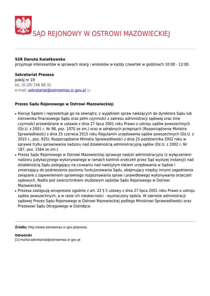 SĄD REJONOWY W OSTROWI MAZOWIECKIEJ SSR Danuta Kwiatkowska przyjmuje interesantów w sprawach skarg i wniosków w każdy czwartek w godzinach 10:00 - 12:00. Sekretariat Prezesa pokój nr 19 tel. (0-29) 746 89 31 e-mail: [email protected] [1] Prezes Sądu Rejonowego w Ostrowi Mazowieckiej: ● ● ● Kieruje Sądem i reprezentuje go na zewnątrz, z wyjątkiem spraw należących do dyrektora Sądu lub kierownika finansowego Sądu oraz pełni czynności z zakresu administracji sądowej oraz inne czynności przewidziane w ustawie z dnia 27 lipca 2001 roku Prawo o ustroju sądów powszechnych (Dz.U. z 2001 r. Nr 98, poz. 1070 ze zm.) oraz w odrębnych przepisach [Rozporządzenie Ministra Sprawiedliwości z dnia 25 czerwca 2015 roku Regulamin urzędowania sądów powszechnych (Dz.U. z 2015 r., poz. 925); Rozporządzenie Ministra Sprawiedliwości z dnia 25 października 2002 roku w sprawie trybu sprawowania nadzoru nad działalnością administracyjną sądów (Dz.U. z 2002 r. Nr 187, poz. 1564 ze zm.). Prezes Sądu Rejonowego w Ostrowi Mazowieckiej sprawuje nadzór administracyjny (z wyłączeniem nadzoru judykacyjnego wykonywanego w ramach kontroli orzeczeń przez Sąd wyższej instancji) nad działalnością Sądu polegający na czuwaniu nad należytym tokiem urzędowania w Sądzie i zmierzający do podniesienia poziomu funkcjonowania Sądu, obejmujący między innymi zagadnienia związane z zapewnieniem sprawnego rozpoznawania spraw i prawidłowego wykonywania orzeczeń sądowych. Nadto jest zwierzchnikiem służbowym sędziów Sądu Rejonowego w Ostrowi Mazowieckiej. Prezesa zastępują wiceprezesi zgodnie z art. 22 § 5 ustawy z dnia 27 lipca 2001 roku Prawo o ustroju sądów powszechnych, a w razie ich nieobecności - wyznaczony sędzia. W zakresie administracji sądowej Prezes Sądu Rejonowego w Ostrowi Mazowieckiej podlega Ministrowi Sprawiedliwości oraz Prezesowi Sądu Okręgowego w Ostrołęce. Źródło: http://www.ostrowmaz.sr.gov.pl/prezes Odnośniki [1] mailto:[email protected]