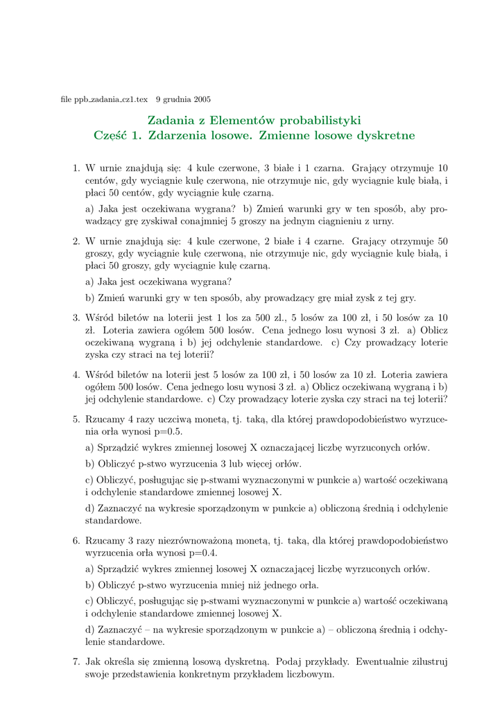 file ppb zadania cz1.tex 9 grudnia 2005 Zadania z Elementów probabilistyki Cześć 1. Zdarzenia losowe. Zmienne losowe dyskretne , 1. W urnie znajduja, sie: otrzymuje 10 , , 4 kule czerwone, 3 biaÃle i 1 czarna. Grajacy centów, gdy wyciagnie kule, czerwona,, nie otrzymuje nic, gdy wyciagnie kule, biaÃla,, i , , pÃlaci 50 centów, gdy wyciagnie kule, czarna., , a) Jaka jest oczekiwana wygrana? b) Zmień warunki gry w ten sposób, aby prowadzacy gre, zyskiwaÃl conajmniej 5 groszy na jednym ciagnieniu z urny. , , 2. W urnie znajduja, sie: otrzymuje 50 , , 4 kule czerwone, 2 biaÃle i 4 czarne. Grajacy groszy, gdy wyciagnie kule, czerwona,, nie otrzymuje nic, gdy wyciagnie kule, biaÃla,, i , , pÃlaci 50 groszy, gdy wyciagnie kul e czarn a. , , , a) Jaka jest oczekiwana wygrana? b) Zmień warunki gry w ten sposób, aby prowadzacy gre, miaÃl zysk z tej gry. , 3. Wśród biletów na loterii jest 1 los za 500 zl., 5 losów za 100 zÃl, i 50 losów za 10 zÃl. Loteria zawiera ogóÃlem 500 losów. Cena jednego losu wynosi 3 zÃl. a) Oblicz oczekiwana, wygrana, i b) jej odchylenie standardowe. c) Czy prowadzacy loterie , zyska czy straci na tej loterii? 4. Wśród biletów na loterii jest 5 losów za 100 zÃl, i 50 losów za 10 zÃl. Loteria zawiera ogóÃlem 500 losów. Cena jednego losu wynosi 3 zÃl. a) Oblicz oczekiwana, wygrana, i b) jej odchylenie standardowe. c) Czy prowadzacy loterie zyska czy straci na tej loterii? , 5. Rzucamy 4 razy uczciwa, moneta,, tj. taka,, dla której prawdopodobieństwo wyrzucenia orÃla wynosi p=0.5. a) Sprzadzić wykres zmiennej losowej X oznaczajacej liczbe, wyrzuconych orÃlów. , , b) Obliczyć p-stwo wyrzucenia 3 lub wiecej orÃlów. , c) Obliczyć, posÃlugujac , sie, p-stwami wyznaczonymi w punkcie a) wartość oczekiwana, i odchylenie standardowe zmiennej losowej X. d) Zaznaczyć na wykresie sporzadzonym w punkcie a) obliczona, średnia, i odchylenie , standardowe. 6. Rzucamy 3 razy niezrównoważona, moneta,, tj. taka,, dla której prawdopodobieństwo wyrzucenia orÃla wynosi p=0.4. a) Sprzadzić wykres zmiennej losowej X oznaczajacej liczbe, wyrzuconych orÃlów. , , b) Obliczyć p-stwo wyrzucenia mniej niż jednego orÃla. c) Obliczyć, posÃlugujac , sie, p-stwami wyznaczonymi w punkcie a) wartość oczekiwana, i odchylenie standardowe zmiennej losowej X. d) Zaznaczyć – na wykresie sporzadzonym w punkcie a) – obliczona, średnia, i odchy, lenie standardowe. 7. Jak określa sie, zmienna, losowa, dyskretna., Podaj przykÃlady. Ewentualnie zilustruj swoje przedstawienia konkretnym przykÃladem liczbowym. 8. Podaj definicje, wartości oczekiwanej i odchylenia standardowego dla zmiennej losowej dyskretnej. Przedstaw obliczenia tych wskaźników na wybranym przykÃladzie. 9. Na egzamin przygotowano 30 pytań. Student nauczyÃl sie, odpowiedzi tylko na 20 pytań. Na egzaminie losuje sie, 3 pytania. Jakie jest prawdopodobieństwo, że student wylosuje takie trzy pytania, na które zna odpowiedzi. Wyjaśnij, co w tym zadaniu przyjmujesz za zmienna, losowa, i jaki ma ona rozkÃlad. 10. Co to jest rozkÃlad dwumianowy (znany równieź pod nazwa:, rozkÃlad binomialny lub rozkÃlad Bernoulliego). Jakiemu modelowi doświadczenia odpowiada ten rozkÃlad. Wyprowadź wzór dla wybranych parametrów. 11. Jak określa sie, prawdopodobieństwo dla zdarzenia losowego. Podaj przykÃlady. 12. Model rozkÃladu dwumianowego zakÃlada, że liczymy liczbe, ’sukcesów’ w serii n niezależnych doświadczeń, przy czym w każdym doświadczeniu może wystapić ’sukces’ , z prawdopodobieństwem p, gdzie 0 < p < 1. a) Jaka jest wartość oczekiwana liczby sukcesów w rozważanym rozkÃladzie. b)Jakim znanym rozkÃladem można przybliżać rozkÃlad dwumianowy, jeżeli n jest duże, a p umiarkowane, np. zawarte w przedziale 0.1 < p < 0.9 c) Czy potrafisz powiedzieć, jak stosować to przybliżenie i podać przykÃlad liczbowy? 13. Prawdopodobieństwo, że przeprowadzony eksperyment, np. określony rodzaj terapii, powiedzie sie, , jest równe p = 0.6. a) Jakie jest prawdopodobieństwo, że przy dwukrotnym niezależnym powtórzeniu tego eksperymentu otrzymany conajmniej jeden udany wynik. b) Ile razy należy powtórzyć eksperyment, aby prawdopodobieństwo chociażby jednego udanego wyniku wynosiÃlo conajmniej P = 0.9 14. W zakladzie opracowano nowy produkt. Jest on wart (można go sprzedać) za 1000$. Wylansowanie i wprowadzenie na rynek produktu kosztuje 1500$. Produkt wprowadzony na rynek może a) odnieść duży sukces – z p-stwem =.2, b) odnieść umiarkowany sukces – z p-stwem 0.5 c) nie spotkać sie, z źadnym zainteresowaniem – z p-stwem 0.3. Ocena zysków: w przypadku a): 10000 $, w przypadku b): 4000 $, w przypadku c): –6000 $. Jaki jest oczekiwany zysk? Czy zaklad powinien wprowadzać swój produkt na rynek, czy też sprzedać go? Bed , , ac dyrektorem zakÃladu, jaka, podjaÃ,lbyś decyzje? , A być moźe, przed podjeciem ostatecznej decyzji, wolaÃlbyś przeprowadzić dodatkowe , badania rynkowe. Te jednak też kosztuja,, i kalkulacja skomplikowaÃla by sie, ... 2 15. Zmienna losowa X przyjmuje tylko dwie wartości: 0, z prawdopodobieństwem 1 − p, oraz 1, z prawdopodobieństwem p. Jakie wartości może przyjmować parametr p? (dlaczego). Oblicz wartość oczekiwana, i odchylenie standardowe zmiennej losowej X. 16. Rzucamy 100 razy wyważona, moneta., Niech X oznacza liczbe, wyrzuconych orÃlów. Oblicz (ewtl. napisz tylko formuÃle) , prawdopodobieństwo P (X < 41). Uzasadnij swój sposób obliczania. 17. Liczba bÃledów popeÃlnianych przez studentów kursu jez. angielskiego przy dyktandzie , , pewnego testu opisuje sie, rozkÃladem Poissona z parametrem λ = 5.01 . Jakie jest prawdopodobieństwo, że osoba piszaca dyktando a) nie popeÃlni żadnego , bÃledu, b) popeÃlni 10 bÃledów lub wiecej, c) popeÃlni dokÃladnie 4 lub 5 bÃledów? , , , , Możesz skorzystać z wartości rozkÃladu Poissona podanymi w tabelkach poniżej (tabelki