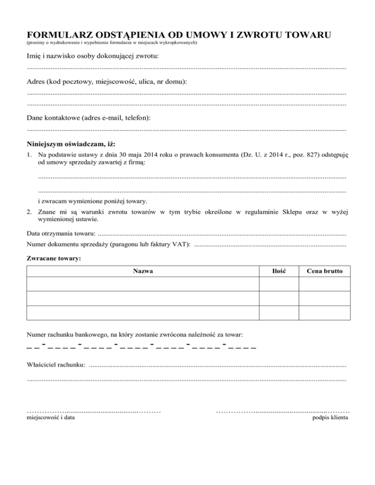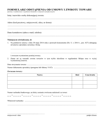 FORMULARZ ODSTĄPIENIA OD UMOWY I ZWROTU TOWARU (prosimy o wydrukowanie i wypełnienie formularza w miejscach wykropkowanych) Imię i nazwisko osoby dokonującej zwrotu: ................................................................................................................................................................................ Adres (kod pocztowy, miejscowość, ulica, nr domu): ................................................................................................................................................................................ ................................................................................................................................................................................ Dane kontaktowe (adres e-mail, telefon): ................................................................................................................................................................................ Niniejszym oświadczam, iż: 1. Na podstawie ustawy z dnia 30 maja 2014 roku o prawach konsumenta (Dz. U. z 2014 r., poz. 827) odstępuję od umowy sprzedaży zawartej z firmą: .......................................................................................................................................................................... .......................................................................................................................................................................... i zwracam wymienione poniżej towary. 2. Znane mi są warunki zwrotu towarów w tym trybie określone w regulaminie Sklepu oraz w wyżej wymienionej ustawie. Data otrzymania towaru: ......................................................................................................................................... Numer dokumentu sprzedaży (paragonu lub faktury VAT): .................................................................................... Zwracane towary: Nazwa Ilość Cena brutto Numer rachunku bankowego, na który zostanie zwrócona należność za towar: __-____-____-____-____-____-____ Właściciel rachunku: .............................................................................................................................................. ................................................................................................................................................................................ …………….......................................……… miejscowość i data …………….......................................……… podpis klienta