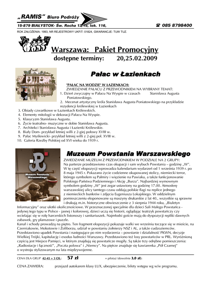 „RAMIS” Biuro Podróży 085 8798400 15-879 BIAŁYSTOK- Św. Rocha 13/15, lok. 116, ROK ZAŁOŻENIA: 1993, NR REJESTROWY UKFiT: 01824, GWARANCJE: TUW TUZ. Warszawa: Pakiet Promocyjny dostępne terminy: 20,25.02.2009 Pałac w Łazienkach "PAŁAC NA WODZIE" W ŁAZIENKACH: ZWIEDZANIE PAŁACU Z PRZEWODNIKIEM NA WYBRANY TEMAT: 1. Dzień zwyczajny w Pałacu Na Wyspie w czasach Stanisława Augusta Poniatowskiego. 2. Mecenat artystyczny króla Stanisława Augusta Poniatowskiego na przykładzie rezydencji królewskiej w Łazienkach 3. Obiady czwartkowe w Łazienkach Królewskich. 4. Elementy mitologii w dekoracji Pałacu Na Wyspie. 5. Klasycyzm Stanisława Augusta. 6. Życie teatralno- muzyczne w dobie Stanisława Augusta. 7. Architekci Stanisława Augusta i Łazienki Królewskie. 8. Biały Dom- przykład letniej willi z 2-giej połowy XVIII w. 9. Pałac Myślewicki- przykład letniej willi z 2-giej poł. XVIII w. 10. Galeria Rzeźby Polskiej od XVI wieku do 1939 r. Muzeum Powstania Warszawskiego ZWIEDZANIE MUZEUM Z PRZEWODNIKIEM W PODZIALE NA 2 GRUPY: Na parterze przedstawiono czas okupacji i sam wybuch Powstania – godzinę „W”. W tę część ekspozycji wprowadza kalendarium wydarzeń od 1 września 1939 r. po 8 maja 1945 r. Pokazano życie codzienne okupowanej stolicy, niemiecki terror, którego symbolem są Palmiry i więzienie na Pawiaku, a także funkcjonowanie Polskiego Państwa Podziemnego i Akcję „Burza”. Najbardziej wymownym symbolem godziny „W” jest zegar ustawiony na godzinę 17.00. Atmosferę warszawskiej ulicy tamtego czasu oddają polskie flagi na replice jednego z niemieckich bunkrów i zdjęcia Eugeniusza Lokajskiego. W oddzielnym pomieszczeniu eksponowane są maszyny drukarskie z lat 40., wszystkie są sprawne i drukują m.in. historyczne obwieszczenie z 3 sierpnia 1944 roku, „Biuletyn Informacyjny” oraz ulotki okolicznościowe. W przeznaczonej specjalnie dla dzieci Sali Małego Powstańca jedynej tego typu w Polsce - jasnej i kolorowej, dzieci uczą się historii, oglądając teatrzyk powstańczy czy wcielając się w rolę harcerskich listonoszy i sanitariuszek. Najmłodsi goście mają do dyspozycji repliki dawnych zabawek, gry planszowe i puzzle. Kanał i schody prowadzą na piętro. Ten fragment ekspozycji pokazuje walki we wrześniu toczące się w mieście, na Czerniakowie, Mokotowie i Żoliborzu, udział w powstaniu żołnierzy NSZ i AL, a także cudzoziemców. Przedstawiono upadek Powstania i następujące po nim wydarzenia – powstanie i działalność PKWN, decyzje Wielkiej Trójki, kapitulację i exodus ludności Warszawy. Przedstawiono też losy powstańców w PRL. Wyróżnioną częścią jest Miejsce Pamięci, w którym znajdują się powstańcze mogiły. Są także trzy odrębne pomieszczenia: „Radiostacje i łączność”, „Poczta polowa” i „Niemcy”. Na piętrze znajduje się kawiarenka „Pół Czarnej” o wystroju stylizowanym na lata międzywojenne. CENA DLA GRUP 42-45 + 3 OS.: CENA ZAWIERA: 57 zł + pilotaż (dowolnie 3,0 zł): przejazd autokarem klasy LUX, ubezpieczenie, bilety wstępu wg w/w programu.