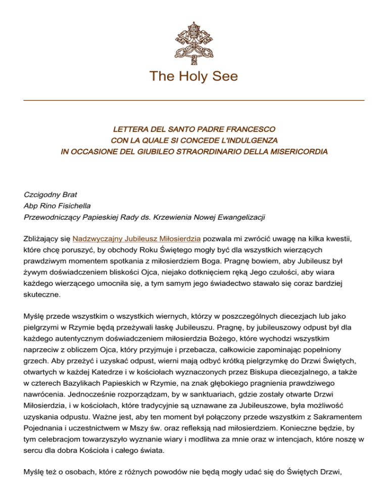 The Holy See LETTERA DEL SANTO PADRE FRANCESCO CON LA QUALE SI CONCEDE L'INDULGENZA IN OCCASIONE DEL GIUBILEO STRAORDINARIO DELLA MISERICORDIA Czcigodny Brat Abp Rino Fisichella Przewodniczący Papieskiej Rady ds. Krzewienia Nowej Ewangelizacji Zbliżający się Nadzwyczajny Jubileusz Miłosierdzia pozwala mi zwrócić uwagę na kilka kwestii, które chcę poruszyć, by obchody Roku Świętego mogły być dla wszystkich wierzących prawdziwym momentem spotkania z miłosierdziem Boga. Pragnę bowiem, aby Jubileusz był żywym doświadczeniem bliskości Ojca, niejako dotknięciem ręką Jego czułości, aby wiara każdego wierzącego umocniła się, a tym samym jego świadectwo stawało się coraz bardziej skuteczne. Myślę przede wszystkim o wszystkich wiernych, którzy w poszczególnych diecezjach lub jako pielgrzymi w Rzymie będą przeżywali łaskę Jubileuszu. Pragnę, by jubileuszowy odpust był dla każdego autentycznym doświadczeniem miłosierdzia Bożego, które wychodzi wszystkim naprzeciw z obliczem Ojca, który przyjmuje i przebacza, całkowicie zapominając popełniony grzech. Aby przeżyć i uzyskać odpust, wierni mają odbyć krótką pielgrzymkę do Drzwi Świętych, otwartych w każdej Katedrze i w kościołach wyznaczonych przez Biskupa diecezjalnego, a także w czterech Bazylikach Papieskich w Rzymie, na znak głębokiego pragnienia prawdziwego nawrócenia. Jednocześnie rozporządzam, by w sanktuariach, gdzie zostały otwarte Drzwi Miłosierdzia, i w kościołach, które tradycyjnie są uznawane za Jubileuszowe, była możliwość uzyskania odpustu. Ważne jest, aby ten moment był połączony przede wszystkim z Sakramentem Pojednania i uczestnictwem w Mszy św. oraz refleksją nad miłosierdziem. Konieczne będzie, by tym celebracjom towarzyszyło wyznanie wiary i modlitwa za mnie oraz w intencjach, które noszę w sercu dla dobra Kościoła i całego świata. Myślę też o osobach, które z różnych powodów nie będą mogły udać się do Świętych Drzwi, 2 przede wszystkim o ludziach chorych, starszych i samotnych, którzy często nie są w stanie wyjść z domu. Dla nich będzie wielką pomocą przeżywanie choroby i cierpienia jako doświadczenia bliskości z Panem, który w tajemnicy swojej męki, śmierci i zmartwychwstania wskazuje główną drogę pozwalającą nadać sens bólowi i samotności. Przeżywanie z wiarą i radosną nadzieją tego momentu próby, poprzez przyjęcie komunii św. lub uczestniczenie w Mszy św. i w modlitwie wspólnotowej, również za pośrednictwem różnych środków przekazu, będzie dla nich sposobem uzyskania jubileuszowego odpustu. Myślę też o więźniach, którzy doświadczają ograniczenia wolności. Jubileusz zawsze stanowił okazję do wielkiej amnestii, obejmującej bardzo wiele osób, które choć zasługują na karę, uświadomiły sobie jednak, że to, co uczyniły, było niesprawiedliwe, i szczerze pragną na nowo włączyć się w życie społeczeństwa, wnosząc w nie swój uczciwy wkład. Niech do nich wszystkich dotrze w konkretny sposób miłosierdzie Ojca, który chce być blisko ludzi najbardziej potrzebujących Jego przebaczenia. W kaplicach więziennych będą oni mogli uzyskać odpust, a kiedy będą przechodzili przez drzwi swojej celi, kierując myśli i modlitwę do Ojca, niech za każdym razem ten gest oznacza dla nich przejście przez Drzwi Święte, ponieważ miłosierdzie Boże, które potrafi przemienić serca, jest również w stanie przeobrazić kraty w doświadczenie wolności. Prosiłem, by Kościół odkrył w tym czasie jubileuszowym bogactwo zawarte w uczynkach miłosierdzia co do ciała i duszy. Doświadczenie miłosierdzia staje się bowiem widzialne w świadectwie konkretnych znaków, jak uczył nas sam Jezus. Za każdym razem, kiedy wierny sam wykona jeden lub kilka z tych uczynków, z pewnością otrzyma jubileuszowy odpust. Wiąże się z tym zaangażowanie w życie miłosierdziem, aby otrzymać łaskę pełnego i głębokiego przebaczenia mocą miłości Ojca, który nikogo nie wyklucza. Będzie to więc pełny odpust jubileuszowy, owoc samego wydarzenia, które jest celebrowane i przeżywane z wiarą, nadzieją i miłością. Jubileuszowy odpust można będzie uzyskać również dla zmarłych. Jesteśmy z nimi związani świadectwem wiary i miłości, które nam zostawili. Tak jak pamiętamy o nich podczas Mszy św., tak też możemy, w wielkiej tajemnicy świętych obcowania, modlić się za nich, aby miłosierne oblicze Ojca uwolniło ich od wszelkich pozostałości winy i by mógł On przygarnąć ich do siebie w nieskończonej szczęśliwości. Jednym z poważnych problemów naszych czasów jest z pewnością zmodyfikowany stosunek do życia. Bardzo rozpowszechniona mentalność doprowadziła do utraty należytej wrażliwości indywidualnej i społecznej na kwestię przyjmowania nowego życia. Dramat aborcji przeżywany jest przez niektóre osoby ze świadomością powierzchowną, jakby niemal nie zdawały sobie sprawy z tego, jak wielkim złem jest ten akt. Wiele innych natomiast, choć przeżywa ten moment jako porażkę, uważa, że nie mają innej drogi. Myślę w szczególności o wszystkich kobietach, które poddały się aborcji. Dobrze znam uwarunkowania, które doprowadziły je do podjęcia tej decyzji. Wiem, że jest to dramat egzystencjalny i moralny. Spotkałem wiele kobiet, które nosiły w sercu blizny pozostawione przez ten ciężki i bolesny wybór. To, co się wydarzyło, jest głęboko 3 niesłuszne; jednakże tylko wtedy, gdy zrozumie się to w prawdzie, można nie stracić nadziei. Przebaczenia Bożego nie można odmówić nikomu, kto żałuje, zwłaszcza jeśli ze szczerym sercem przystępuje do Sakramentu Spowiedzi, by pojednać się z Ojcem. Również z tego powodu postanowiłem, mimo wszelkich przeciwnych rozporządzeń, upoważnić wszystkich kapłanów w Roku Jubileuszowym do rozgrzeszenia z grzechu aborcji osób, które jej dokonały, żałują t