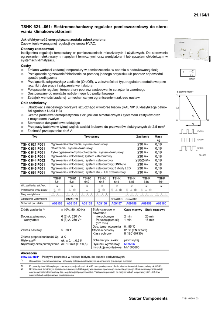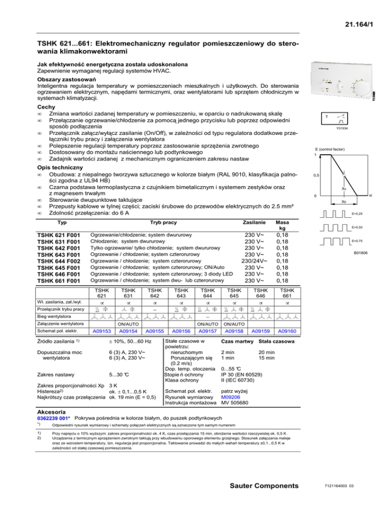 21.164/1 TSHK 621...661: Elektromechaniczny regulator pomieszczeniowy do sterowania klimakonwektorami Jak efektywność energetyczna została udoskonalona Zapewnienie wymaganej regulacji systemów HVAC. Obszary zastosowań Inteligentna regulacja temperatury w pomieszczeniach mieszkalnych i uŜytkowych. Do sterowania ogrzewaniem elektrycznym, napędami termicznymi, oraz wentylatorami lub sprzętem chłodniczym w systemach klimatyzacji. Cechy • Zmiana wartości zadanej temperatury w pomieszczeniu, w oparciu o nadrukowaną skalę • Przełączanie ogrzewanie/chłodzenie za pomocą jednego przycisku lub poprzez odpowiedni sposób podłączenia • Przełącznik załącz/wyłącz zasilanie (On/Off), w zaleŜności od typu regulatora dodatkowe przełączniki trybu pracy i załączenia wentylatora • Polepszenie regulacji temperatury poprzez zastosowanie sprzęŜenia zwrotnego • Dostosowany do montaŜu naściennego lub podtynkowego • Zadajnik wartości zadanej z mechanicznym ograniczeniem zakresu nastaw Opis techniczny • Obudowa: z niepalnego tworzywa sztucznego w kolorze białym (RAL 9010, klasyfikacja palności zgodna z UL94 HB) • Czarna podstawa termoplastyczna z czujnikiem bimetalicznym i systemem zestyków oraz z magnesem trwałym • Sterowanie dwupunktowe taktujące • Przepusty kablowe w tylnej części; zaciski śrubowe do przewodów elektrycznych do 2.5 mm² • Zdolność przełączenia: do 6 A Typ Tryb pracy TSHK 621 F001 TSHK 631 F001 TSHK 642 F001 TSHK 643 F001 TSHK 644 F002 TSHK 645 F001 TSHK 646 F001 TSHK 661 F001 Wł. zasilania, zał./wył. Zasilanie Ogrzewanie/chłodzenie; system dwururowy Chłodzenie; system dwururowy Tylko ogrzewanie/ tylko chłodzenie; system dwururowy Ogrzewanie / chłodzenie; system czterorurowy Ogrzewanie / chłodzenie; system czterorurowy Ogrzewanie / chłodzenie; system czterorurowy; ON/Auto Ogrzewanie / chłodzenie; system czterorurowy; 3 diody LED Ogrzewanie / chłodzenie; system dwu- lub czterorurowy TSHK 621 TSHK 631 • • 0,18 0,18 0,18 0,18 0,18 0,18 0,18 0,18 TSHK 642 TSHK 643 TSHK 644 TSHK 645 TSHK 646 TSHK 661 • • • • • • A09159 A09160 − Przełącznik trybu pracy Y01934 E (control factor) 1 0,5 Xs xi 0 Xp E=0,25 E=0,50 E=0,75 B01806 − Bieg wentylatora Załączenie wentylatora Schemat poł. elektr. Źródło zasilania 230 V~ 230 V~ 230 V~ 230 V~ 230/24V~ 230 V~ 230 V~ 230 V~ Masa kg T 1) ON/AUTO A09153 A09154 A09155 ± 10%, 50...60 Hz Dopuszczalna moc wentylatora 6 (3) A, 230 V~ 6 (3) A, 230 V~ Zakres nastawy 5...30 °C Zakres proporcjonalności Xp 3 K Histereza2) ok. ± 0,1...0,5 K Najkrótszy czas przełączenia ok. 19 min (E = 0,5) A09156 ON/AUTO ON/AUTO A09157 A09158 Stałe czasowe w powietrzu: nieruchomym Poruszającym się (0.2 m/s) Dop. temp. otoczenia Stopie ń ochrony Klasa ochrony Czas martwy Stała czasowa 2 min 1 min 20 min 15 min 0...55 °C IP 30 (EN 60529) II (IEC 60730) Schemat poł. elektr. patrz wyŜej Rysunek wymiarowy M09206 Instrukcja montaŜowa MV 505680 Akcesoria 0362239 001* Pokrywa pośrednia w kolorze białym, do puszek podtynkowych *) Odpowiedni rysunek wymiarowy i schematy połączeń elektrycznych są oznaczone tym samym numerem 1) 2) Przy napięciu o 10% wyŜszym: zakres proporcjonalności ok. 4 K, czas przełączania 15 min, obniŜenie wartości rzeczywistej ok. 0,5 K . Urządzenia z termicznym sprzęŜeniem zwrotnym taktują przy wbudowaniu oporowego elementu grzejnego. Stosunek załączania maleje oraz ze wzrostem temperatury, tzn. regulacja jest proporcjonalna. Taktowanie prowadzi do małych wahań temperatury ±0,1...0,5 K w zaleŜności od stałej czasowej pomieszczenia. Sauter Components 7121164003 03 21.164/2 TSHK Działanie Układ bimetali zatrzaskowych wydłuŜa się pod wpływem temperatury i uruchamia styki wspomagane magnesem gwarantując trwały styk przy bardzo wolnych zmianach temperatury. SprzęŜenie zwrotne od temperatury Bimetal połączony jest z oporowym elementem grzejnym. Spadek temperatury powoduje zadziałanie termostatu i elementu grzejnego. Skutkuje to równieŜ przełączaniem termostatu nawet gdy temperatura w pomieszczeniu nieznacznie zmienia się. Stosunek załączania (czas ogrzewania do czasu trwania cyklu) maleje wraz ze wzrostem temperatury w pomieszczeniu, tzn. regulacja proporcjonalna. Taktowanie prowadzi do małych wahań temperatury ±0,1... 0,5 K w zaleŜności od stałej czasowej pomieszczenia. Legenda XS Wartość zadana tE Czas trwania załączenia Xp Zakres proporcjonalności tA Czas trwania wyłączenia XSd Histereza załączenia SP Okres przełączenia (tE + tA) TR Temperatura w pomieszczeniu E Stosunek załączenia (tE/SP) OS US Górny punkt załączenia Dolny punkt załączenia a b funkcja termicznego sprzęŜenia zwrotnego temperatura bimetalu Uwagi techniczne i montaŜowe Podana tolerancja napięcia jest konieczna, poniewaŜ zaleŜy od tego moc oporowego elementu grzejnego. Napięcie wyŜsze o 10% powoduje: podwyŜszenie mocy o 20%, zwiększenie zakresu proporcjonalności z 3 K do 4 K, skrócenie czasu przełączania z 19 min do 15 min, obniŜenie temperatury w pomieszczeniu o 0,5K. PołoŜenie montaŜowe: poziomo na ścianie. Unikać przeciągów i promieniowania słonecznego. Wysokość montaŜu: ok. 1,5 m. Mechaniczny ogranicznik nastawnika wartości zadanej umoŜliwia indywidualną korekcję, zapobiega marnowaniu energii poprzez ekstremalne nastawy. Schematy połączeń elektrycznych TSHK 621/ 643 ON 30 T RF TSHK 621 °C 25 OFF 20 N 15 10 3 9 7 I 5 8 II 6 11 10 III B09194 N L A09153 Sauter Components 7121164003 03 TSHK 21.164/3 TSHK 631 T RF TSHK 631 ON/AUTO ON ON 30 °C 25 AUTO OFF 20 N 15 10 0 4 1 2 I 5 3 II 6 5 III B09195 N L A09154 TSHK 642 30 T RF TSHK 642 °C 25 OFF ON 20 N 1 5 6 3 15 4 I 10 10 9 2 II 1 6 1 6 III 5 B09196 N N N L A09155 RF ON 30 T TSHK 643 TSHK 621/ 643 °C 25 N OFF 20 6 1 2 4 I 5 II 3 III 15 10 5 B09194 N L A09156 Sauter Components 7121164003 03 21.164/4 TSHK T RF RF TSHK 644 TSHK 644 ON/AUTO ON 30 AUTO °C 