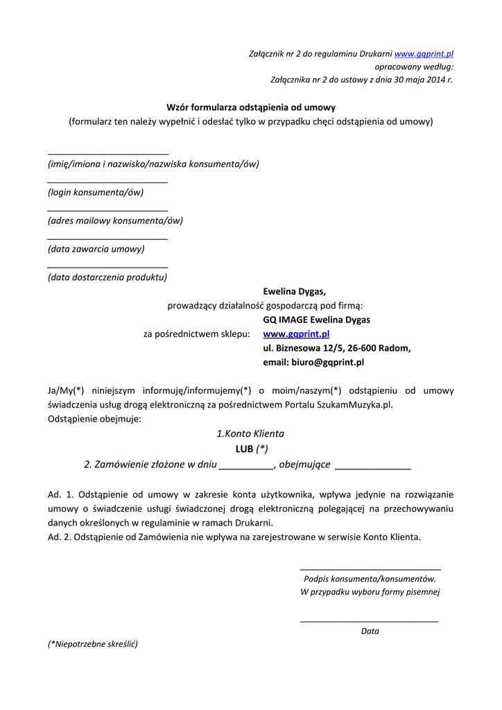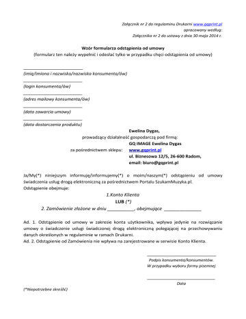 Załącznik nr 2 do regulaminu Drukarni www.gqprint.pl opracowany według: Załącznika nr 2 do ustawy z dnia 30 maja 2014 r. Wzór formularza odstąpienia od umowy (formularz ten należy wypełnić i odesłać tylko w przypadku chęci odstąpienia od umowy) ________________________ (imię/imiona i nazwisko/nazwiska konsumenta/ów) ________________________ (login konsumenta/ów) ________________________ (adres mailowy konsumenta/ów) ________________________ (data zawarcia umowy) ________________________ (data dostarczenia produktu) Ewelina Dygas, prowadzący działalność gospodarczą pod firmą: GQ IMAGE Ewelina Dygas za pośrednictwem sklepu: www.gqprint.pl ul. Biznesowa 12/5, 26-600 Radom, email: [email protected] Ja/My(*) niniejszym informuję/informujemy(*) o moim/naszym(*) odstąpieniu od umowy świadczenia usług drogą elektroniczną za pośrednictwem Portalu SzukamMuzyka.pl. Odstąpienie obejmuje: 1.Konto Klienta LUB (*) 2. Zamówienie złożone w dniu __________, obejmujące ______________ Ad. 1. Odstąpienie od umowy w zakresie konta użytkownika, wpływa jedynie na rozwiązanie umowy o świadczenie usługi świadczonej drogą elektroniczną polegającej na przechowywaniu danych określonych w regulaminie w ramach Drukarni. Ad. 2. Odstąpienie od Zamówienia nie wpływa na zarejestrowane w serwisie Konto Klienta. ____________________________ Podpis konsumenta/konsumentów. W przypadku wyboru formy pisemnej ______________________________ Data (*Niepotrzebne skreślić)