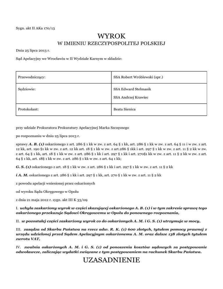 Sygn. akt II AKa 170/13 WYROK W IMIENIU RZECZYPOSPOLITEJ POLSKIEJ Dnia 25 lipca 2013 r. Sąd Apelacyjny we Wrocławiu w II Wydziale Karnym w składzie: Przewodniczący: SSA Robert Wróblewski (spr.) Sędziowie: SSA Edward Stelmasik SSA Andrzej Krawiec Protokolant: Beata Sienica przy udziale Prokuratora Prokuratury Apelacyjnej Marka Szczęsnego po rozpoznaniu w dniu 25 lipca 2013 r. sprawy A. B. (1) oskarżonego z art. 286 § 1 kk w zw. z art. 64 § 1 kk, art. 286 § 1 kk w zw. z art. 64 § 11 i w zw. z art. 12 kk, art. 190 §1 kk w zw. z art. 12 kk art. 18 § 1 kk w zw. z art.286 § 1kk i art. 297 § 1 kk w zw. z art. 11 § 2 kk w zw. z art. 64 § 1 kk, art. 18 § 1 kk w zw. z art. 286 § 1 kk i art. 297 § 1 kk i art. 270§1 kk w zw. z art. 11 § 2 kk w zw. z art. 64 § 1 kk, art. 18§ 1 kk w zw. z art. 286 § 1 kk w zw. z art. 64 1 kk; G. S. (1) oskarżonego z art. 18 § 1 kk w zw. z art. 286 § 1 kk i art. 297 § 1 kk w zw. z art. 11 § 2 kk i A. M. oskarżonego z art. 286 § 1 kk i art. 297 § 1 kk, art. 270 § 1 kk w zw. z art. 11 § 2 kk z powodu apelacji wniesionej przez oskarżonych od wyroku Sądu Okręgowego w Opolu z dnia 21 maja 2012 r. sygn. akt III K 33/09 I. uchyla zaskarżony wyrok w części skazującej oskarżonego A. B. (1) i w tym zakresie sprawę tego oskarżonego przekazuje Sądowi Okręgowemu w Opolu do ponownego rozpoznania, II. w pozostałej części zaskarżony wyrok co do oskarżonych A. M. i G. S. (1) utrzymuje w mocy, III. zasądza od Skarbu Państwa na rzecz adw. R. K. (1) 600 złotych, tytułem pomocy prawnej z urzędu udzielonej przed Sądem Apelacyjnym oskarżonemu A. M. oraz dalsze 138 złotych tytułem zwrotu VAT, IV. zwalnia oskarżonych A. M. i G. S. (1) od ponoszenia kosztów sądowych za postępowanie odwoławcze, zaliczając wydatki związane z tym postępowaniem na rachunek Skarbu Państwa. UZASADNIENIE A. B. (1) został oskarżony o to, że: I w dniu 21 stycznia 2005r. w N. woj. (...) w celu osiągnięcia korzyści majątkowej doprowadził K. Ż. do niekorzystnego rozporządzenia mieniem w postaci samochodu osobowego marki A. (...) nr VIN (...) nr rej. (...) (...) w ten sposób , że nie mając zamiaru wywiązanie się ze zobowiązania zawarł z nim jako przedstawiciel firmy (...) we W. umowę komisu nr (...) na sprzedaż w/w pojazdu po czym samochód ten sprzedał za kwotę 6000 zł, przywłaszczając sobie niniejszą kwotę , czym działał na szkodę K. Ż. przy czym czynu tego dopuścił się w warunkach powrotu do przestępstwa będąc uprzednio skazanym wyrokiem łącznym Sądu Rejonowego w Kłodzku II Wydziału Karnego, sygn. akt II K 179/04 z dnia 21 maja 2004r. obejmującego wyroki: - Sądu Rejonowego w Kłodzku z dnia 18 czerwca 2001 sygn. akt II K 526/01 za przestępstwo z art. 286 § 1kk popełnione 25 listopada 2000r. na karę 1 roku pozbawienia wolności ; - Sądu Rejonowego w Wałbrzychu z dnia 19 marca 2002 r. sygn. akt II K 780/01 za przestępstwo z art. 286§1kk popełnione 22.01.2001 r. na karę 1 roku pozbawienia wolności w zawieszeniu na 2 lata; - Sądu Rejonowego w Świdnicy z dnia 7 sierpnia 2002 r. sygn. akt II K 793/01 za przestępstwo z art. 286§1kk popełnione w dniu 28.09.2000r. na karę pozbawienia wolności w zawieszeniu na 3 lata; - Sądu Rejonowego w Wałbrzychu z dnia 25 listopada 2002r. sygn. akt II K 597/02 za przestępstwo z art. 286 § 1kk popełnione 9 stycznia 2001 r. na karę 1 roku pozbawienia wolności; - Sądu Rejonowego w Kłodzku z dnia 13 grudnia 2002 sygn. akt II K 1150/01 za przestępstwo z art. 286§1kk popełnione 29 listopada 2000r. na karę 1 roku pozbawienia wolności w zawieszeniu na 3 lata; - Sądu Rejonowego dla Wrocławia Krzyki z dnia 16 listopada 1999r. sygn. akt II K 22/97 za czyn z art. 215 § 1kk popełniony w listopadzie 1991r. na karę 8 miesięcy pozbawienia wolności; - Sądu Rejonowego dla Wrocławia Śródmieścia z dnia 26 marca 2002 r. sygn. akt VK 435/00 za przestępstwo z art. 286§1kk popełnione w okresie od 13 lipca 1995r. do 22 grudnia 1997r. na karę 2 lat i 6 miesięcy pozbawienia wolności; - Sądu Rejonowego dla Wrocławia Śródmieścia z dnia 26 marca 2002 sygn. akt VK 874/99 za przestępstwo z art. 286§1kk i 270§1kk popełnione w okresie od 8 listopada 1997 r. do 2 kwietnia 1998r. na karę 2 lat pozbawienia wolności; na karę 1 roku i 3 miesięcy pozbawienia wolności , którą odbył w okresie od 01 marca 2002r. do 14 czerwca 2002r. i od 20 stycznia 2003r. do 07 października 2003r. na karę łączną 3 lat i 7 miesięcy pozbawienia wolności , którą odbył w okresie od 20 lipca 1997r. do 14 sierpnia 1997r. , od 14 czerwca 2002 do 20 stycznia 2003, od 8 kwietnia 1997 r. do 26 czerwca 1997r, od 26 marca 2001r. do 1 marca 2002r., od 7 października 2003r. do 21 maja 2004r. i od 7 czerwca 1999r. do 24 marca 2000r. tj. o czyn z art. 286§1kk w zw. z art. 64§1kk II w okresie od 28 kwietnia do 16 czerwca 2005r. w W. i W., działając w warunkach czynu ciągłego w wykonaniu z góry powziętego zamiaru w celu osiągnięciu korzyści majątkowej będąc kierownikiem komisu (...) Sp. zoo doprowadził pięciu klientów komisu do niekorzystnego rozporządzenia mieniem w łącznej kwocie nie mniejszej niż 53.300zł w ten sposób iż nie mając zamiaru wywiązania się ze zobowiązań zawierał z nimi umowy komisowe na sprzedaż samochodów osobowych, po czym samochody te sprzedawał osobom trzecim przywłaszczając dla siebie uzyskaną z ich sprzedaży kwotę pieniędzy a w tym: - w dniu 28 kwietnia 2005r. we W. doprowadził H. K. do niekorzystnego rozporządzenia mieniem w postaci samochodu m-ki F. (...) o nr rej. (...) wartości 11.500 zł w ten sposób, że zawarł z nim umowę komisu (...) na sprzedaż w/w pojazdu, po czym samochód ten sprzedał przywłaszczając sobie uzyskaną kwotę, czym działał na szkodę H. K. - w dniu 2 czerwca 2005r. we W. doprowadził W. G. do niekorzystnego rozporządzenia mieniem w postaci samochodu m-ki L. (...) o nr rej. (...), wa
