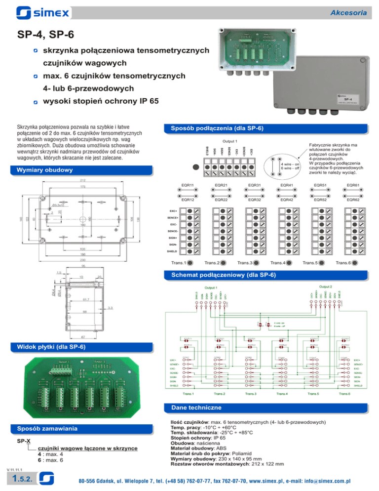 Akcesoria SP-4, SP-6 skrzynka połączeniowa tensometrycznych czujników wagowych max. 6 czujników tensometrycznych 4- lub 6-przewodowych wysoki stopień ochrony IP 65 Sposób podłączenia (dla SP-6) Output 1 EXC+ EXC- SENCE+ SENCE- SIGN- SIGN+ SHIELD Skrzynka połączeniowa pozwala na szybkie i łatwe połączenie od 2 do max. 6 czujników tensometrycznych w układach wagowych wieloczujnikowych np. wag zbiornikowych. Duża obudowa umożliwia schowanie wewnątrz skrzynki nadmiaru przewodów od czujników wagowych, których skracanie nie jest zalecane. 4 wire - on 6 wire - off Wymiary obudowy Fabrycznie skrzynka ma wlutowane zworki do połączeń czujników 4-przewodowych. W przypadku podłączenia czujników 6-przewodowych zworki te należy wyciąć. EQR11 EQR21 EQR31 EQR41 EQR51 EQR61 EQR12 EQR22 EQR32 EQR42 EQR52 EQR62 EXC+ SENCE+ EXCSENCESIGN+ SIGNSHIELD Trans.1 Trans.2 Trans.3 Trans.4 Trans.5 Trans.6 Schemat podłączeniowy (dla SP-6) Widok płytki (dla SP-6) Dane techniczne Sposób zamawiania SP-X czujniki wagowe łączone w skrzynce 4 : max. 4 6 : max. 6 Ilość czujników: max. 6 tensometrycznych (4- lub 6-przewodowych) Temp. pracy: -10°C ÷ +60°C Temp. składowania: -25°C ÷ +85°C Stopień ochrony: IP 65 Obudowa: naścienna Materiał obudowy: ABS Materiał śrub do pokryw: Poliamid Wymiary obudowy: 230 x 140 x 95 mm Rozstaw otworów montażowych: 212 x 122 mm V.11.11.1 1.5.2. 80-556 Gdańsk, ul. Wielopole 7, tel. (+48 58) 762-07-77, fax 762-07-70, www.simex.pl, e-mail: [email protected]