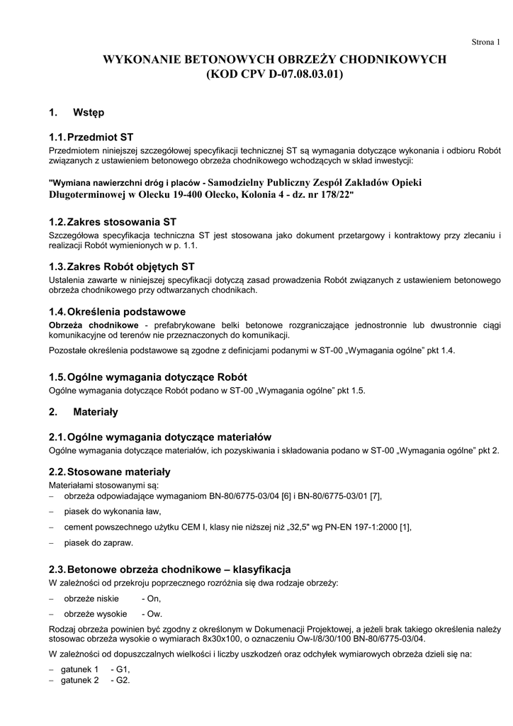 Strona 1 WYKONANIE BETONOWYCH OBRZEŻY CHODNIKOWYCH (KOD CPV D-07.08.03.01) 1. Wstęp 1.1. Przedmiot ST Przedmiotem niniejszej szczegółowej specyfikacji technicznej ST są wymagania dotyczące wykonania i odbioru Robót związanych z ustawieniem betonowego obrzeża chodnikowego wchodzących w skład inwestycji: "Wymiana nawierzchni dróg i placów - Samodzielny Publiczny Zespół Zakładów Opieki Długoterminowej w Olecku 19-400 Olecko, Kolonia 4 - dz. nr 178/22" 1.2. Zakres stosowania ST Szczegółowa specyfikacja techniczna ST jest stosowana jako dokument przetargowy i kontraktowy przy zlecaniu i realizacji Robót wymienionych w p. 1.1. 1.3. Zakres Robót objętych ST Ustalenia zawarte w niniejszej specyfikacji dotyczą zasad prowadzenia Robót związanych z ustawieniem betonowego obrzeża chodnikowego przy odtwarzanych chodnikach. 1.4. Określenia podstawowe Obrzeża chodnikowe - prefabrykowane belki betonowe rozgraniczające jednostronnie lub dwustronnie ciągi komunikacyjne od terenów nie przeznaczonych do komunikacji. Pozostałe określenia podstawowe są zgodne z definicjami podanymi w ST-00 „Wymagania ogólne” pkt 1.4. 1.5. Ogólne wymagania dotyczące Robót Ogólne wymagania dotyczące Robót podano w ST-00 „Wymagania ogólne” pkt 1.5. 2. Materiały 2.1. Ogólne wymagania dotyczące materiałów Ogólne wymagania dotyczące materiałów, ich pozyskiwania i składowania podano w ST-00 „Wymagania ogólne” pkt 2. 2.2. Stosowane materiały Materiałami stosowanymi są: − obrzeża odpowiadające wymaganiom BN-80/6775-03/04 [6] i BN-80/6775-03/01 [7], − piasek do wykonania ław, − cement powszechnego użytku CEM I, klasy nie niższej niż „32,5" wg PN-EN 197-1:2000 [1], − piasek do zapraw. 2.3. Betonowe obrzeża chodnikowe – klasyfikacja W zależności od przekroju poprzecznego rozróżnia się dwa rodzaje obrzeży: − obrzeże niskie - On, − obrzeże wysokie - Ow. Rodzaj obrzeża powinien być zgodny z określonym w Dokumenacji Projektowej, a jeżeli brak takiego określenia należy stosowac obrzeża wysokie o wymiarach 8x30x100, o oznaczeniu Ow-I/8/30/100 BN-80/6775-03/04. W zależności od dopuszczalnych wielkości i liczby uszkodzeń oraz odchyłek wymiarowych obrzeża dzieli się na: − gatunek 1 − gatunek 2 - G1, - G2. Strona 2 Należy stosować obrzeża betonowe gatunku 1 (G1) 2.4. Betonowe obrzeża chodnikowe – wymagania techniczne 2.4.1 Wymiary betonowych obrzeży chodnikowych Kształt obrzeży betonowych przedstawiono na rysunku 1, a wymiary podano w tablicy 1. Rysunek 1. Kształt betonowego obrzeża chodnikowego Tablica 1. Wymiary obrzeży Rodzaj Wymiary obrzeży, cm obrzeża On Ow 2.4.2 1 b h r 75 6 20 3 100 6 20 3 75 8 30 3 90 8 24 3 100 8 30 3 Dopuszczalne odchyłki wymiarów obrzeży Dopuszczalne odchyłki wymiarów dla obrzeży gatunku 1 wynoszą: − długość: − wysokość i grubość: 2.4.3 ±8mm, ±3 mm. Dopuszczalne wady i uszkodzenia obrzeży Powierzchnie obrzeży powinny być bez rys, pęknięć i ubytków betonu, o fakturze z formy lub zatartej. Krawędzie elementów powinny być równe i proste. Dopuszczalne wady oraz uszkodzenia powierzchni i krawędzi elementów nie powinny przekraczać wartości podanych w tabeli 1. Tabela 1. Dopuszczalne wady i uszkodzenia obrzeży Dopuszczalna wielkość Rodzaj wad i uszkodzeń wad i uszkodzeń Gatunek 1 Wklęsłość lub wypukłość powierzchni i krawędzi w mm Szczerby ograniczających powierzchnie górne i uszkodzenia (ścieralne) krawędzi i naroży Ograniczających pozostałe powierzchnie: 2 niedopuszczalne Liczba, max 2 Długość, mm, max 20 Głębokość, mm, max 6 Strona 3 2.4.4 Składowanie Betonowe obrzeża chodnikowe mogą być przechowywane na składowiskach otwartych, posegregowane według rodzajów i gatunków. Betonowe obrzeża chodnikowe należy układać z zastosowaniem podkładek i przekładek drewnianych o wymiarach co najmniej: grubość 2,5 cm, szerokość 5 cm, długość minimum 5 cm większa niż szerokość obrzeża. 2.4.5 Beton i jego składniki Do produkcji obrzeży należy stosować beton klasy C25/30 według PN-EN 206-1:2003 [2]. 2.5. Materiały na ławę i do zaprawy Na ławę należy stosować kruszywo drobne (piasek), które powinno odpowiadać wymaganiom PN-EN 13043:2004 [3]. Materiały do zaprawy cementowo-piaskowej powinny odpowiadać wymaganiom podanym w ST D-08.01.01 "Krawężniki betonowe" pkt 2. 3. Sprzęt 3.1. Ogólne wymagania dotyczące sprzętu Ogólne wymagania dotyczące sprzętu podano w ST-00 „Wymagania ogólne” pkt 3. 3.2. Sprzęt do ustawiania obrzeży Roboty wykonuje się ręcznie przy zastosowaniu drobnego sprzętu pomocniczego. 4. Transport 4.1. Ogólne wymagania dotyczące transportu Ogólne wymagania dotyczące transportu podano w ST-00 „Wymagania ogólne” pkt 4. 4.2. Transport obrzeży betonowych Betonowe obrzeża chodnikowe mogą być przewożone dowolnymi środkami transportu po osiągnięciu przez beton wytrzymałości minimum 0,7 wytrzymałości projektowanej. Obrzeża powinny być zabezpieczone przed przemieszczeniem się i uszkodzeniami w czasie transportu. 4.3. Transport pozostałych materiałów Transport pozostałych materiałów podano w ST D-07.08.01.01 "Krawężniki betonowe". 5. Wykonanie Robót 5.1. Ogólne zasady wykonania Robót Ogólne zasady wykonania Robót podano w ST-00 „Wymagania ogólne” pkt 5. 5.2. Wykonanie koryta Koryto pod ławę należy wykonywać zgodnie z PN-B-06050 [4]. Wymiary wykopu powinny odpowiadać wymiarom ławy w planie z uwzględnieniem w szerokości dna wykopu ew. konstrukcji szalunku. 5.3. Ława Podłoże pod ustawienie obrzeża stanowi ława z piasku, o grubości warstwy 3cm po zagęszczeniu. Ławę wykonuje się przez zasypanie koryta piaskiem i zagęszczenie z polewaniem wodą. 5.4. Ustawienie betonowych obrzeży chodnikowych Betonowe obrzeża chodnikowe należy ustawiać na wykonanej ławie w miejscu i ze światłem (odległością górnej powierzchni obrzeża od ciągu